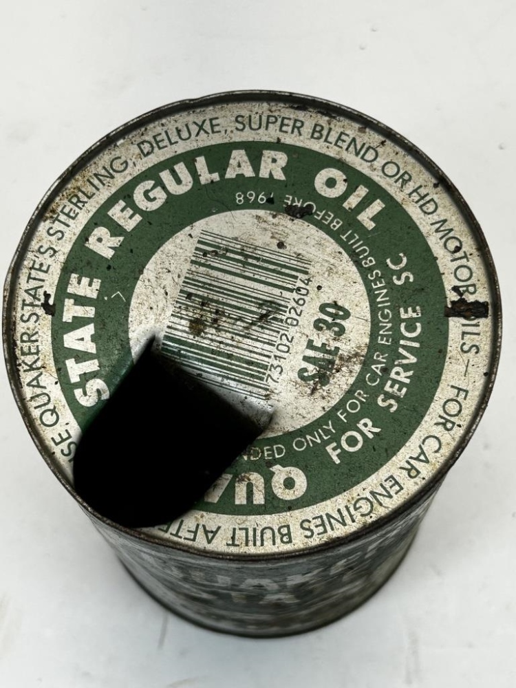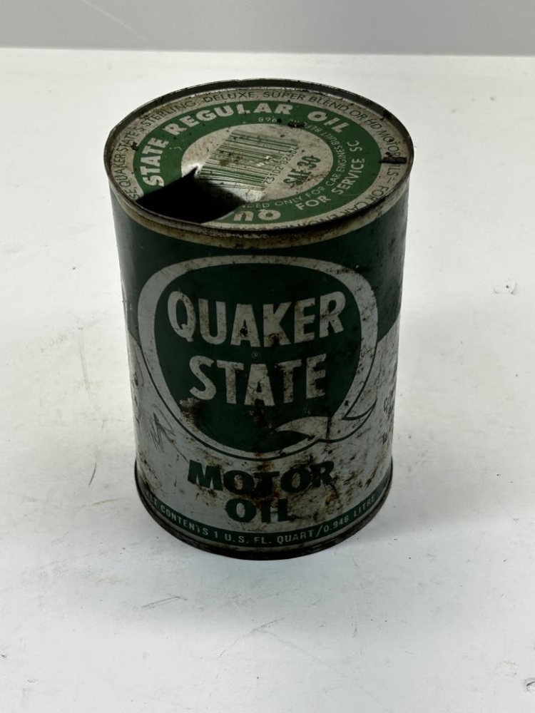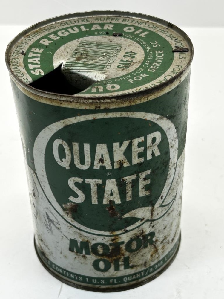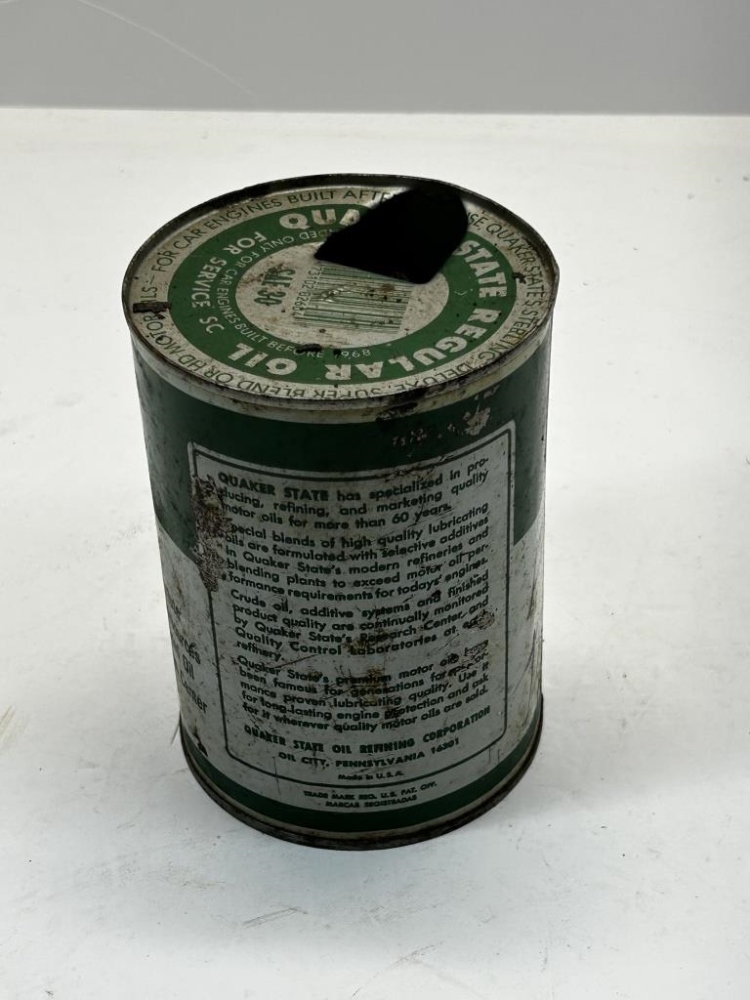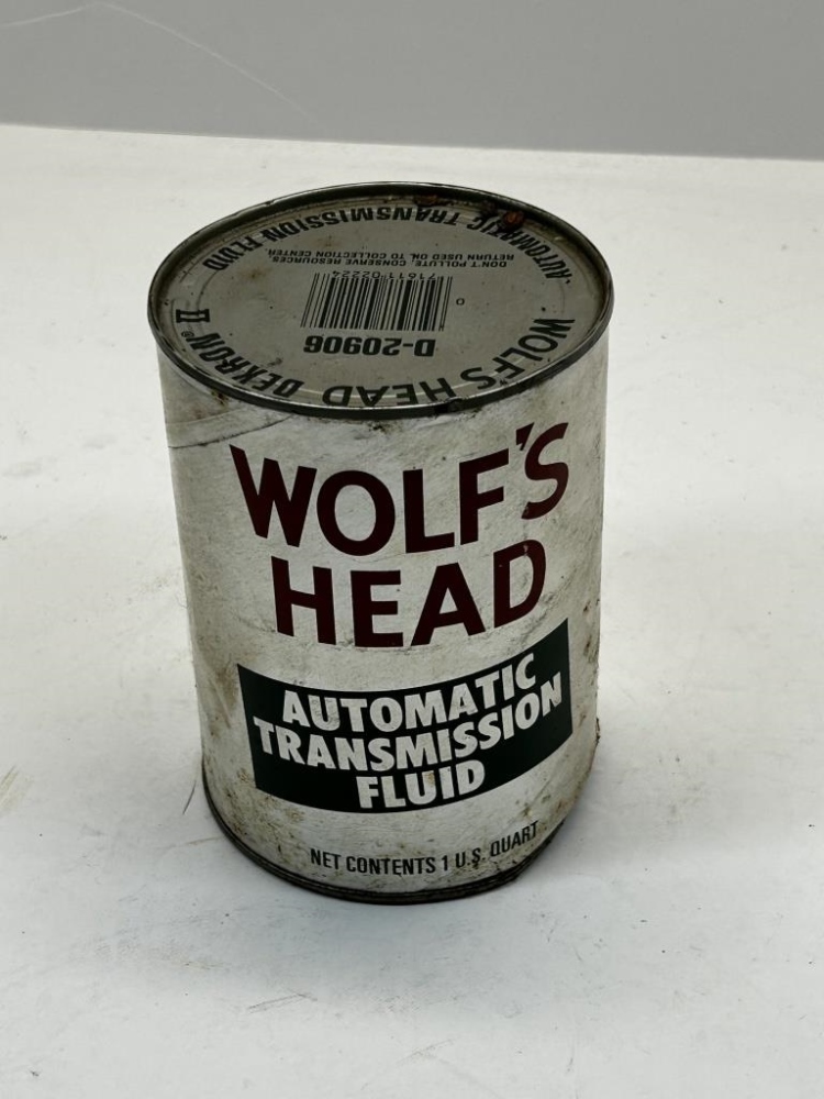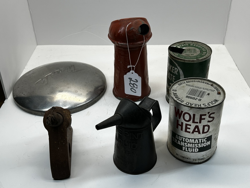 ANTIQUE GAS CAN, QUAKER STATE MOTOR OIL TIN, WOLF’S HEAD TRANSMISSION FLUID TIN, VINTGE NASH HUB CAP