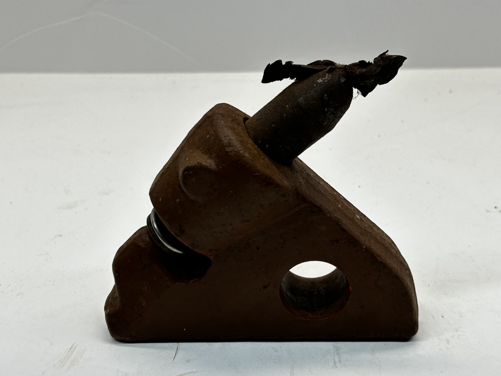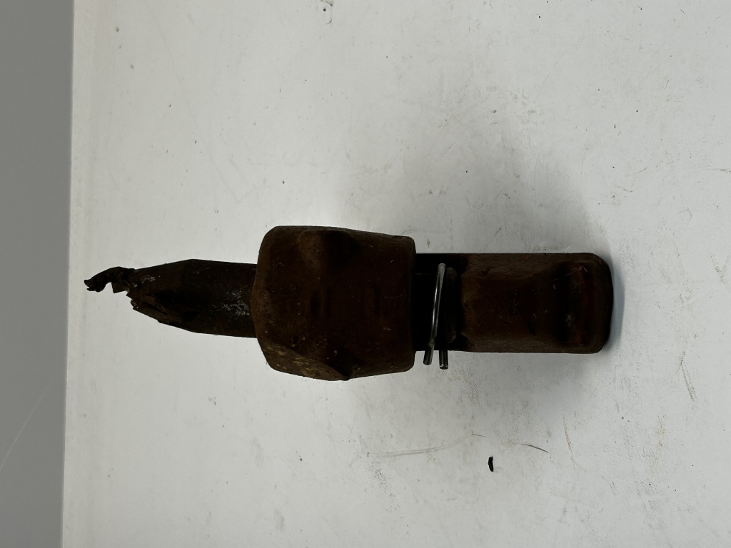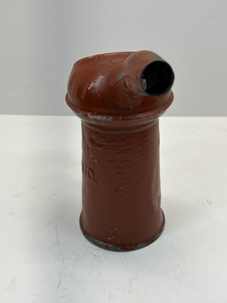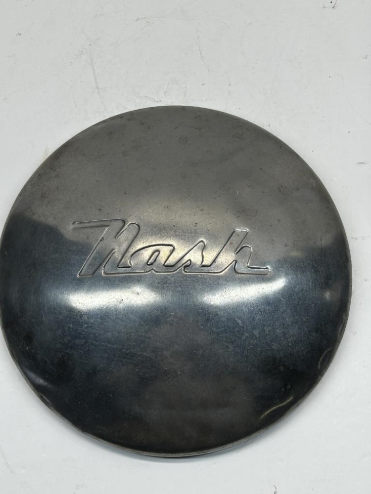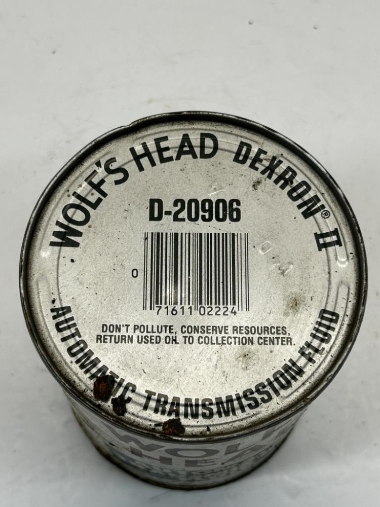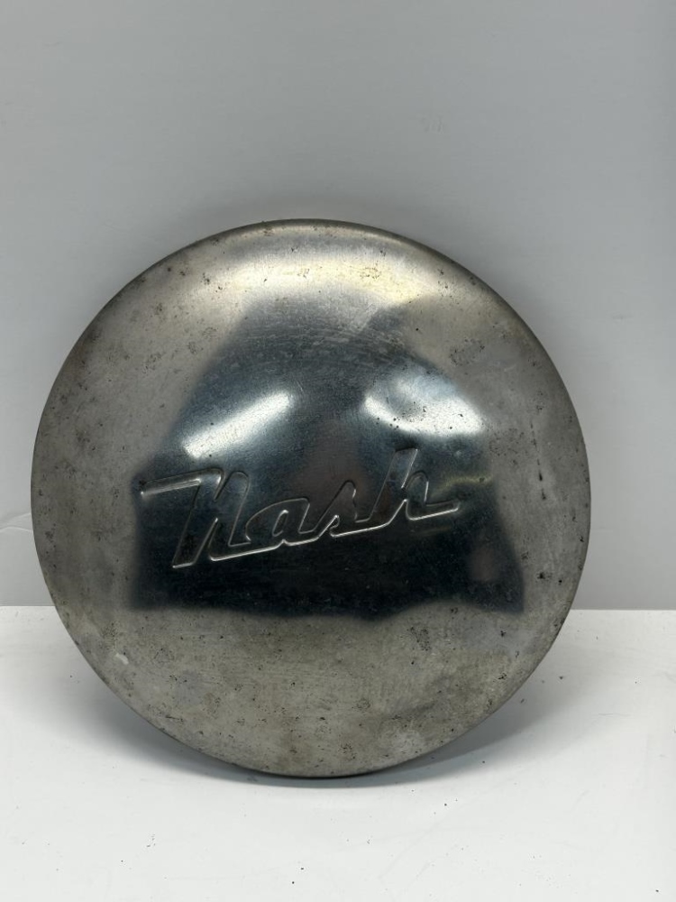 ANTIQUE GAS CAN, QUAKER STATE MOTOR OIL TIN, WOLF’S HEAD TRANSMISSION FLUID TIN, VINTGE NASH HUB CAP