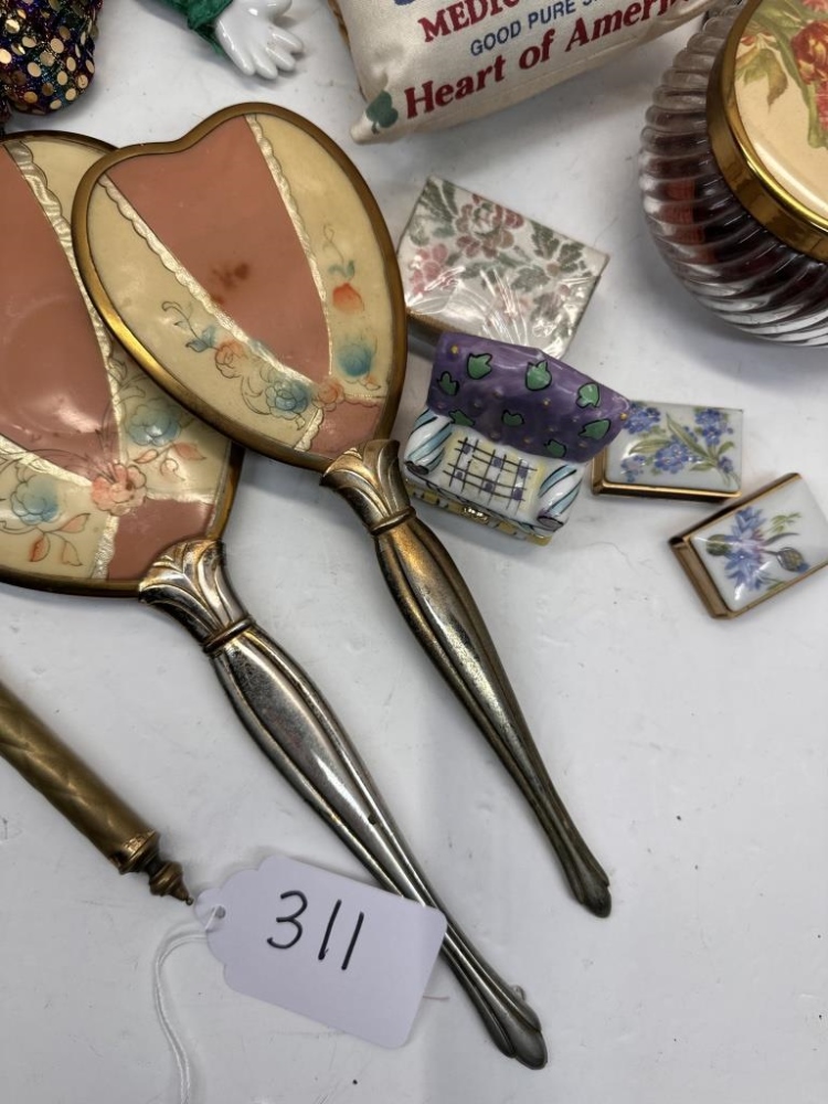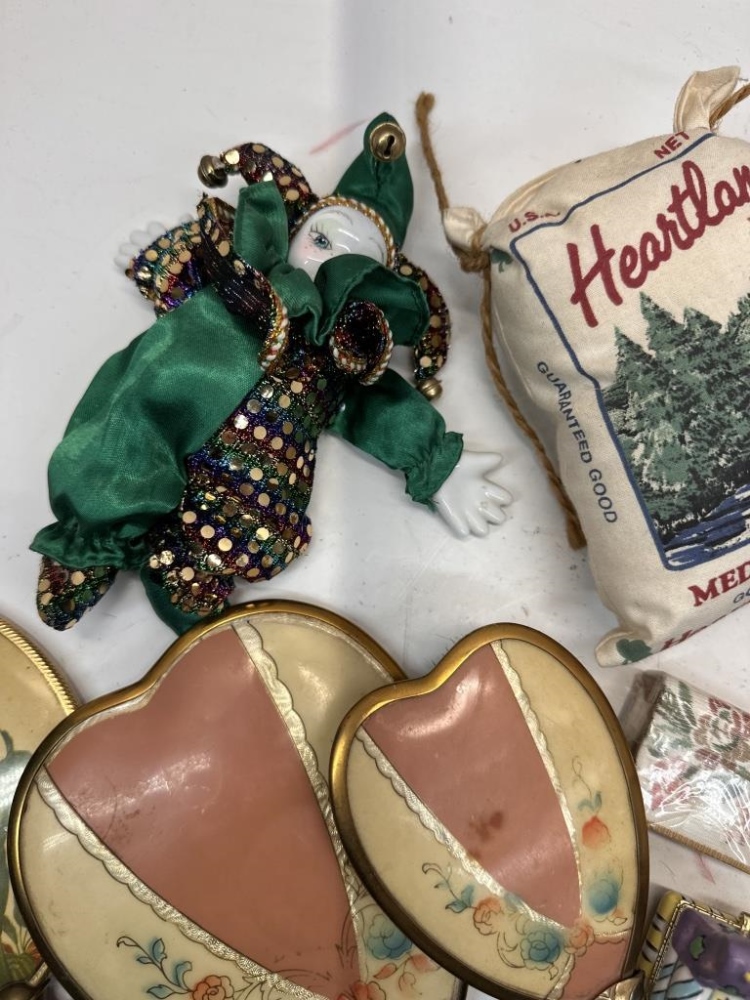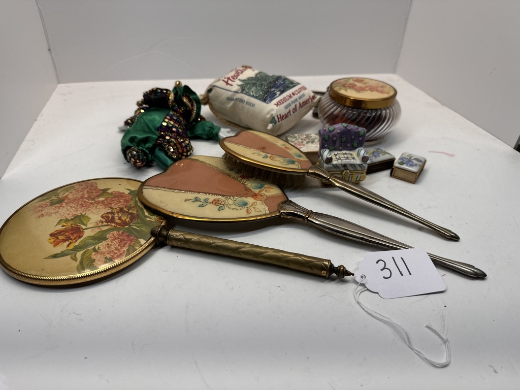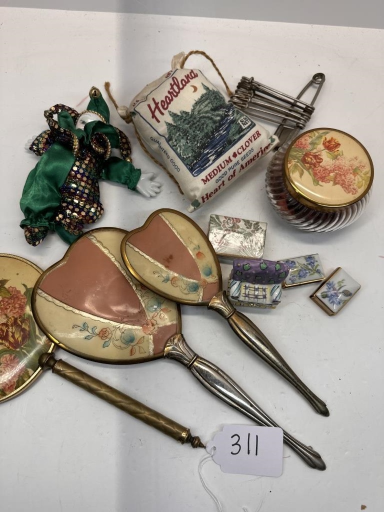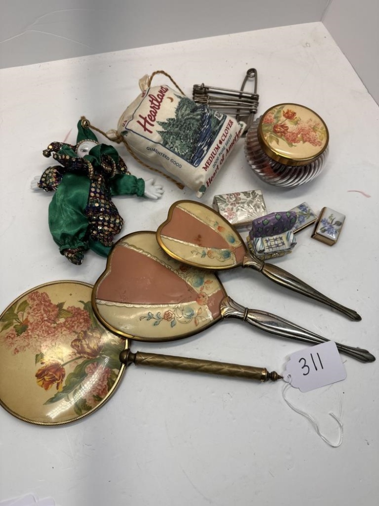 HAND HELD BRUSH AND MIRRORS, CLOWN TOY, SMALL JEWLREY BOX, ETC