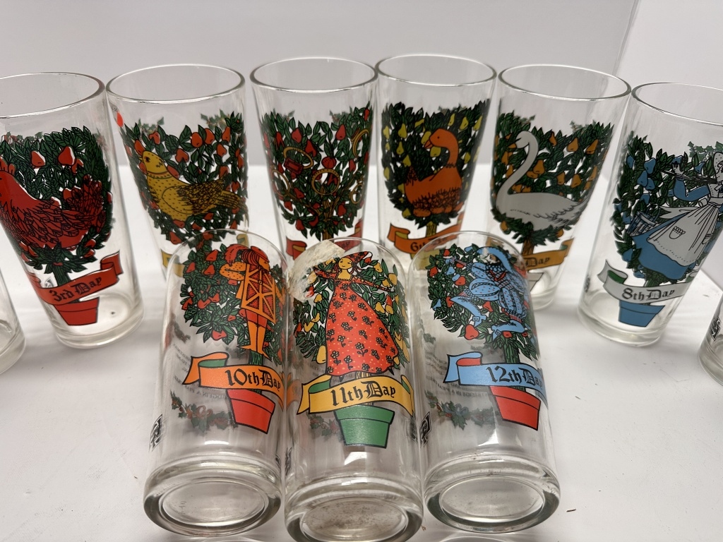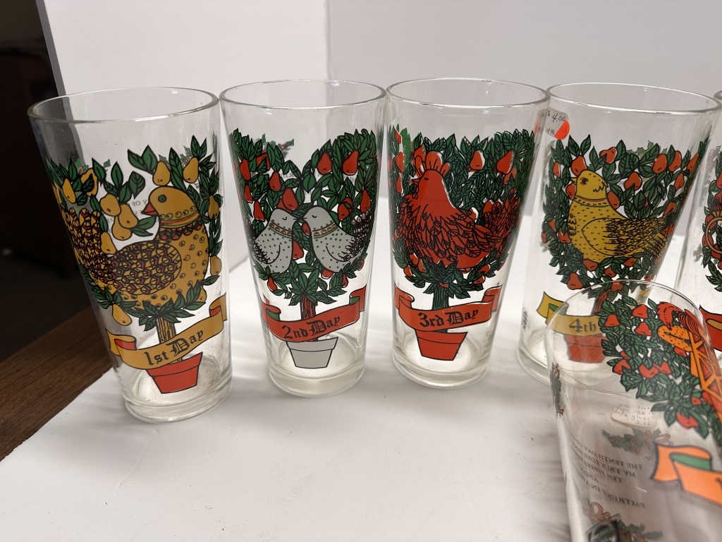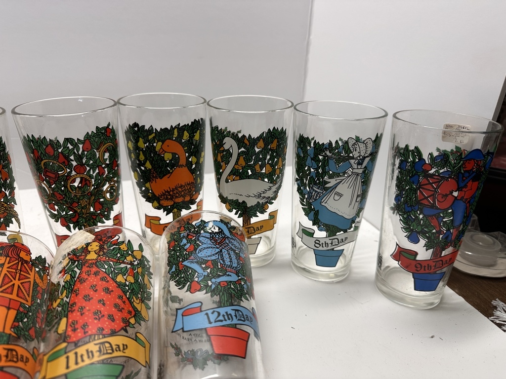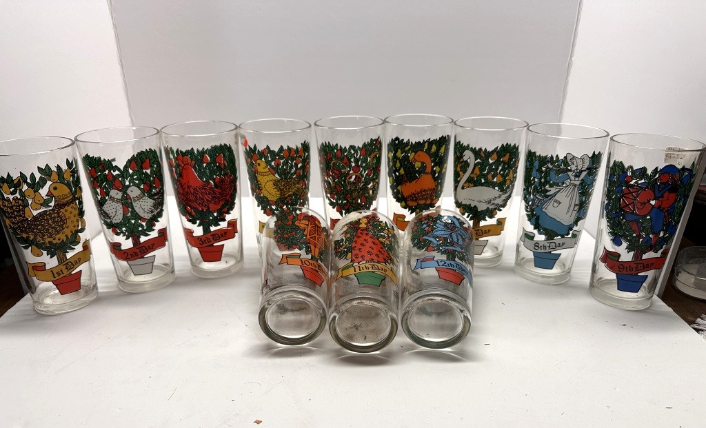 BOX OF 12 DAYS OF CHRISTMAS COLLECTIBLE GLASSES, COMPLETE SET