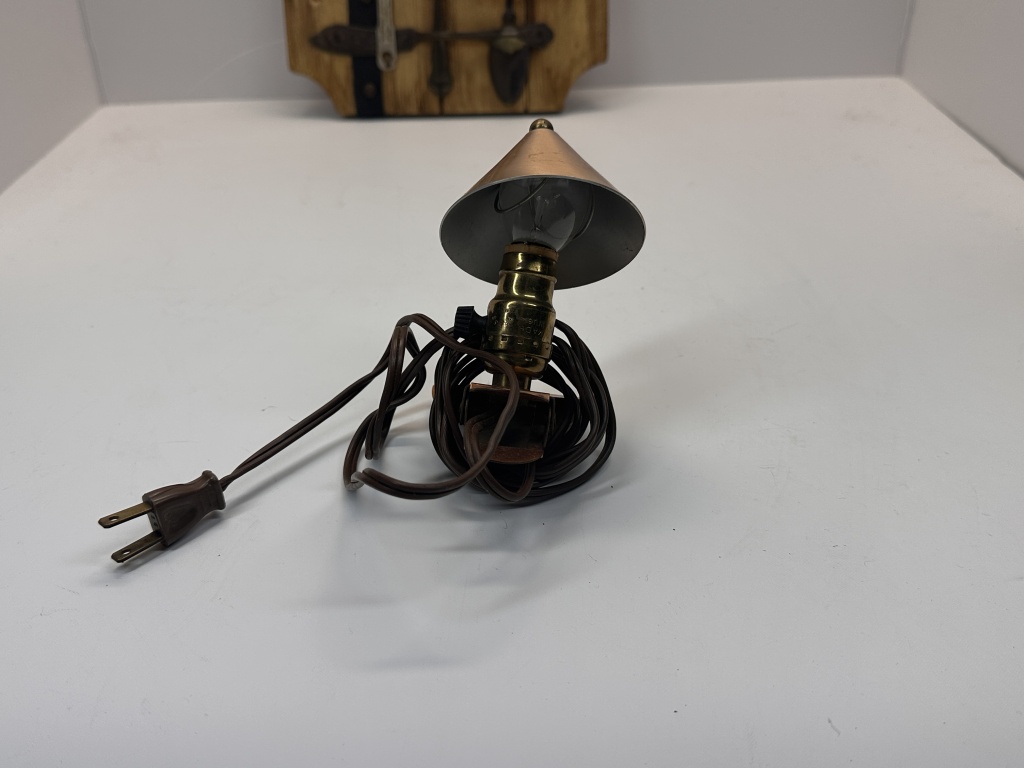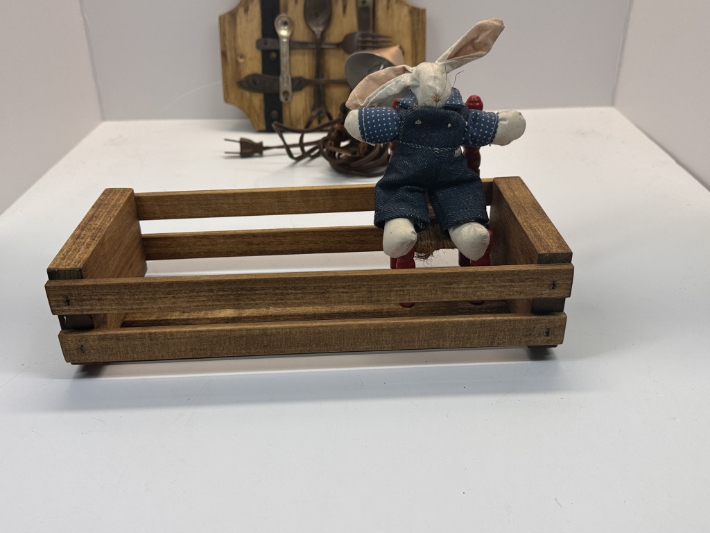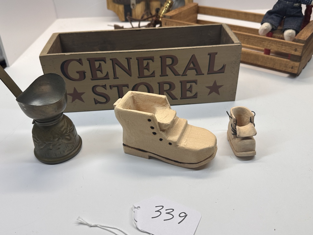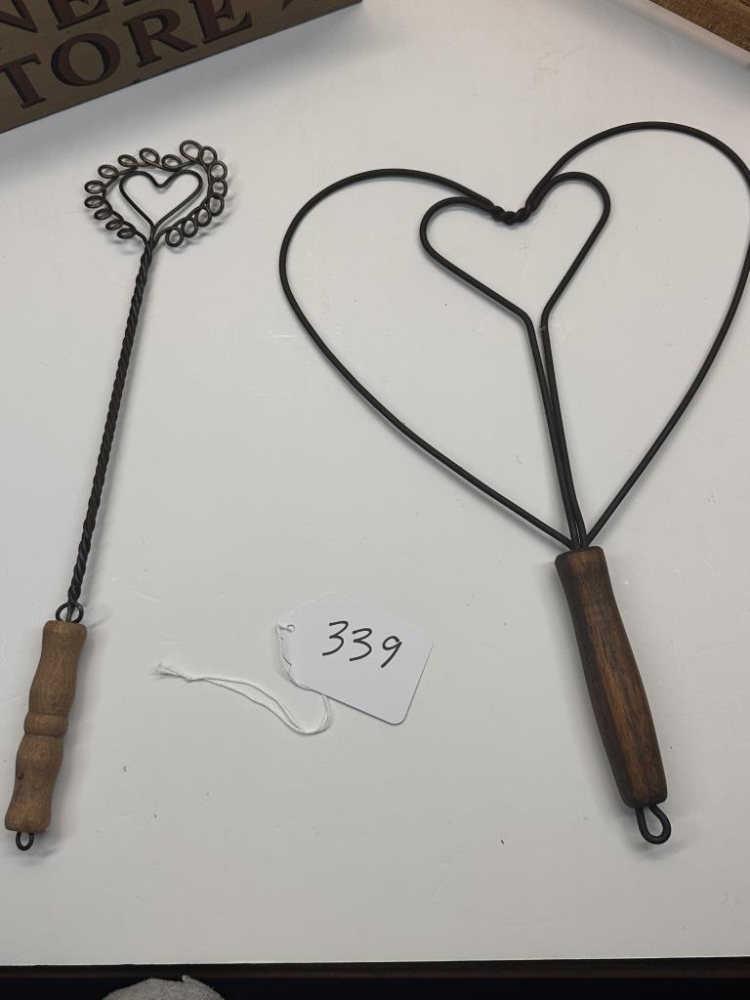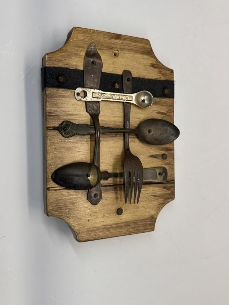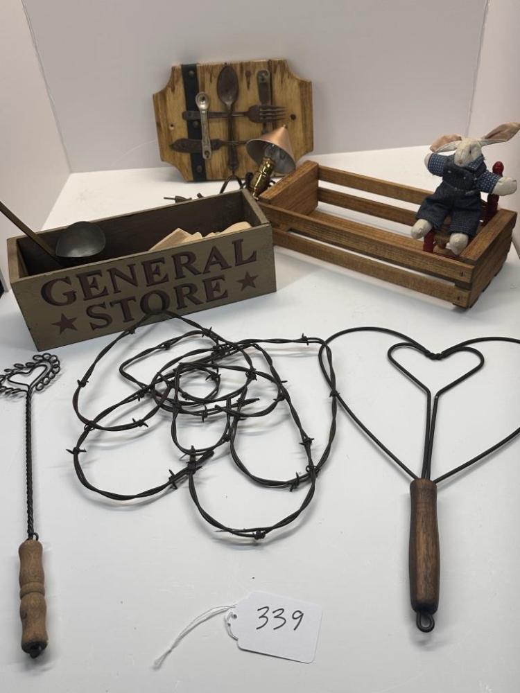 GENERAL STORE BOX, BARBED WIRE DECORATION, HEART DECORATIONS, LIGHT, UTENSILS MOUNTED ON BOARD