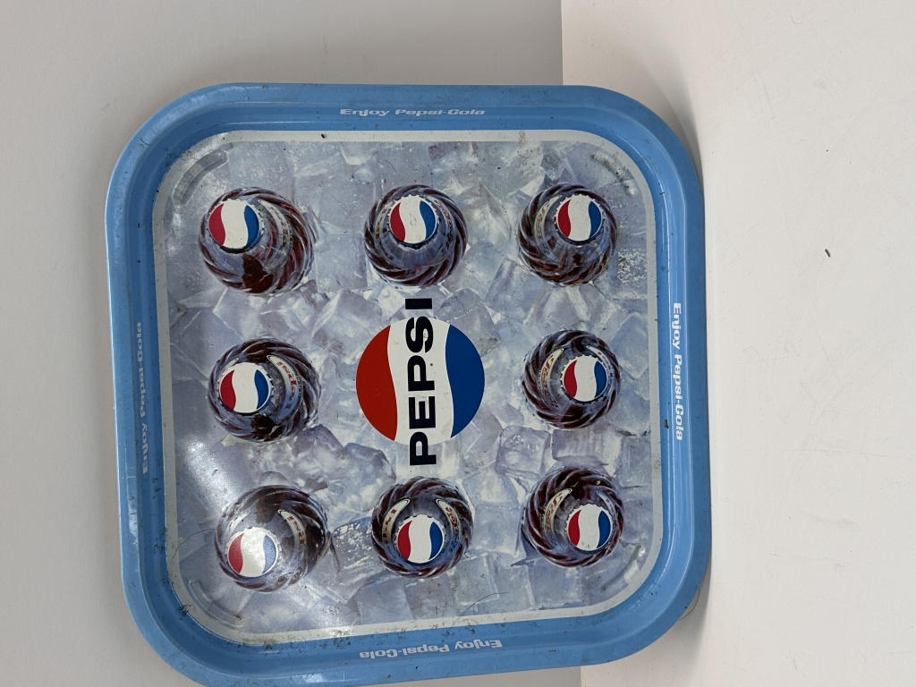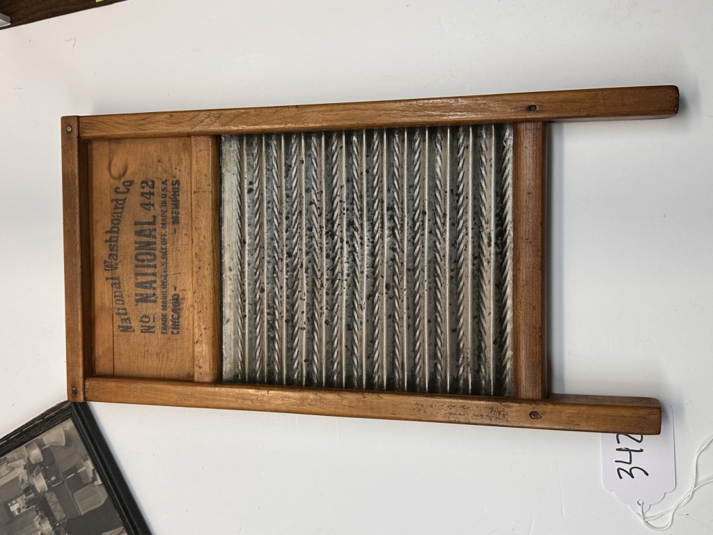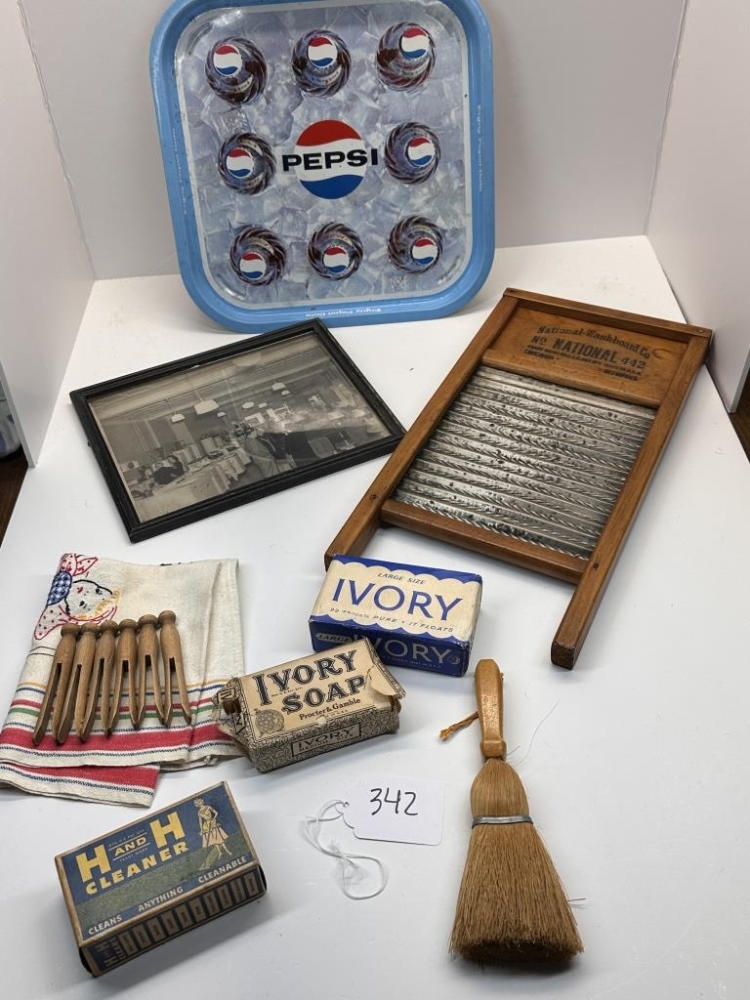 SOAPS, WASHBOARD, PEPSI TRAY, FRAMED PICTURE, SMALL BROOM