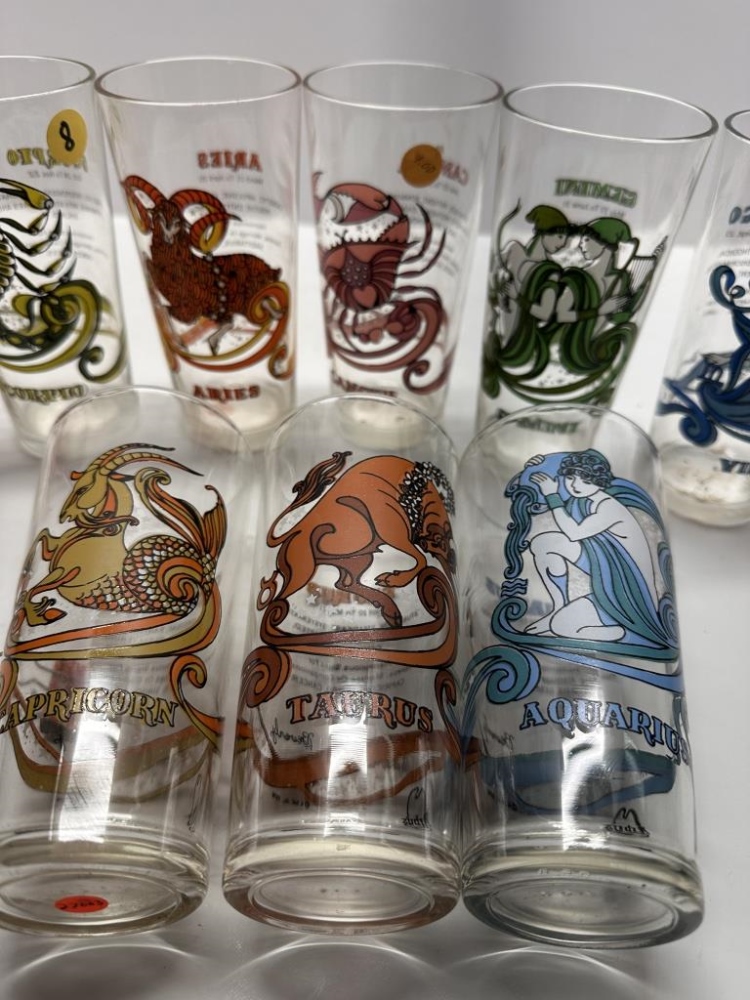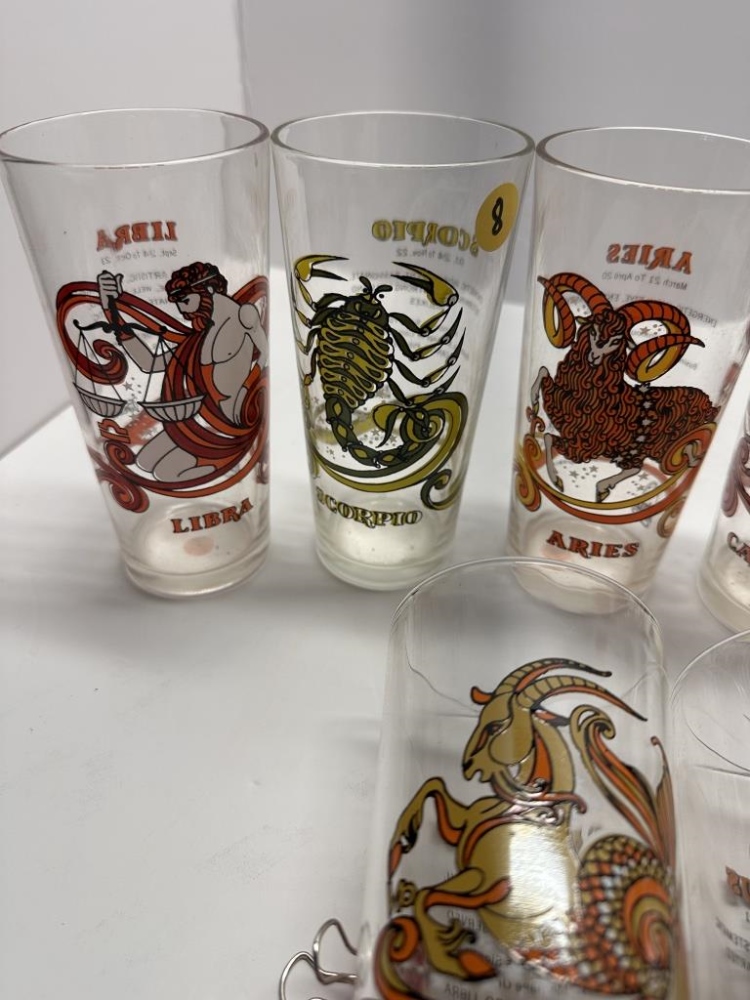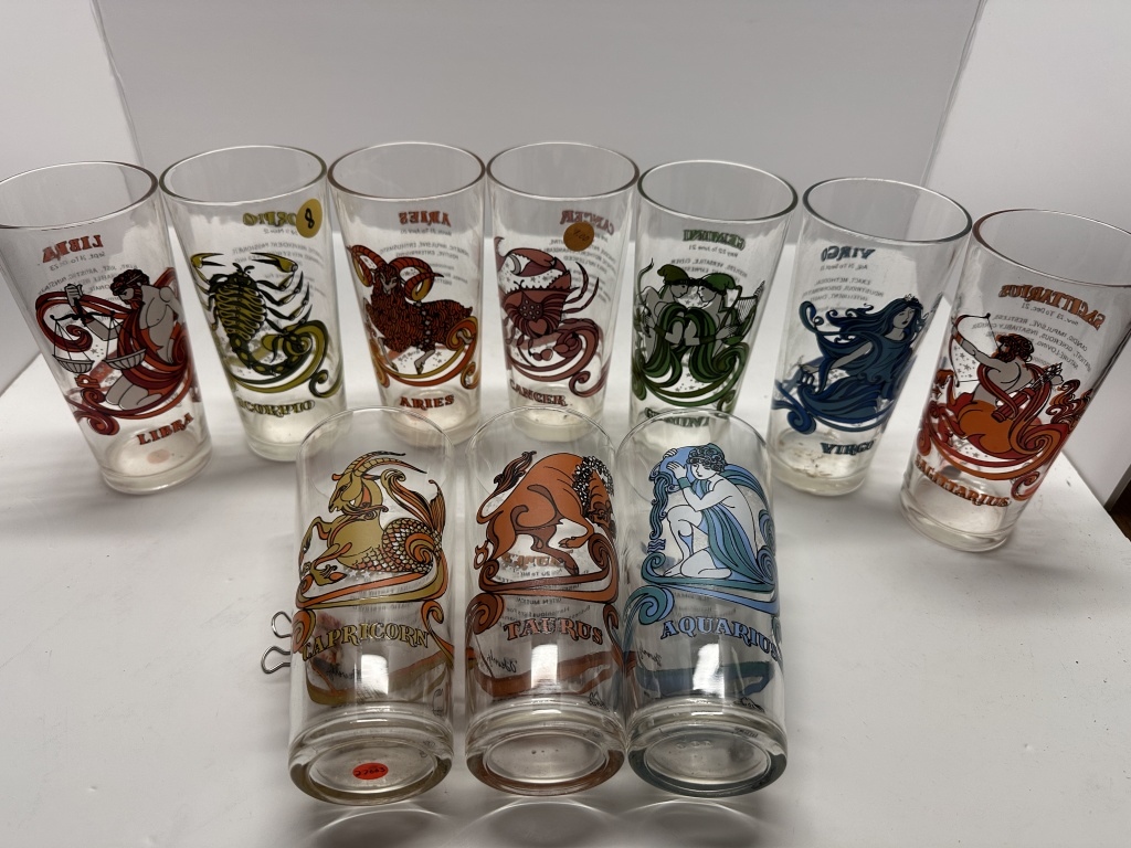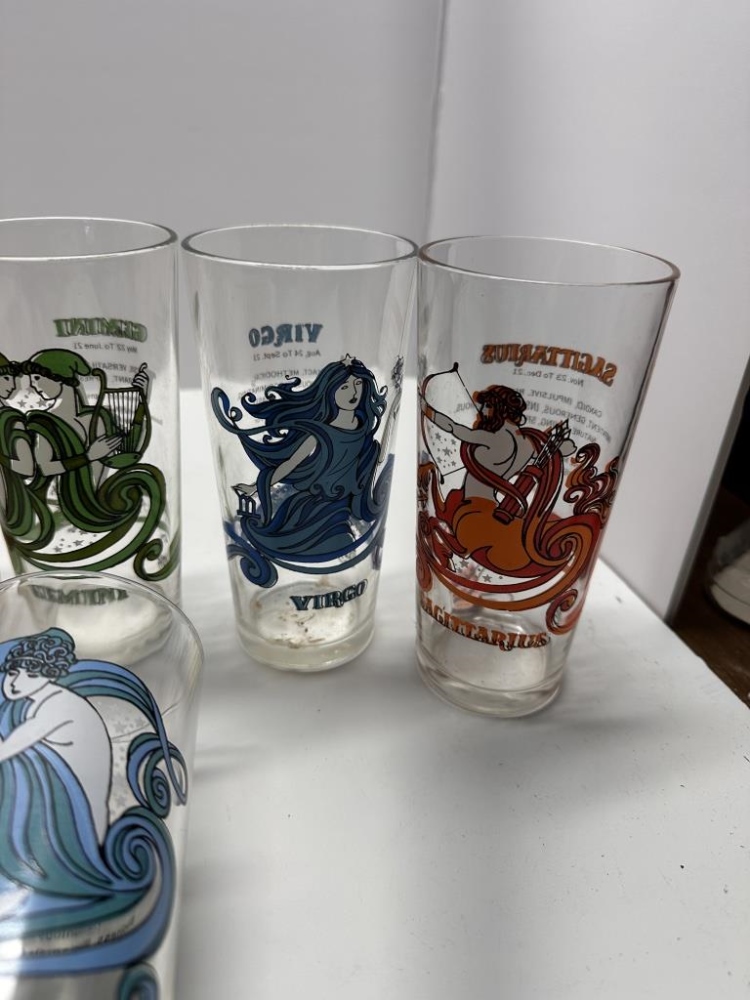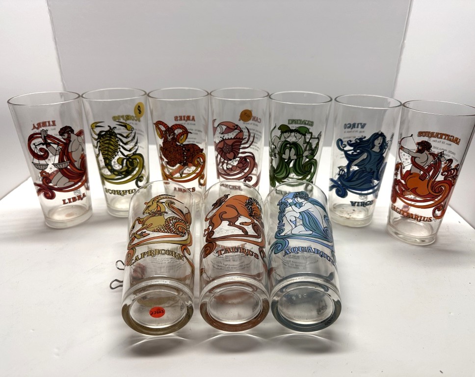 BOX OF 10 ZODIAC SIGN THEMED GLASSWARE, NOT A COMPLETE SET