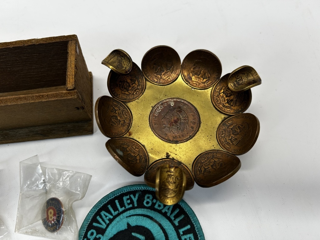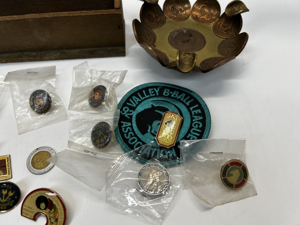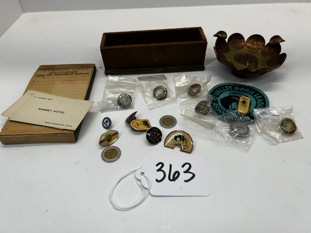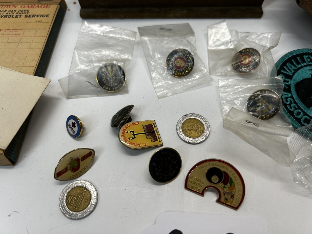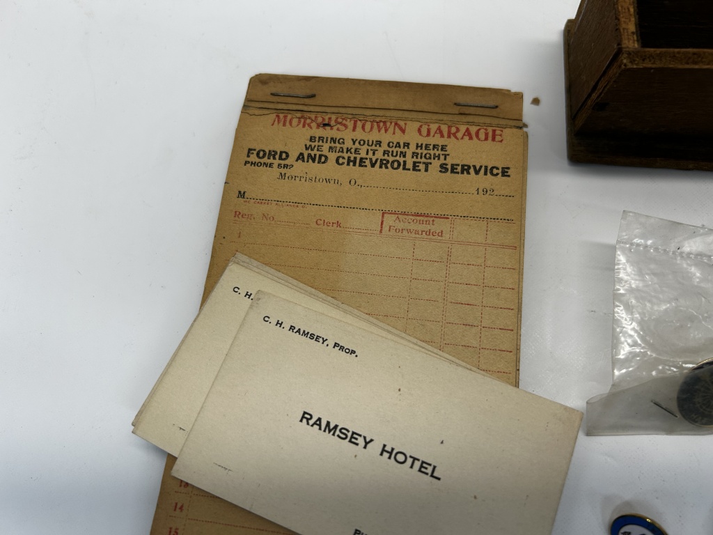 PINS, DISHES, PATCH, MORRISTOWN RAMSEY HOTEL CARDS, MORRISTOWN GARAGE RECEIPT BOOK