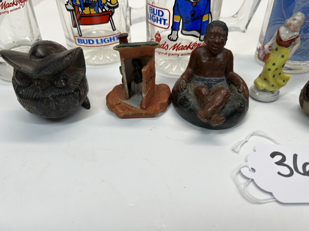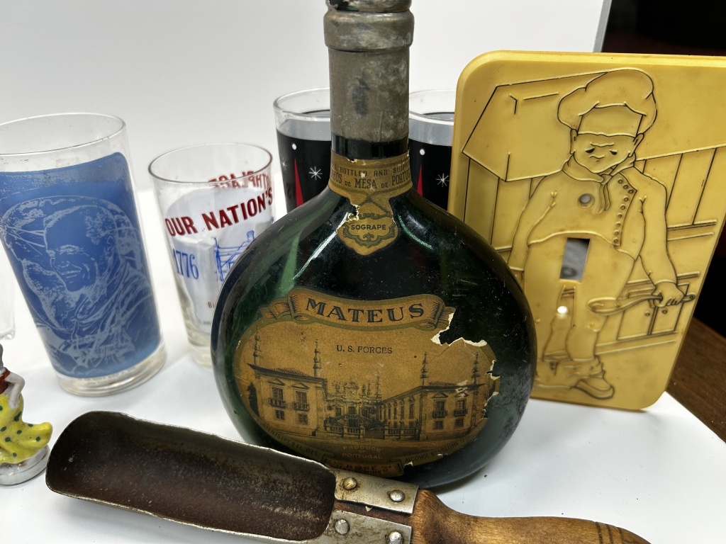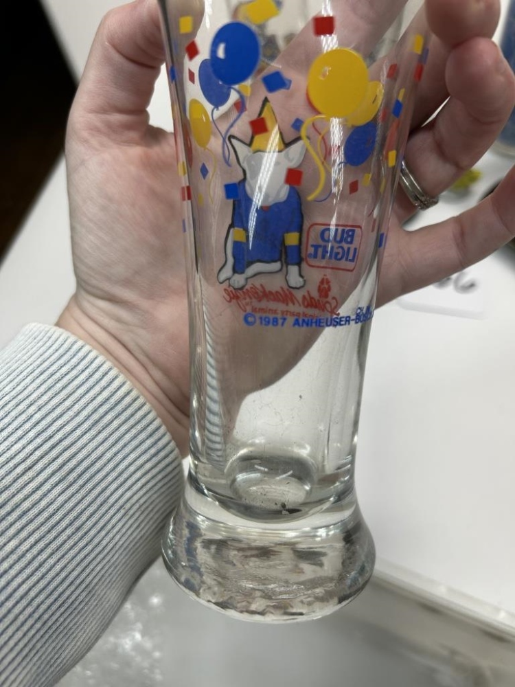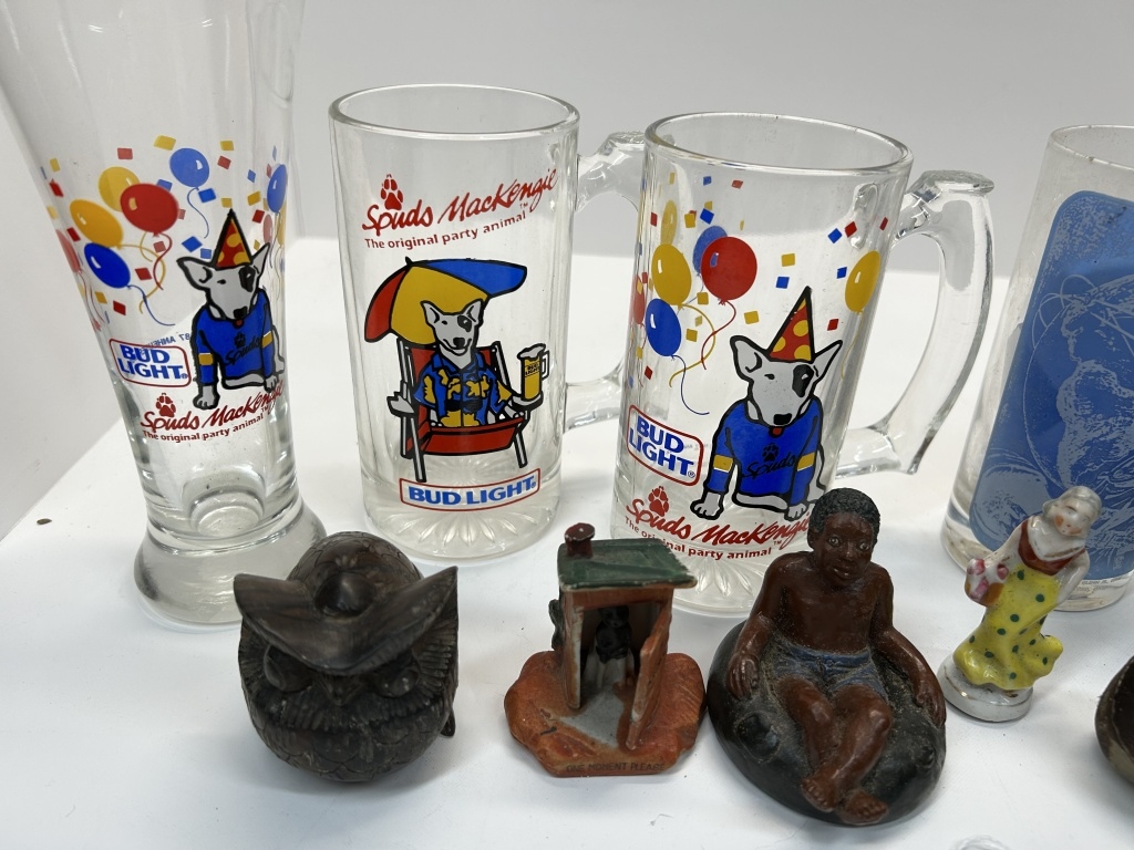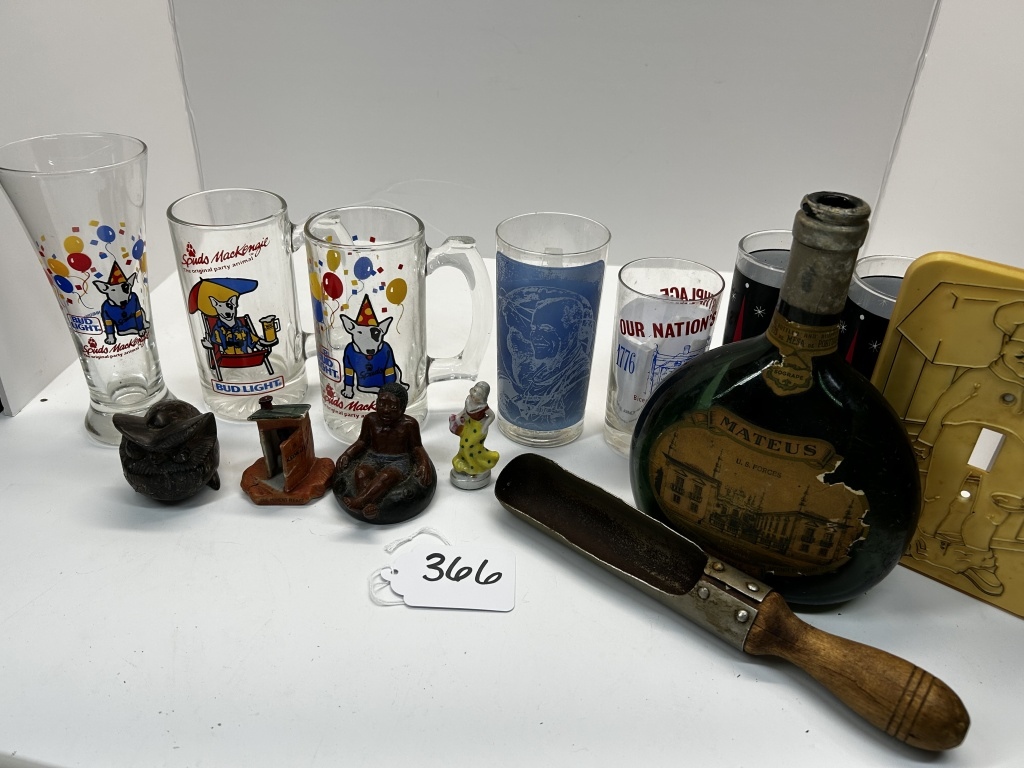 COLLECTABLE BUD LIGHT GLASSES, STATUES, MATEUS BOTTLE, LIGHT SWITCH COVER