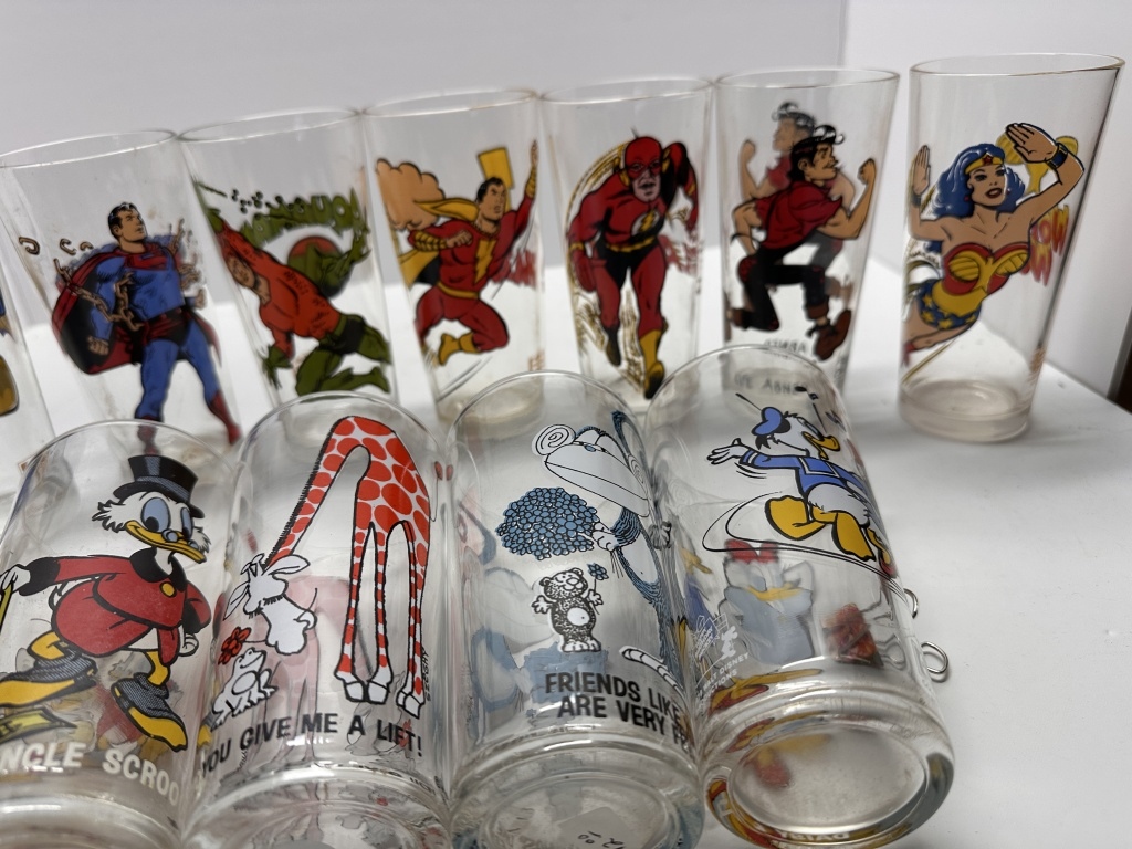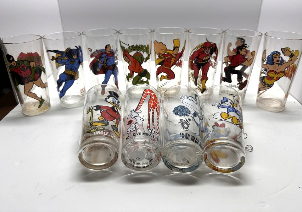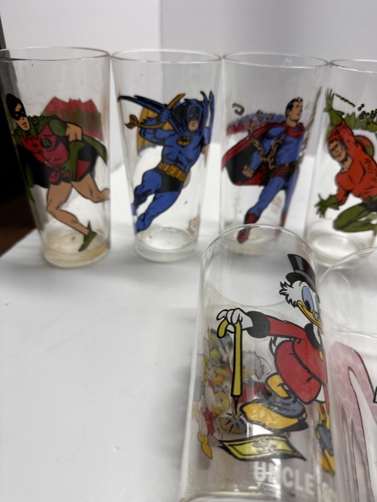 BOX OF 12 WALT DISNEY CHARACTER THEMED GLASSWARE, 8 GLASSES ARE DC COMICS CHARACTERS, 4 ARE LOONEY TUNES