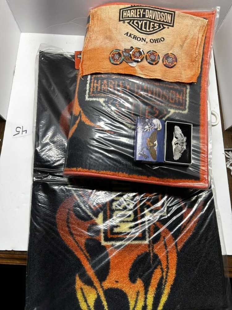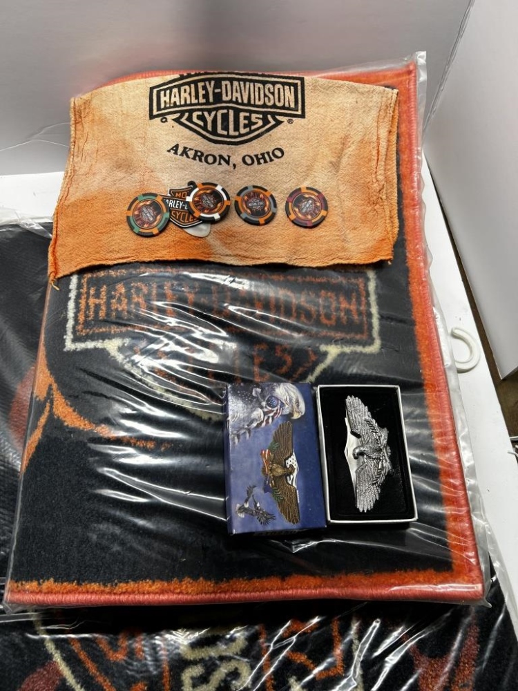 TWO HARLEY DAVIDSON NON-SKID TUFTED RUGS (20″X30″), HARLEY DAVIDSON CLOTH TOWEL, HARLEY DAVIDSON POKER CHIPS, SILVER BALD EAGLE POCKET KNIFE