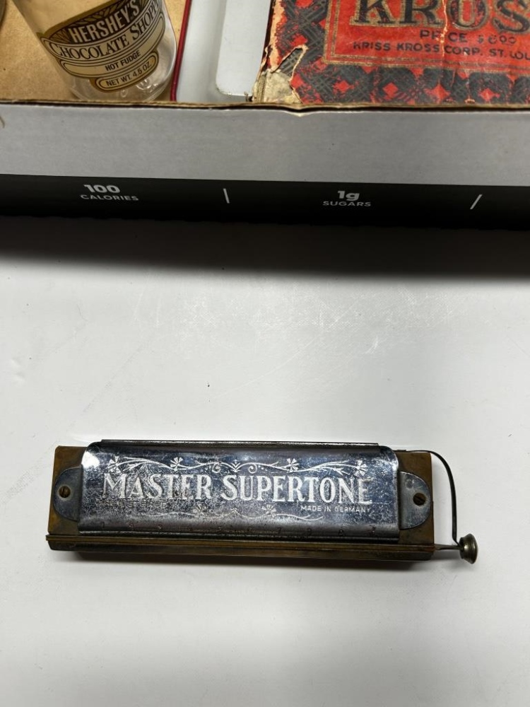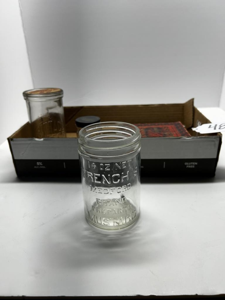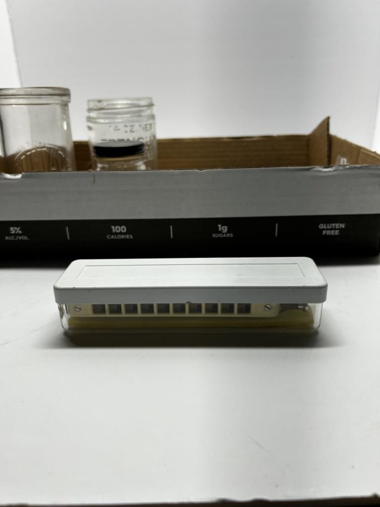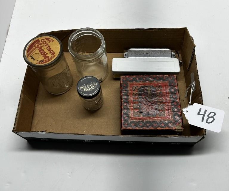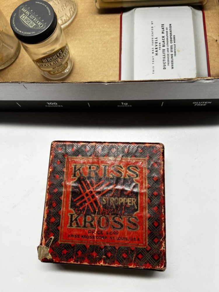 BOX OF 8 ITEMS, ONE ANTIQUEGLASS COTTAGE CHEESE JAR, ONE ANTIQUE GLASS HERSHEY’S HOT FUDGE JAR, ONE ANTIQUE GLASS MUSTARD JAR, ONE KRISS-KROSS BRAND RAZOR BLADE SHARPENER, ONE ANTIQUE HARMONICA, ONE ANTIQUE DUCTILLITE
