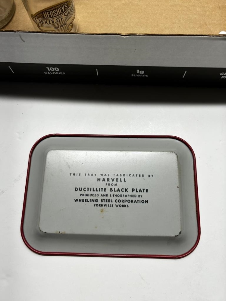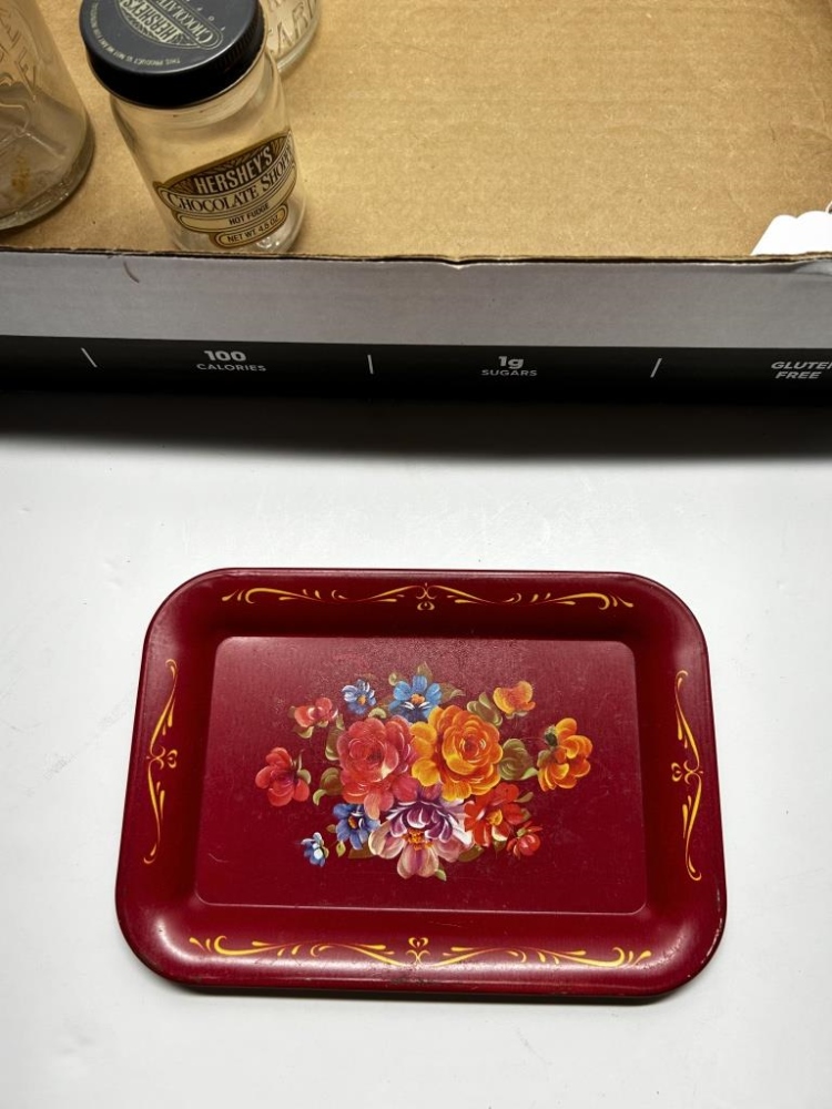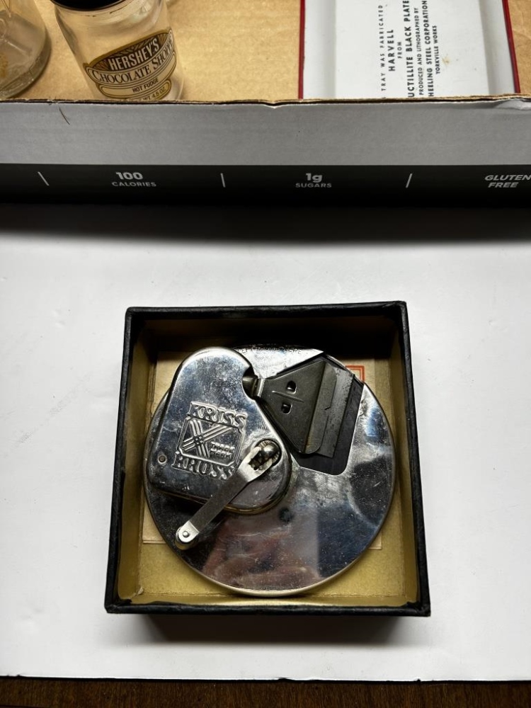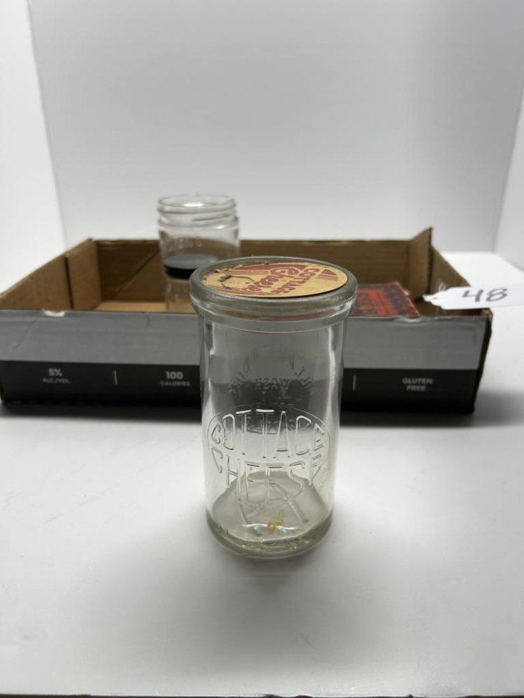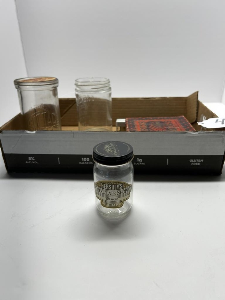 BOX OF 8 ITEMS, ONE ANTIQUEGLASS COTTAGE CHEESE JAR, ONE ANTIQUE GLASS HERSHEY’S HOT FUDGE JAR, ONE ANTIQUE GLASS MUSTARD JAR, ONE KRISS-KROSS BRAND RAZOR BLADE SHARPENER, ONE ANTIQUE HARMONICA, ONE ANTIQUE DUCTILLITE