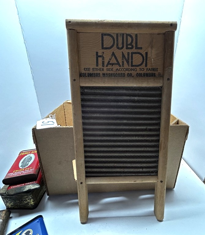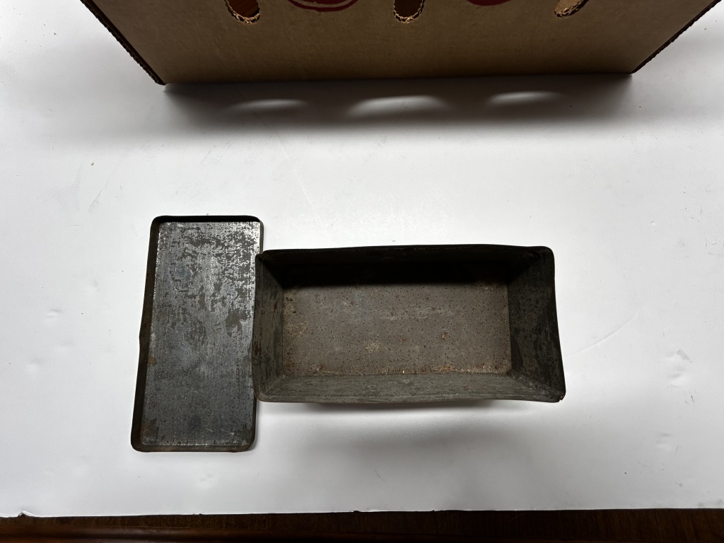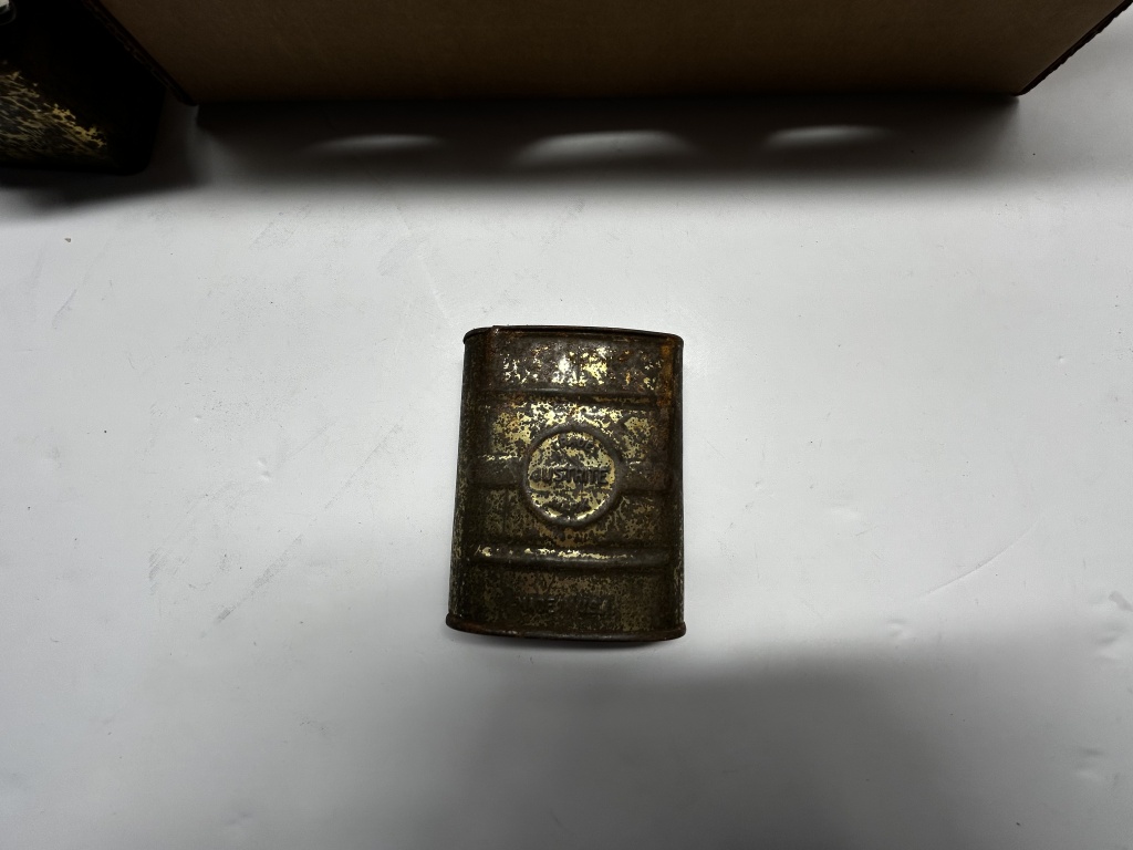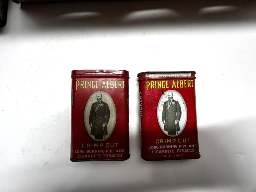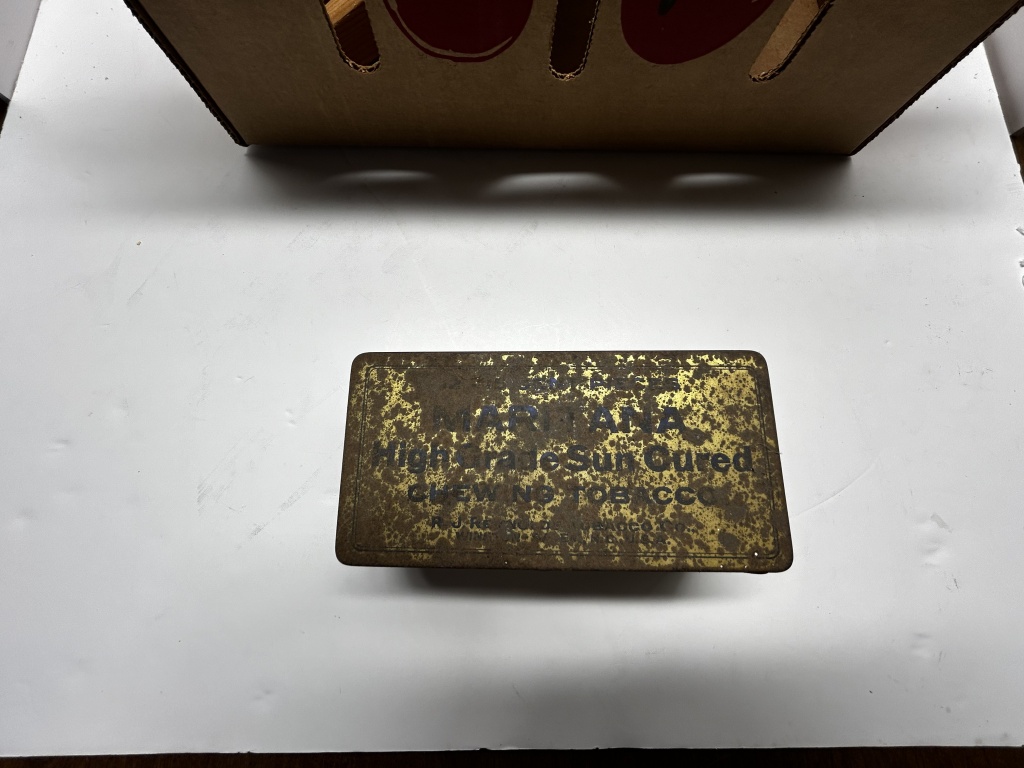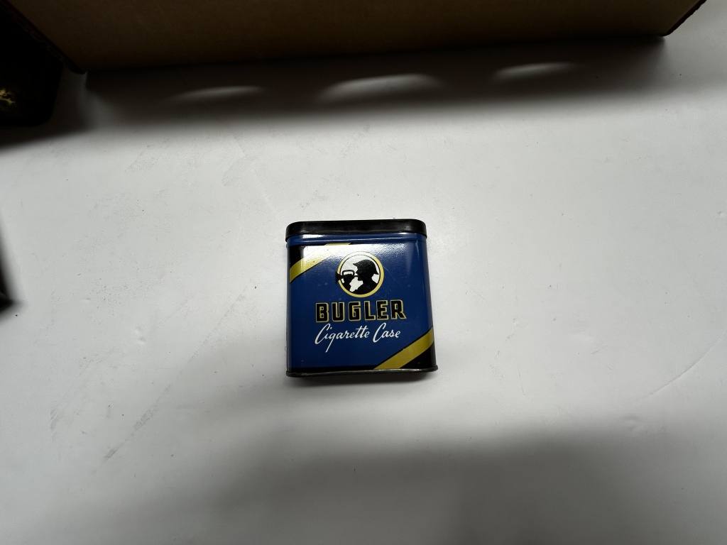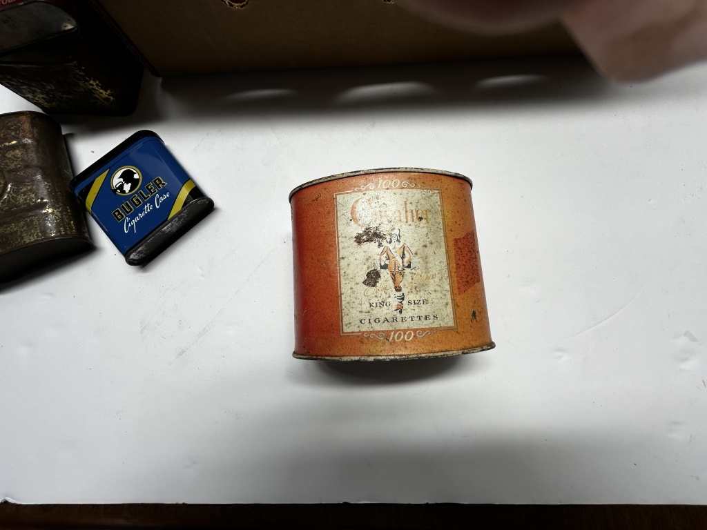 BOX OF 6 MISCELLANEOUS ITEMS, ONE ANTIQUE MARITIANA HIGH GRADE SUN CURED CHEW TOBACCO METAL TIN, TWO METAL PRINCE ALBERT CIGARETTE CASES, MISC SMALL TIN BOX, ONE BUGLER CIGARETTE CASE, ONE CAVALIER CIGARETTE TIN,