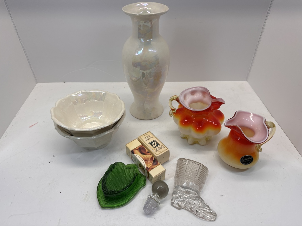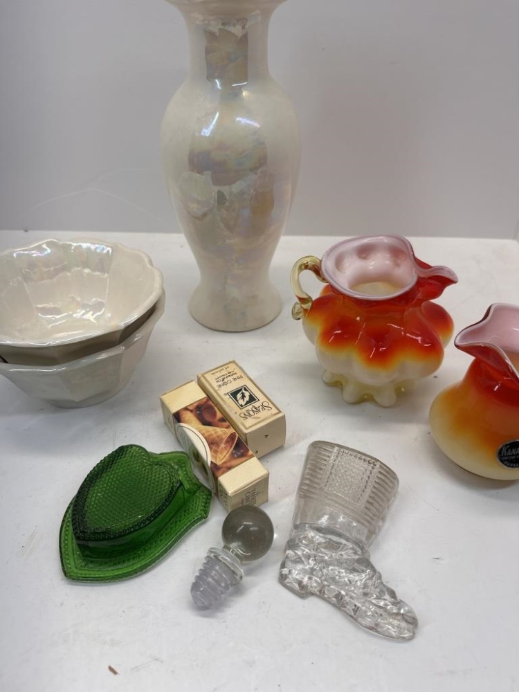 BOX OF 9 ANTIQUE GLASS ITEMS, ONE OPAL VASE, TWO OPAL BOWLS, TWO MINI RED AND YELLOW COLORED PITCHERS, TWO POTPOURRI REFRESHER OILS, ONE GLASS BOOT, ONE MINI GREEN GLASS PLAQUE, ONE GLASS BULB WINE CORK