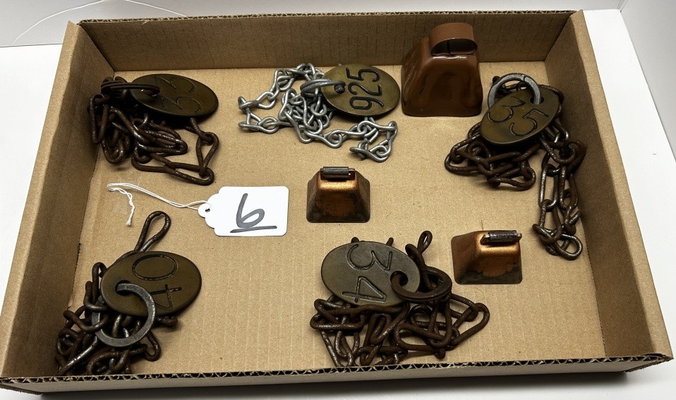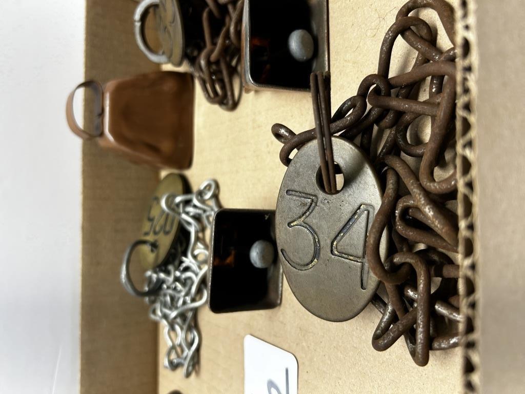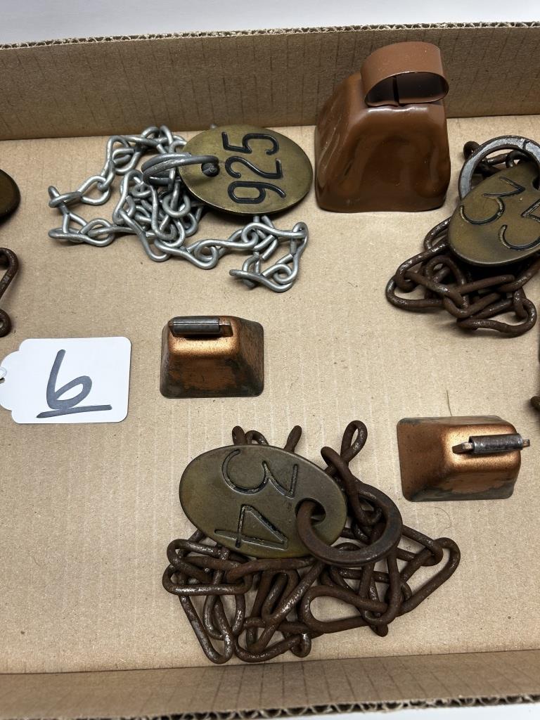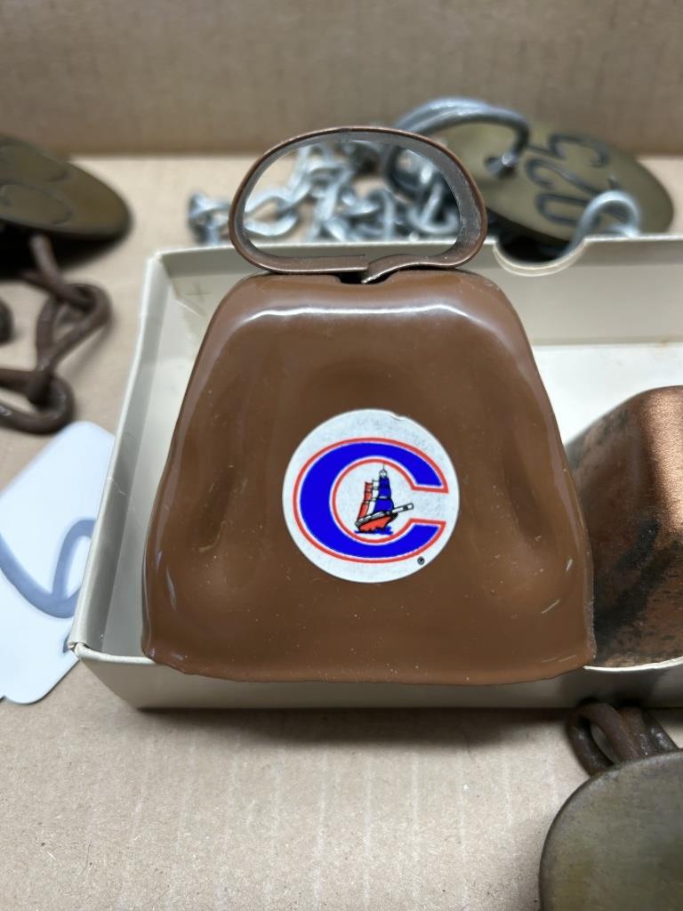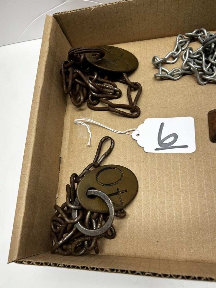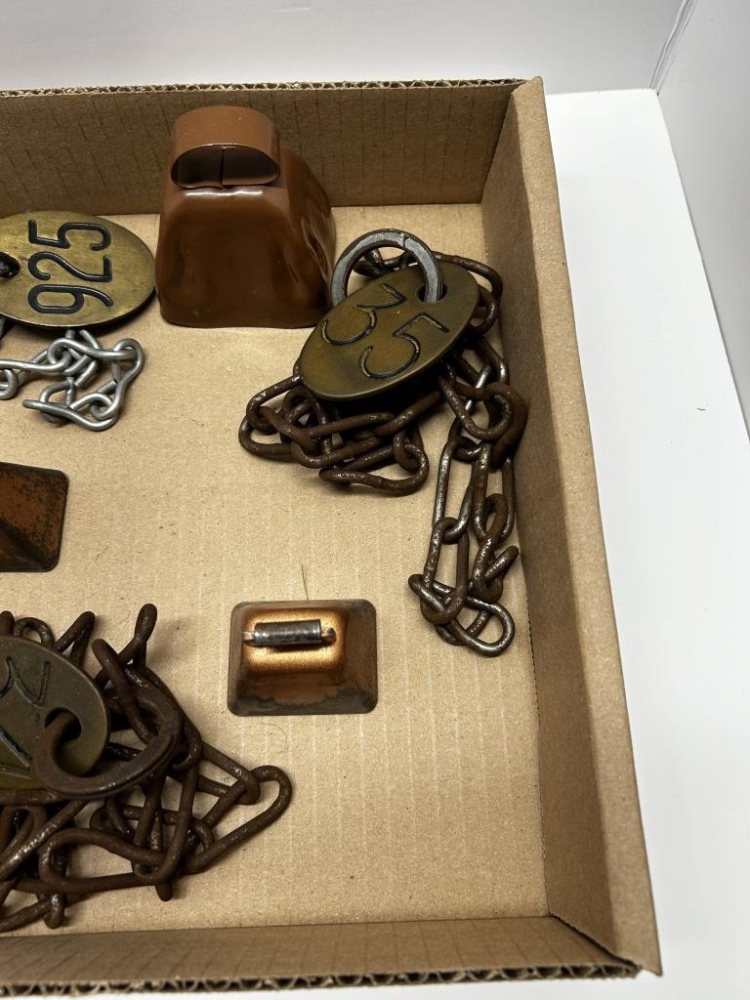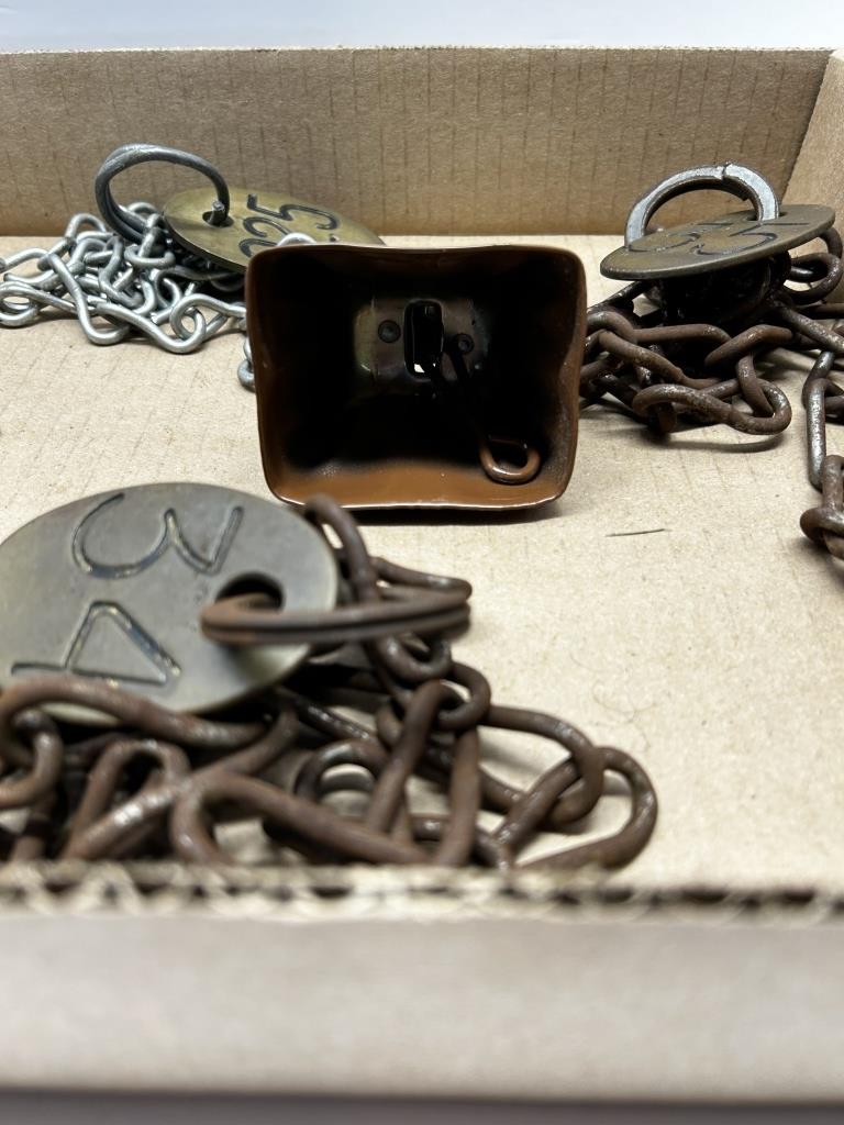 ONE BOX, VINTAGE CHAINS WITH NUMBERED TAGS, THREE COW BELLS