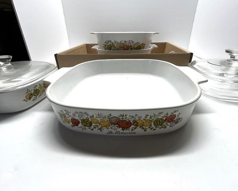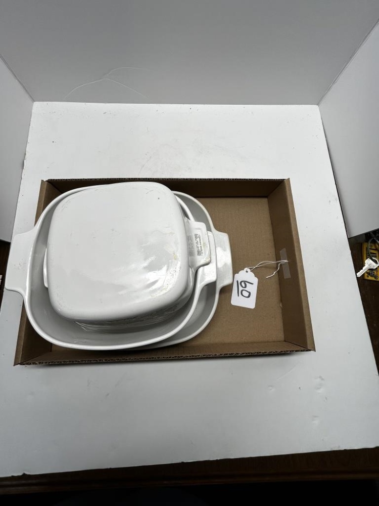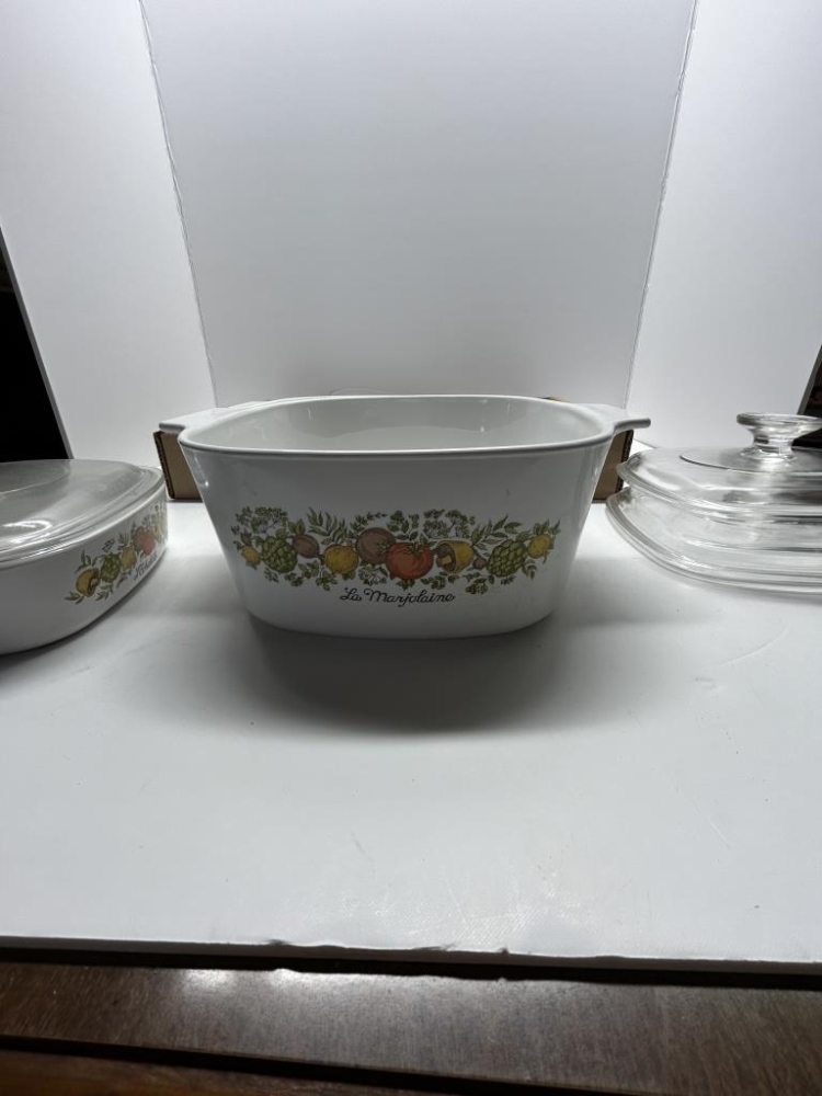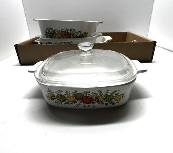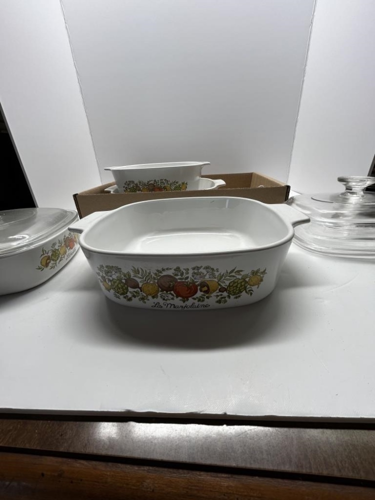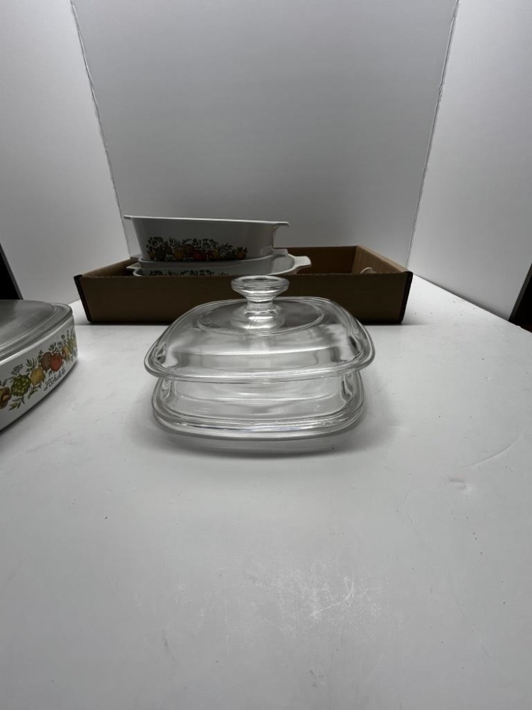 ONE GLASS SQUARE DISH WITH LID AND FLORAL DESIGN, TWO MISC. GLASS DISH LIDS, ONE LARGE GLASS DISH, ONE MEDIUM GLASS DISH, ONE SHALLOW GLASS DISH