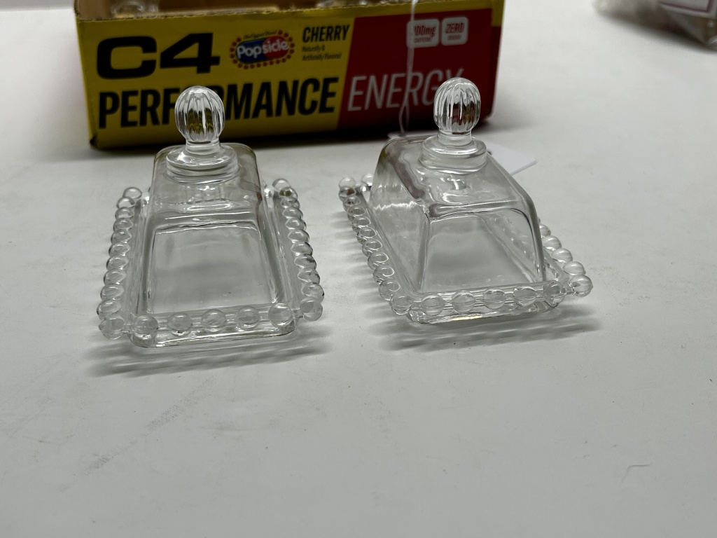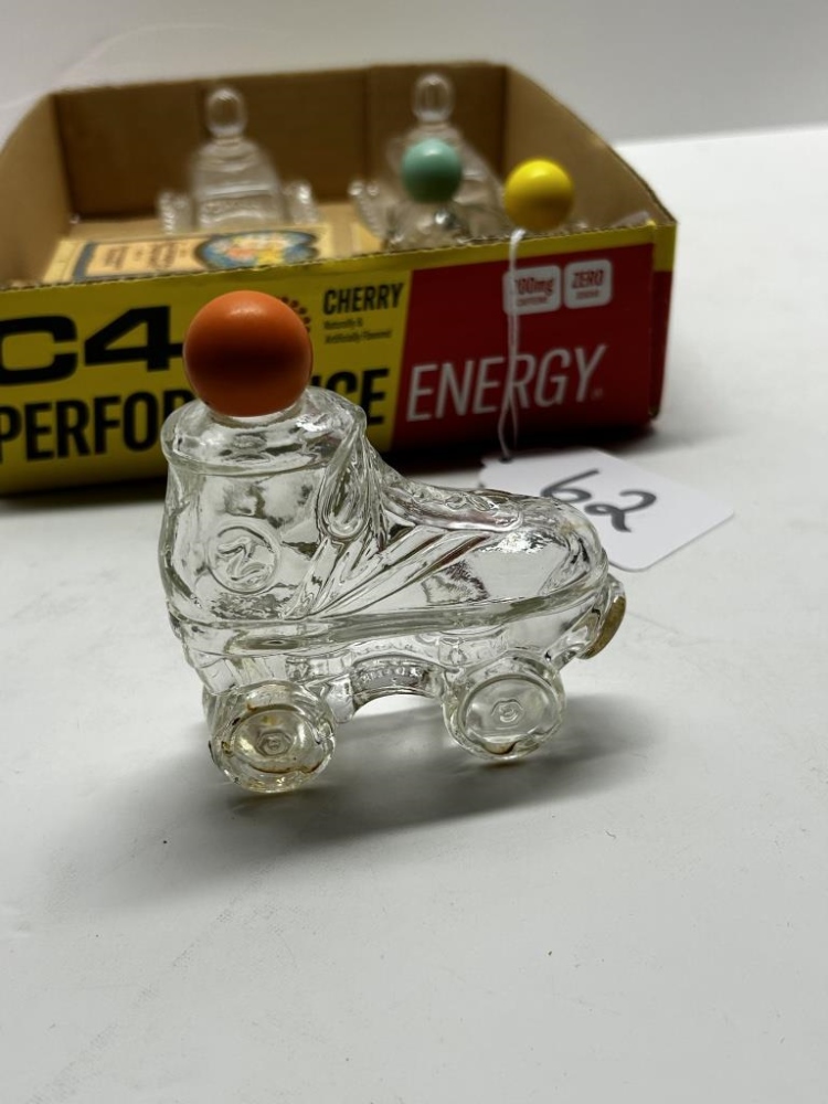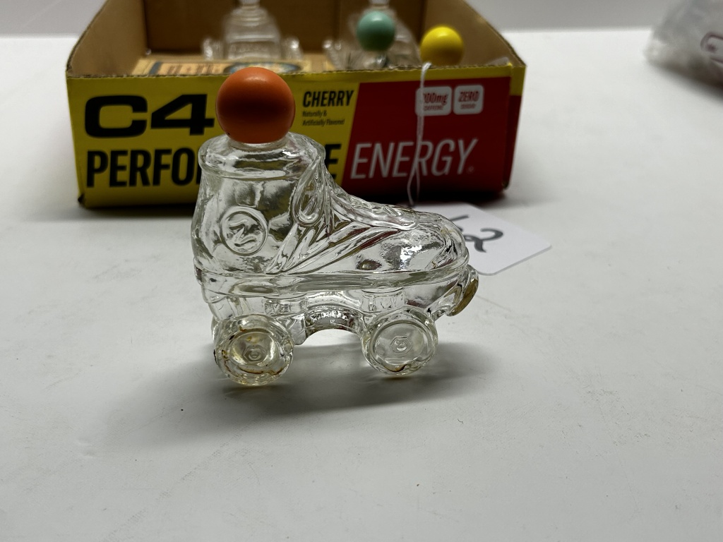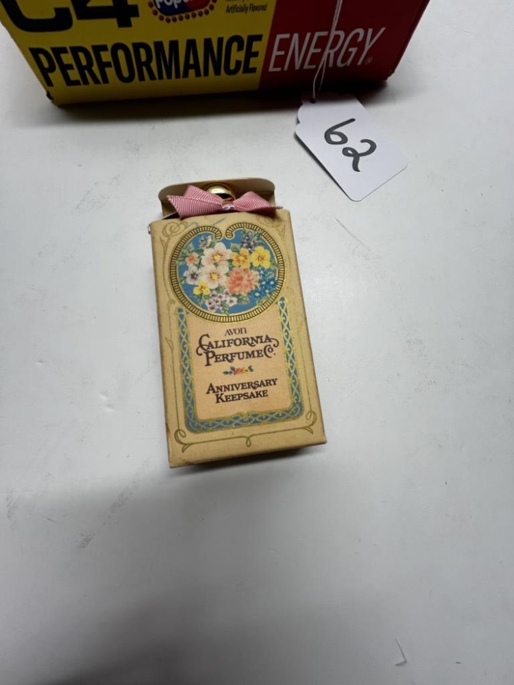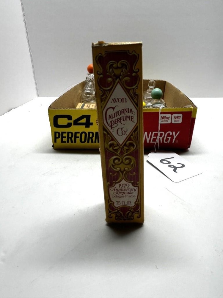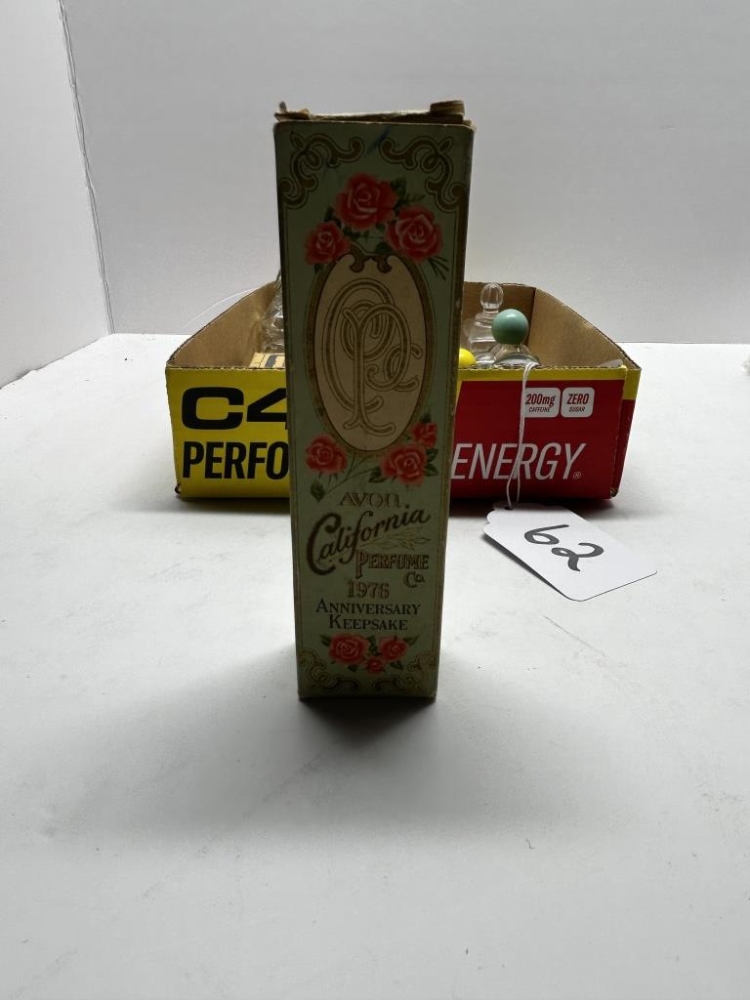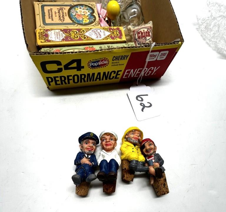 FOUR WOODEN CARVED WINE CORKS (POLICEMAN, SAILOR, FISHERMAN, PIRATE), ONE METAL AVON CALIFORNIA PERFUME TIN ANNIVERSARY KEEPSAKE, ONE AVON CALIFORNIA PERFUME CO. 1979 ANNIVERSARY KEEPSAKE COLOGNE FLACON, ONE AVON