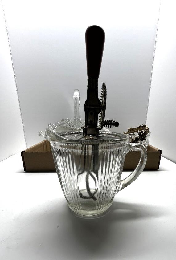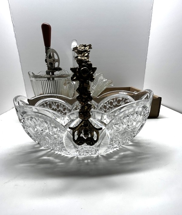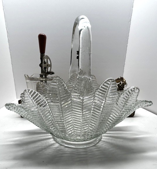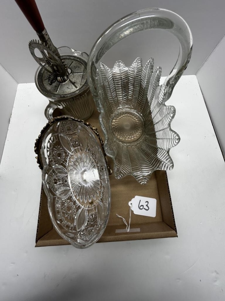 ONE GLASS BASKET WITH METAL HANDLE, ONE ANTIQUE GLASS MIXING BOWL WITH METAL MIXER, ONE GLASS BASKET