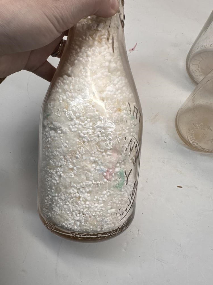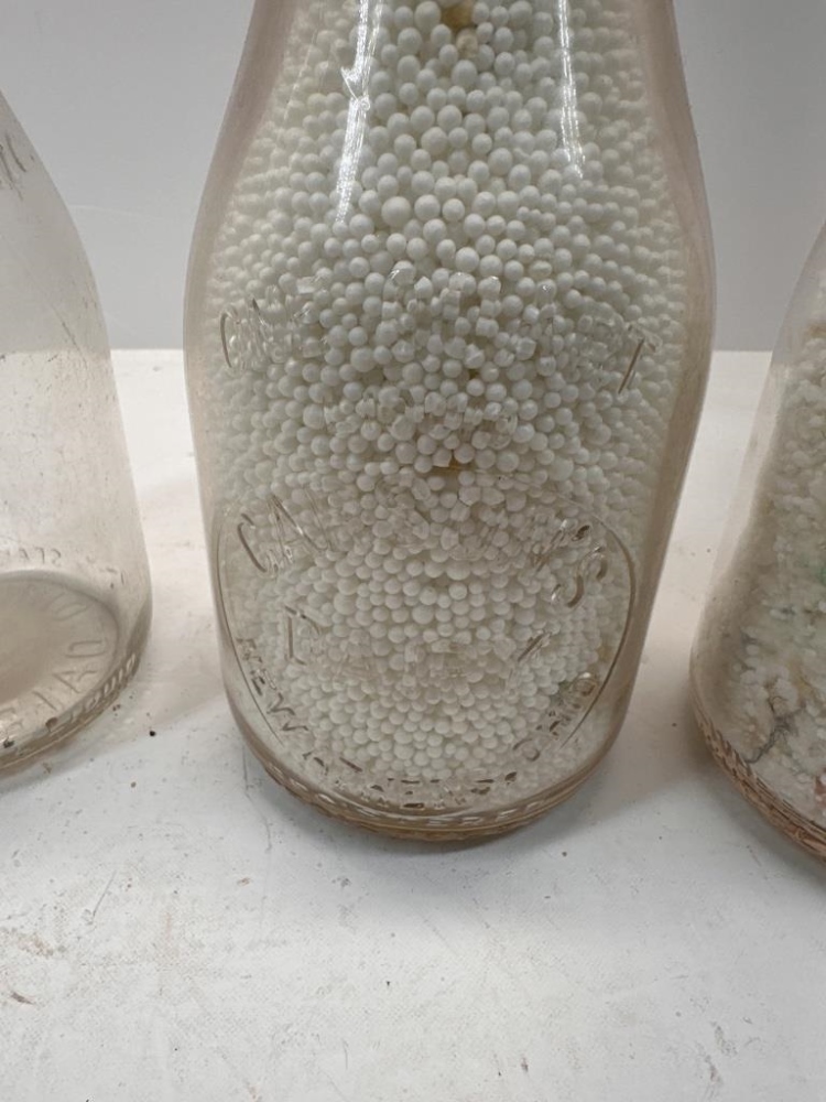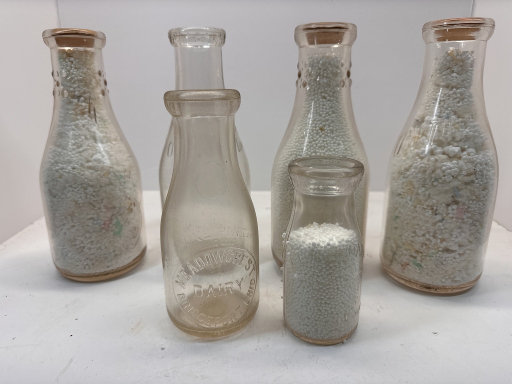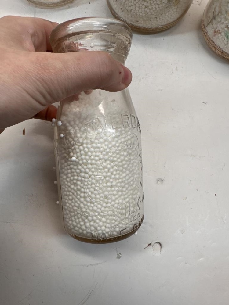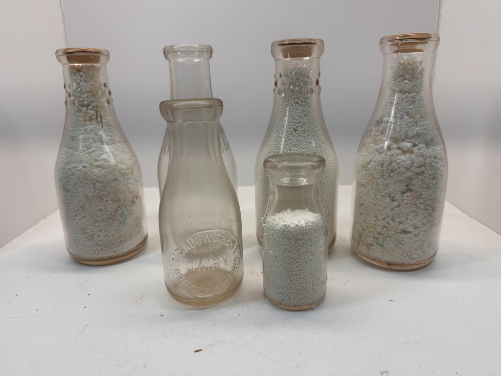 BOX OF ANTIQUE MILK JARS, THREE JARS FILLED WITH STYROFOAM BALLS, ONE JAR HALF-FILLED WITH STYROFOAM BALLS, TWO EMPTY JARS