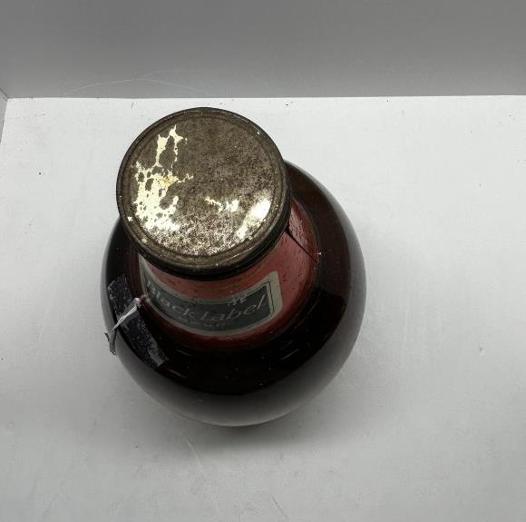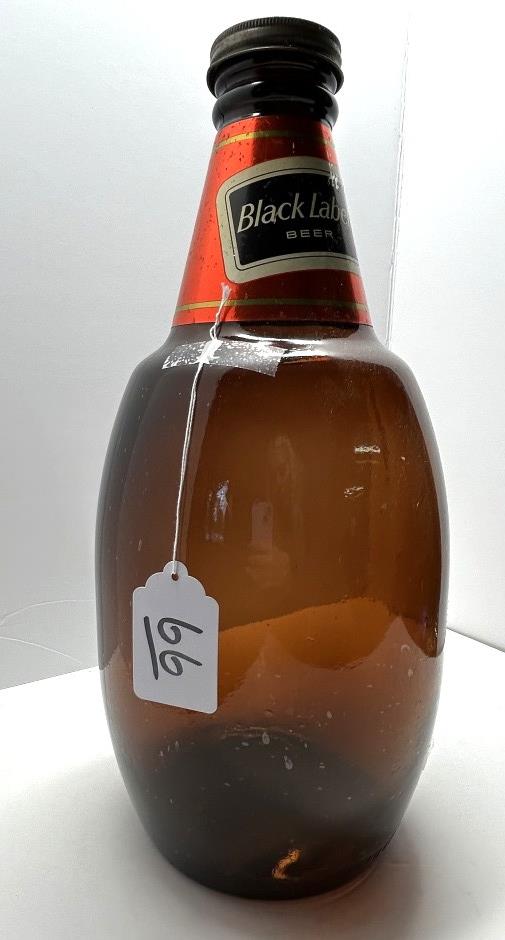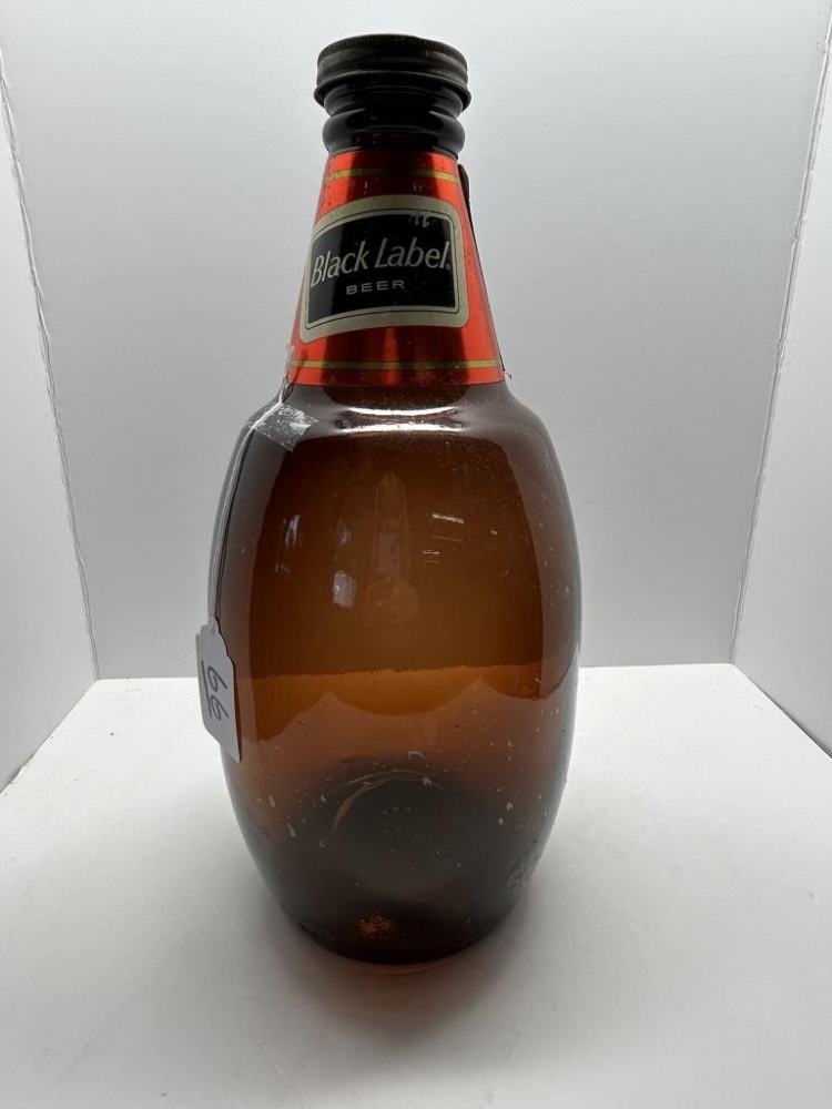 LARGE GLASS BLACK LABEL BEER BOTTLE, BLACK LABEL BEER BRAND, BROWN GLASS