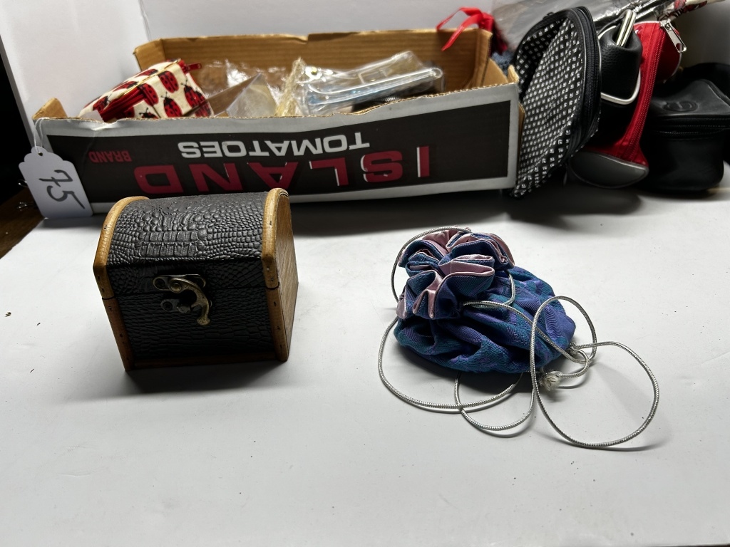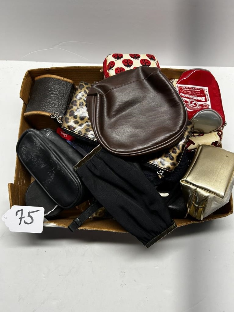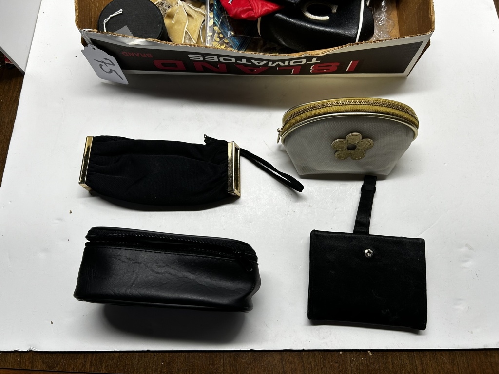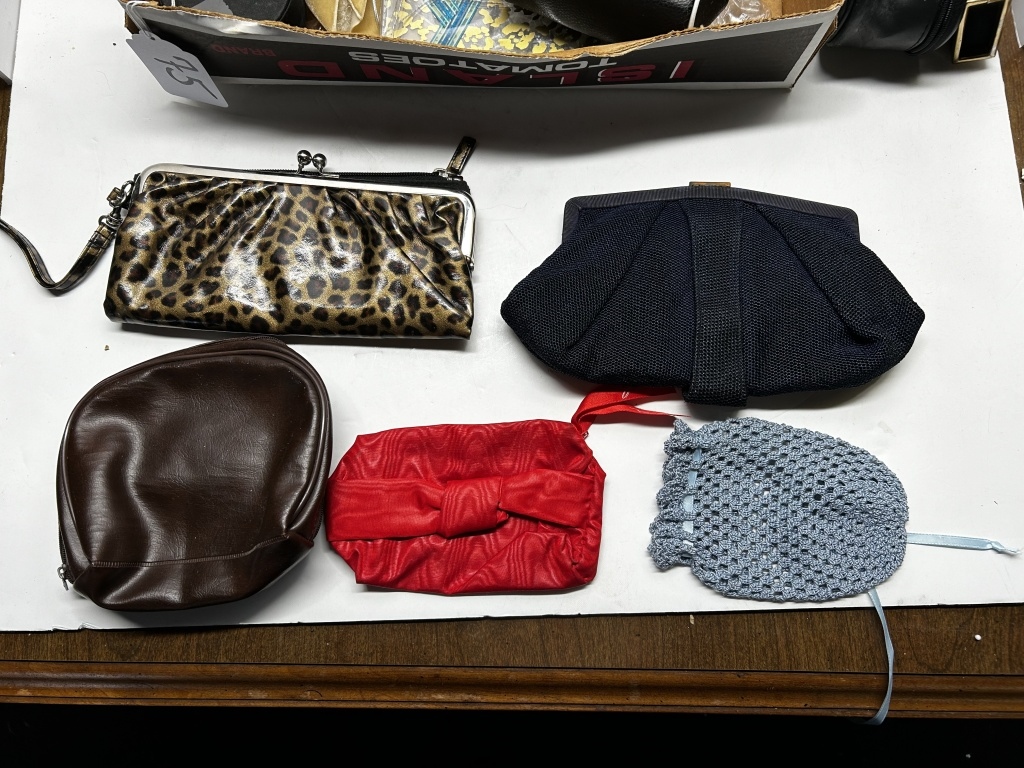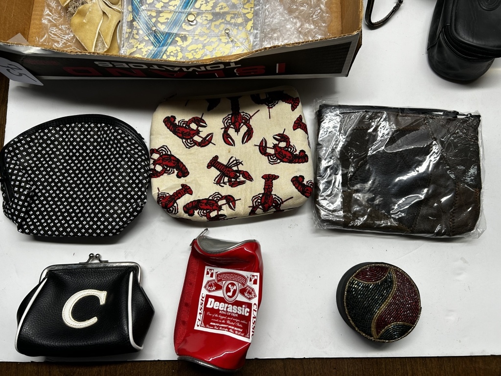 BOX OF MISCELLANEOUS VINTAGE PURSES, SOME WITH METAL CLASPS, ONE SHAPED LIKE A BEER CAN