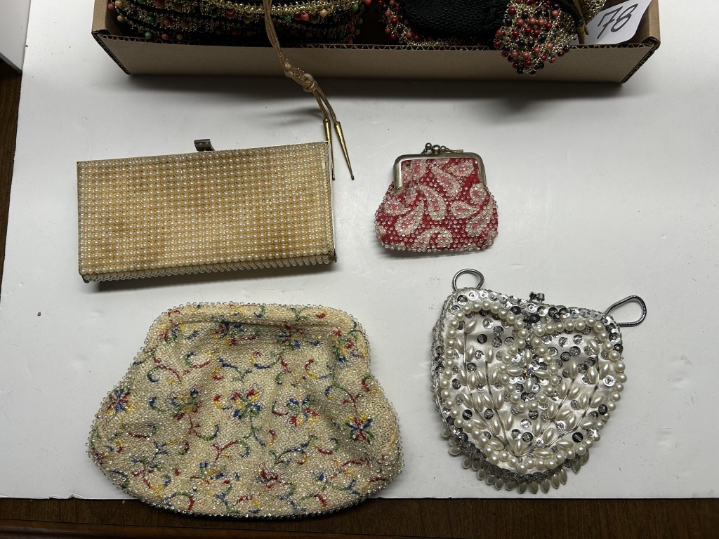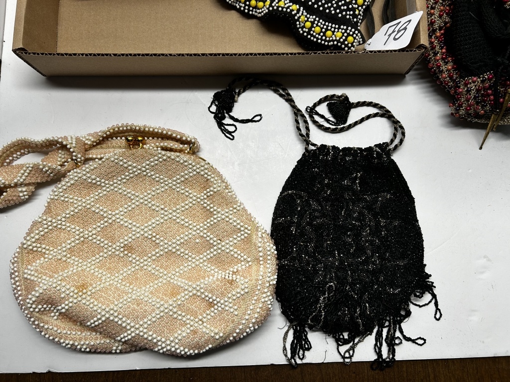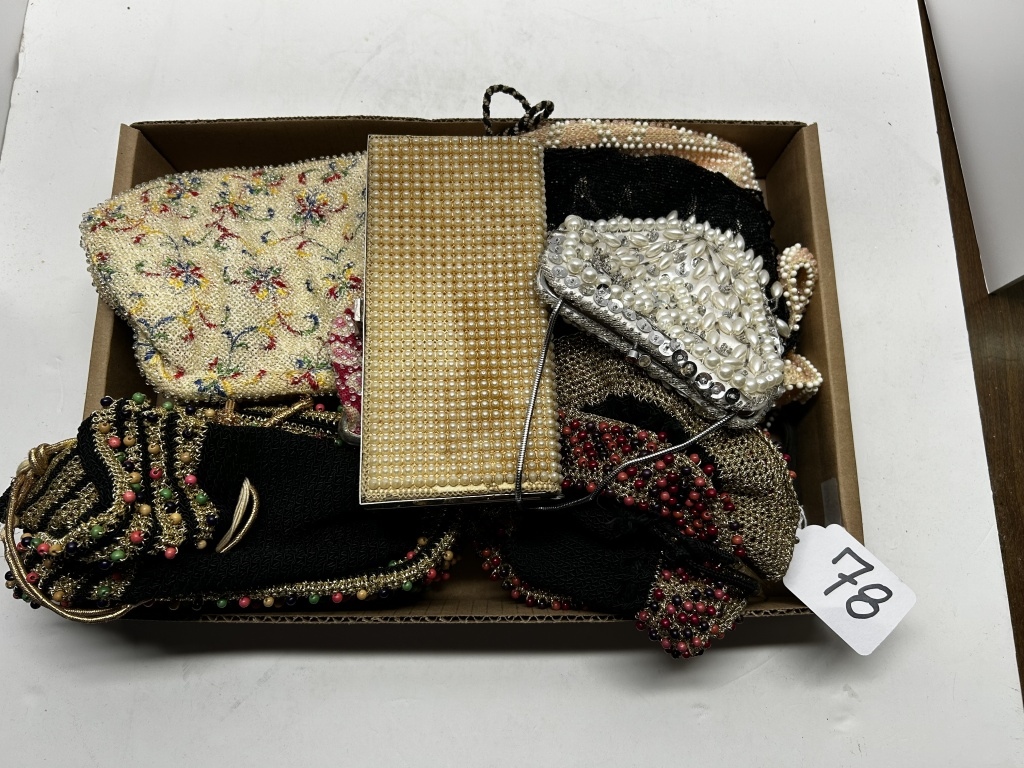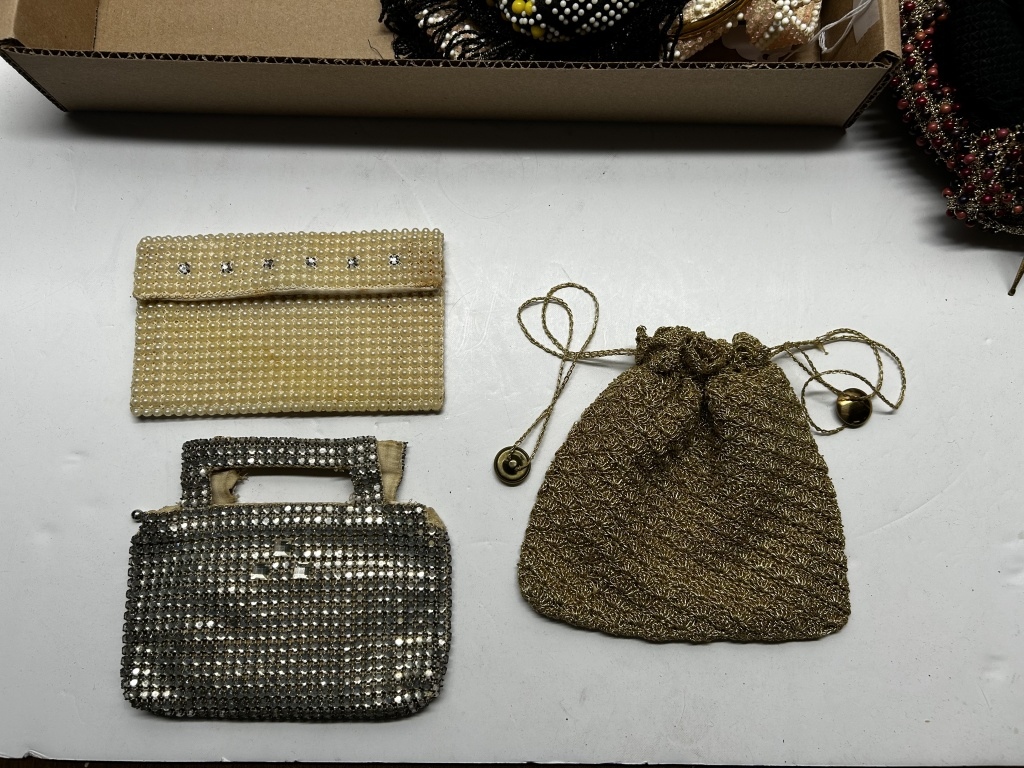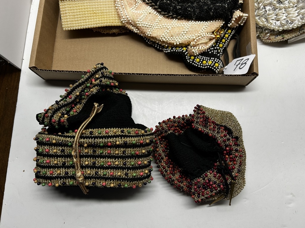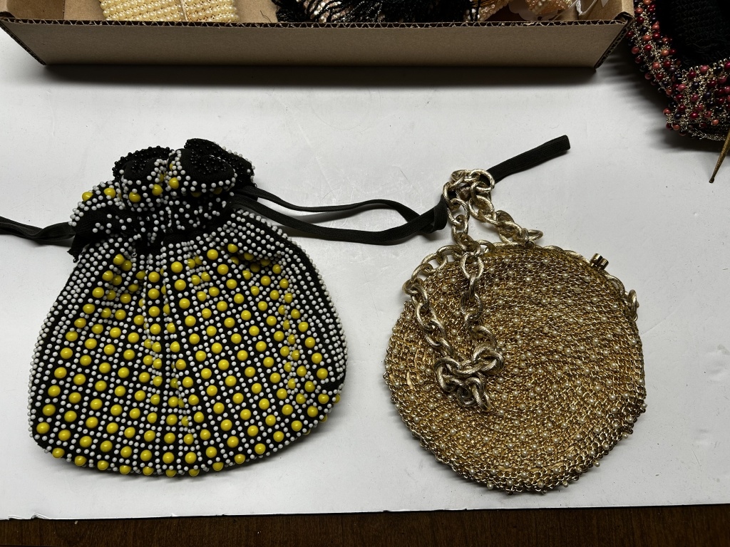 BOX OF MISCELLANEOUS VINTAGE PURSES, BEADED POUCH PURSES, DRAWSTRING PURSES, WRISTLETS, WALLETS