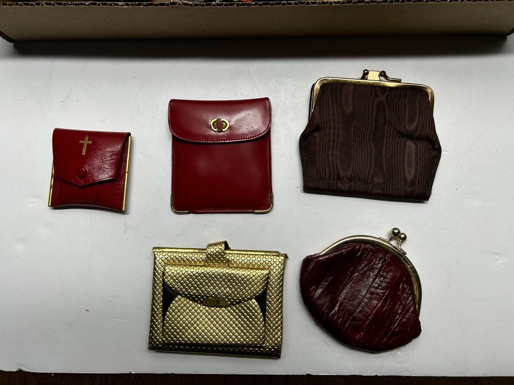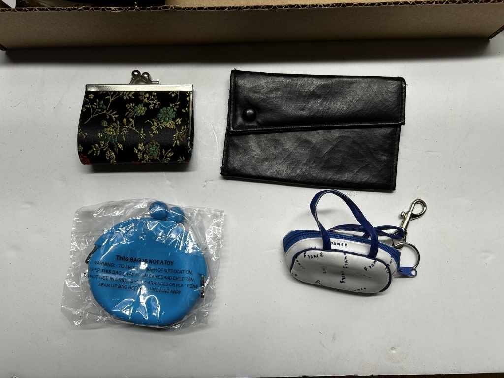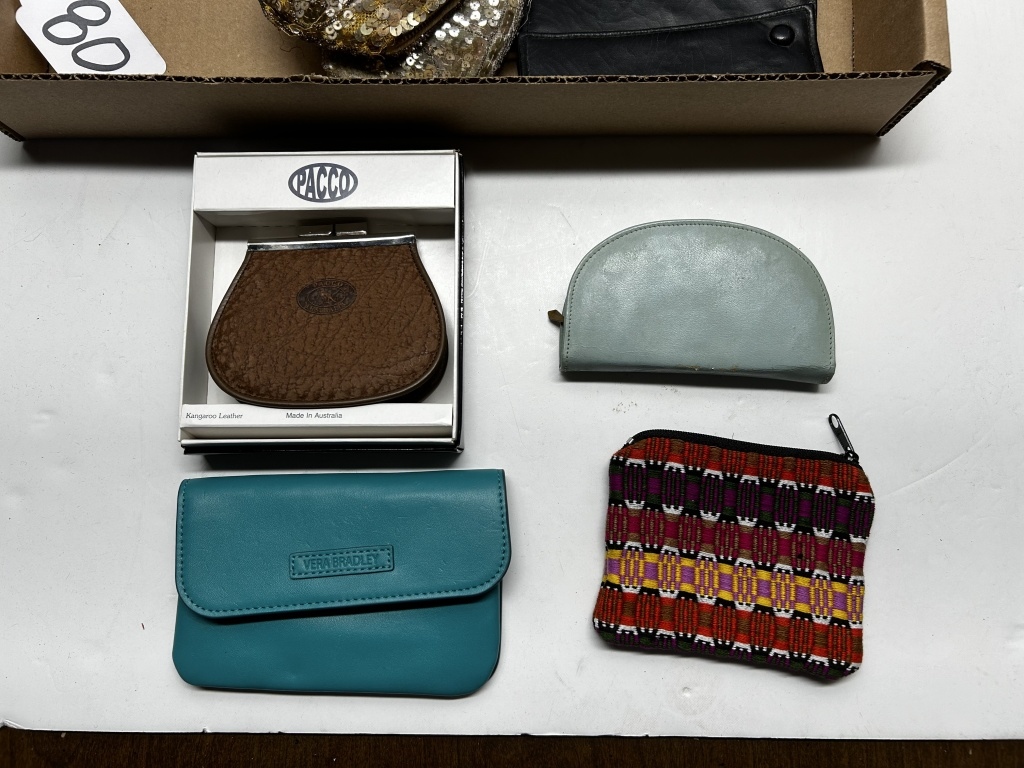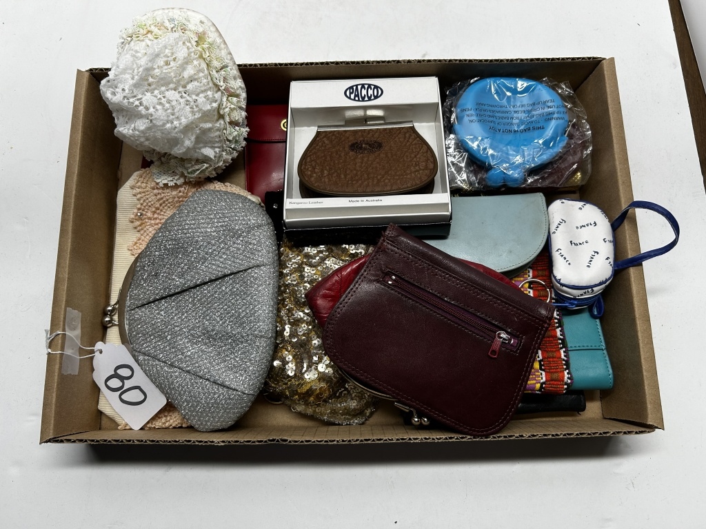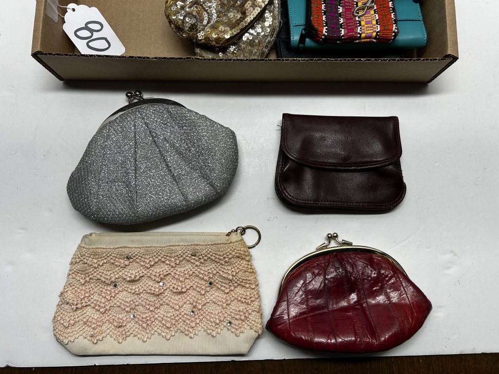 BOX OF MISCELLANEOUS VINTAGE PURSES, VARIOUS WALLETS AND COIN POUCHES, VARIOUS SEQUIN PURSES