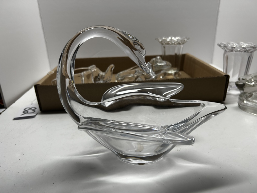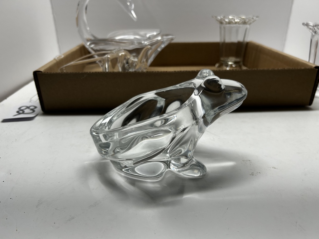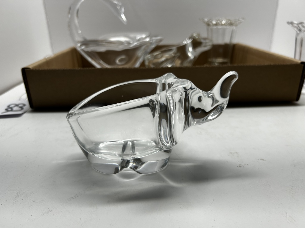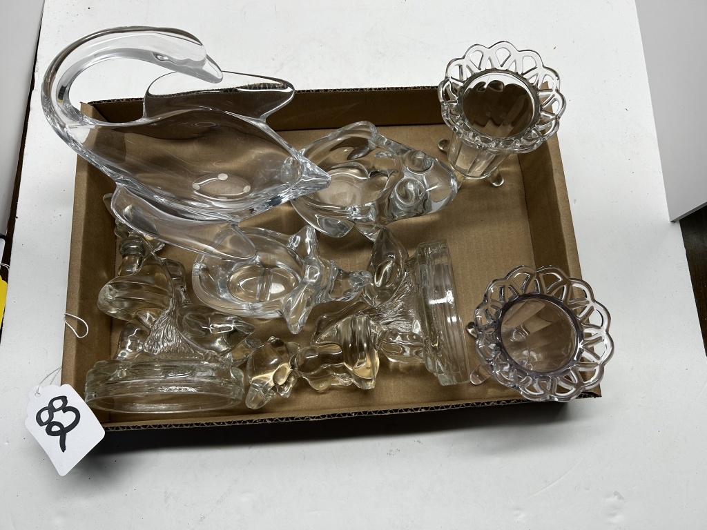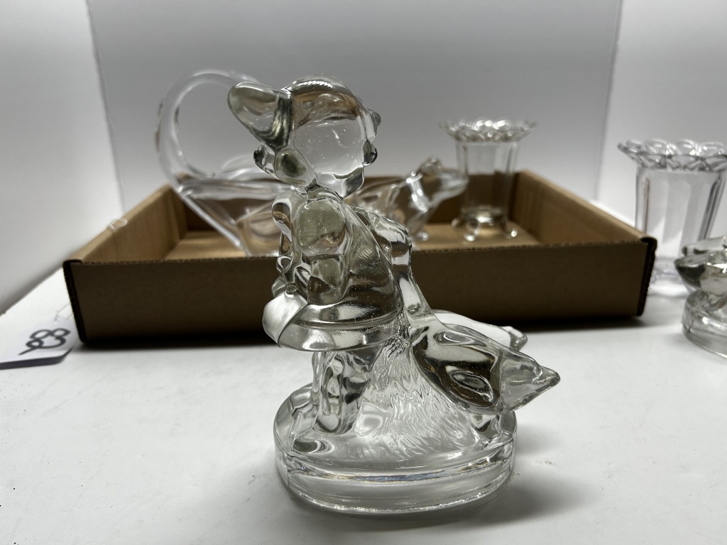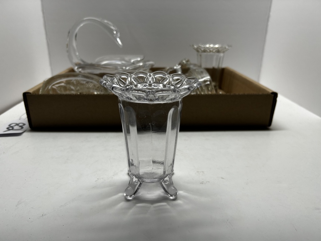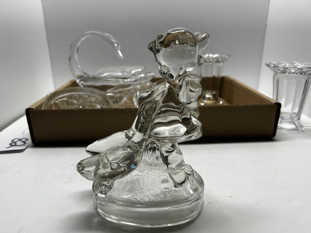 BOX OF MISCELLANEOUS ANTIQUE GLASSWARE, OE GLASS VASE, ONE MAN WITH DUCK SHAPED DISH, ONE ELEPHANT SHAPED DISH, ONE FROG SHAPED DISH, ONE SWAN SHAPED DISH