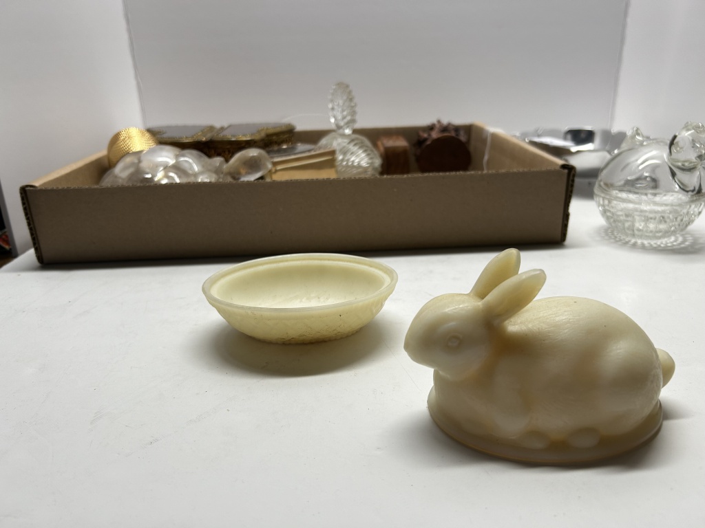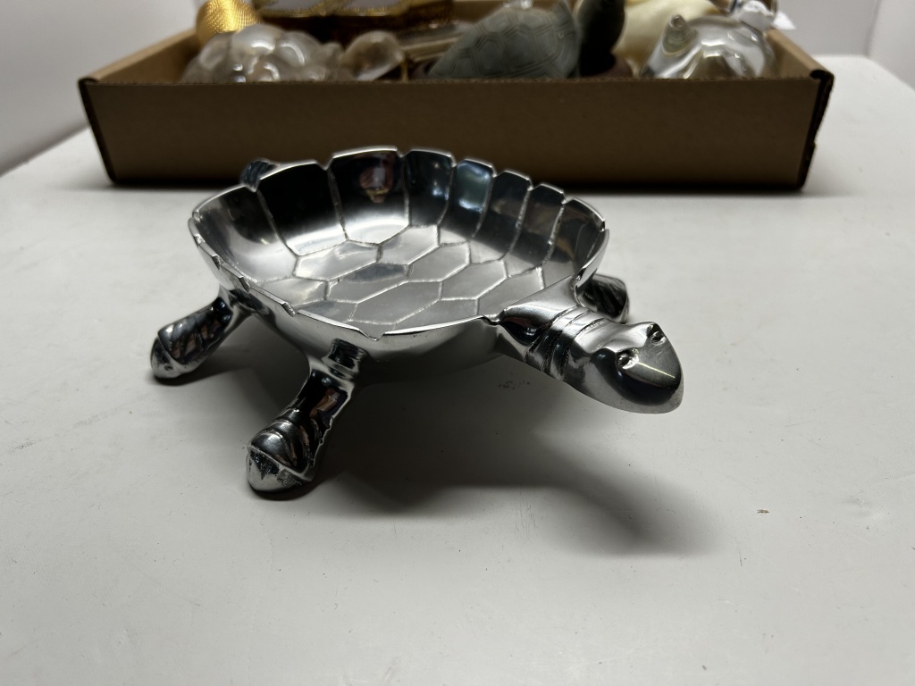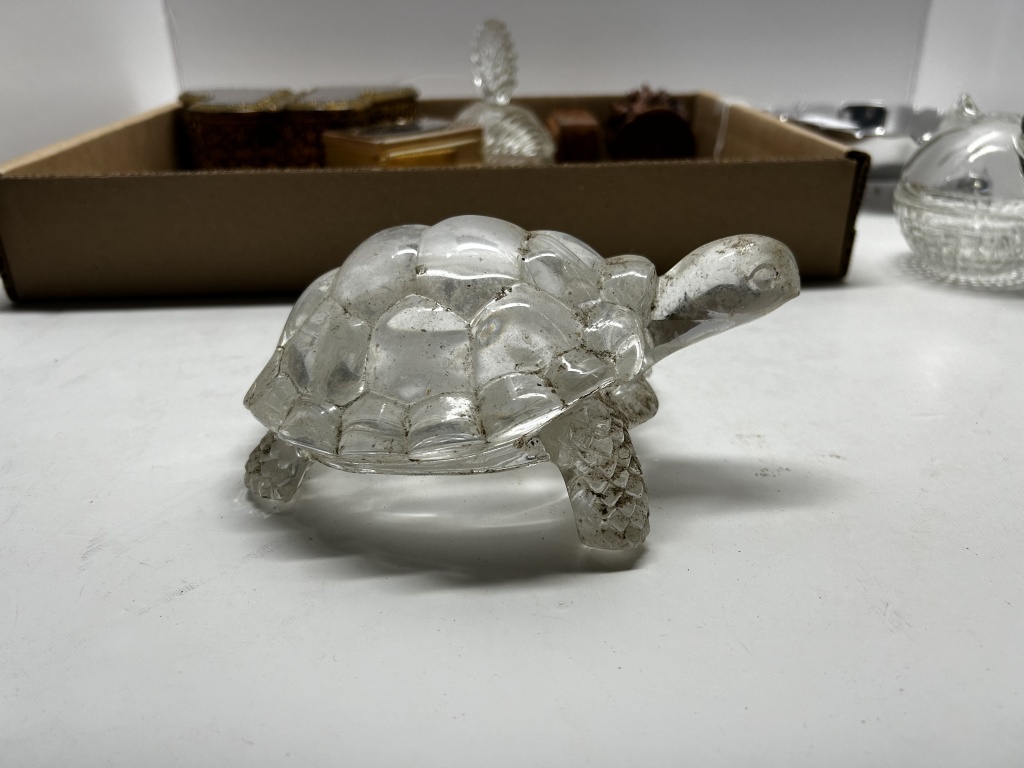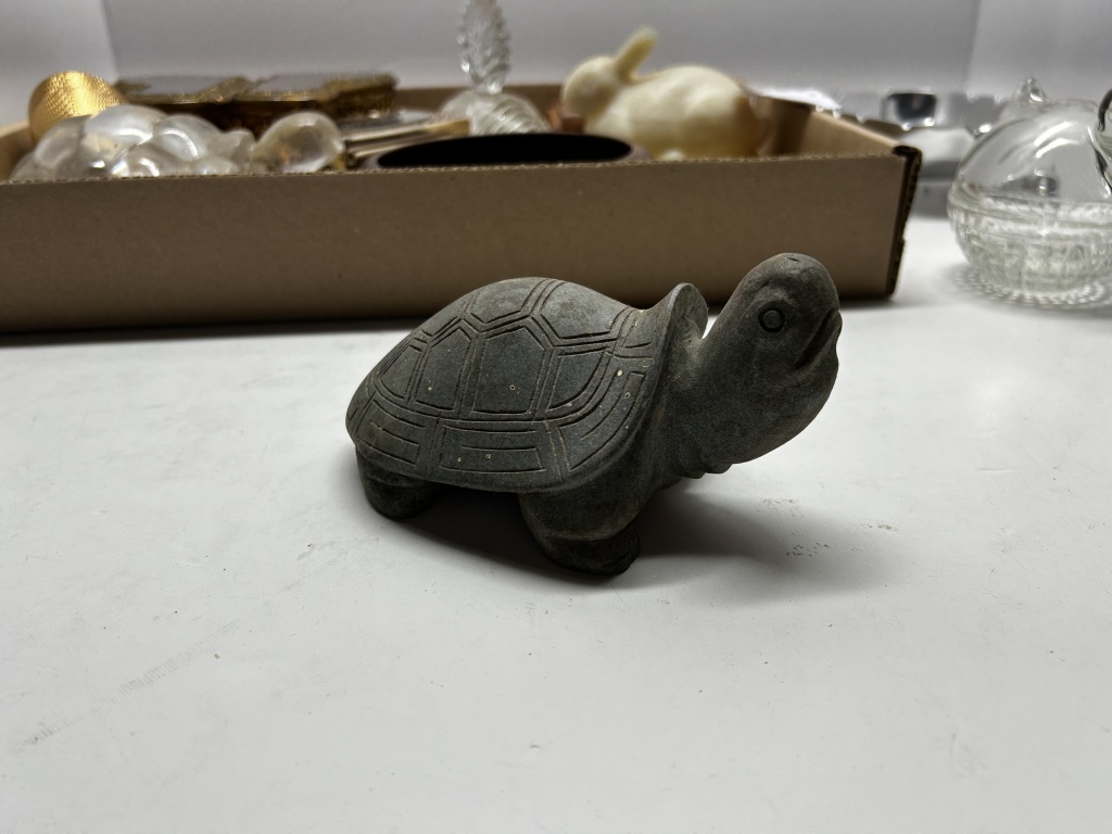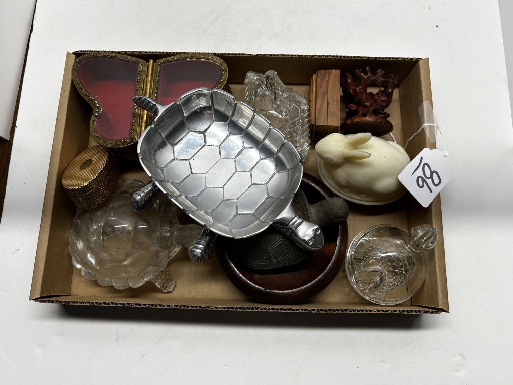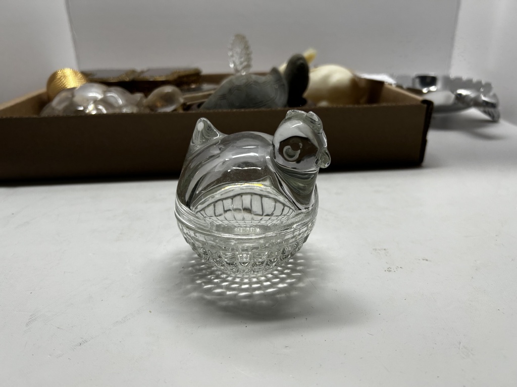 BOX OF MISCELLANEOUS DISHES/BOXES, SILVER TURTLE SHAPED DISH, GLASS CHICKEN SHAPED LIDDED DISH, STONE TURTLE SHAPED PAPERWEIGHT, WOODEN DISH, WHITE GLASS BUNNY LIDDED DISH, GLASS TURTLE SHAPED PAPERWEIGHT, GOLD LIDDED