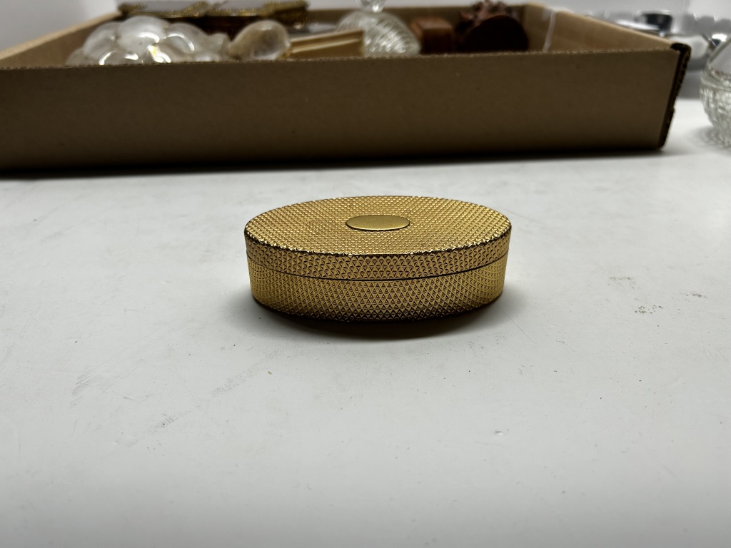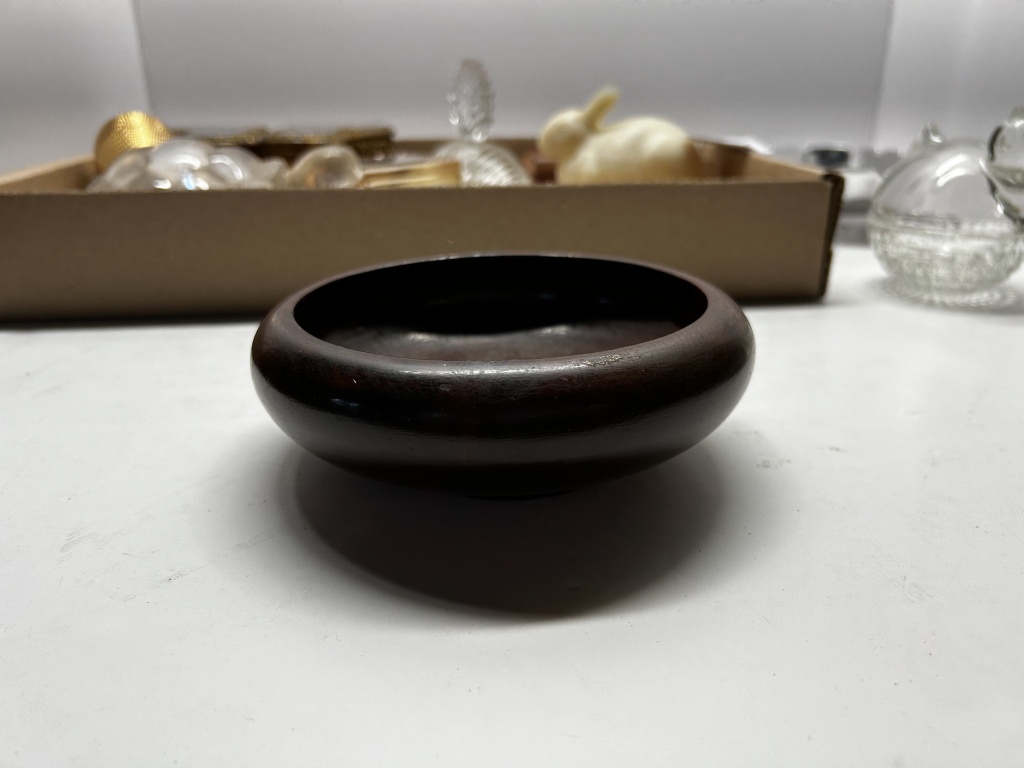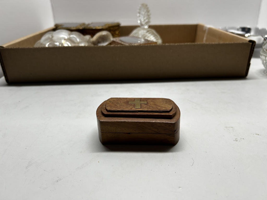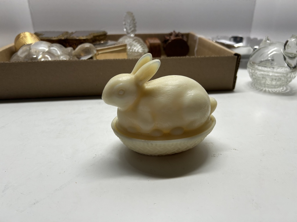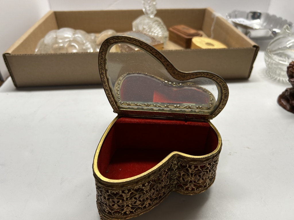 BOX OF MISCELLANEOUS DISHES/BOXES, SILVER TURTLE SHAPED DISH, GLASS CHICKEN SHAPED LIDDED DISH, STONE TURTLE SHAPED PAPERWEIGHT, WOODEN DISH, WHITE GLASS BUNNY LIDDED DISH, GLASS TURTLE SHAPED PAPERWEIGHT, GOLD LIDDED