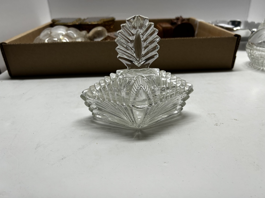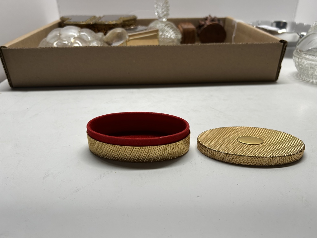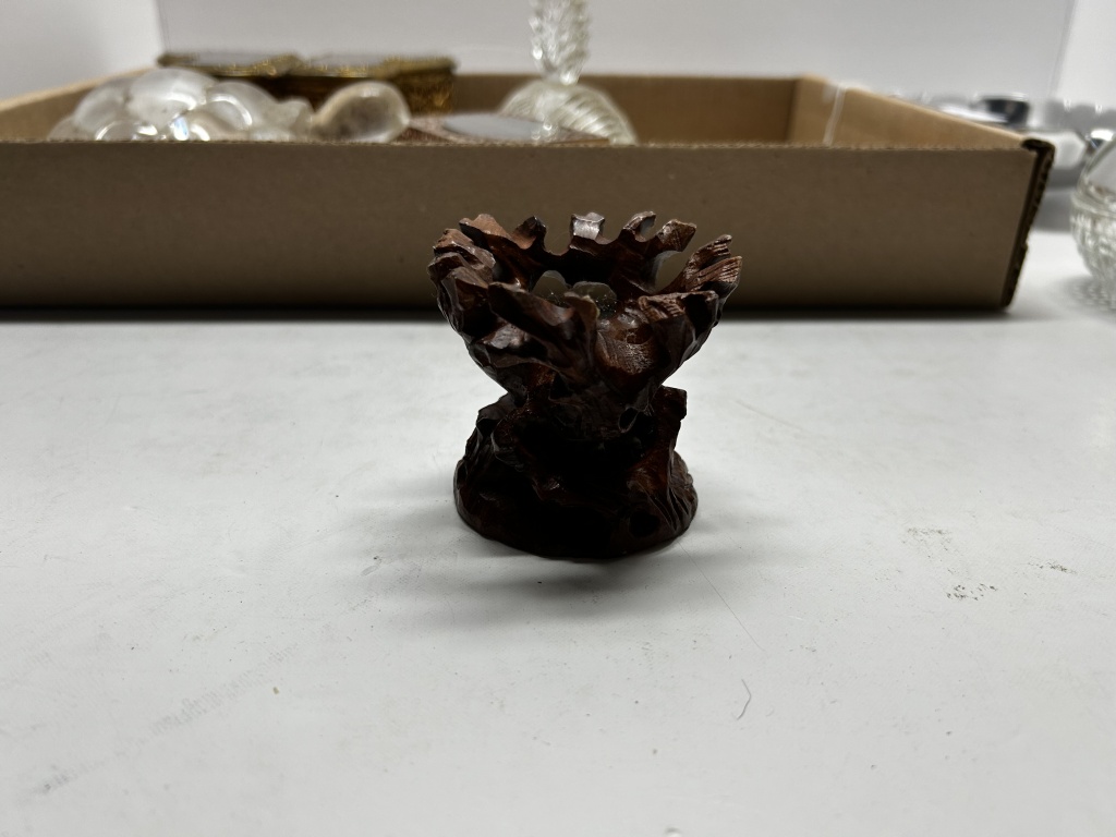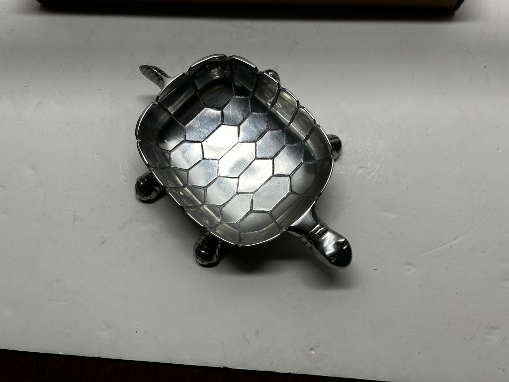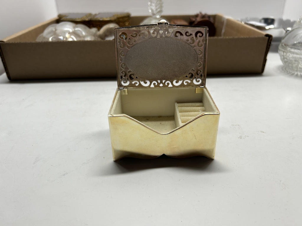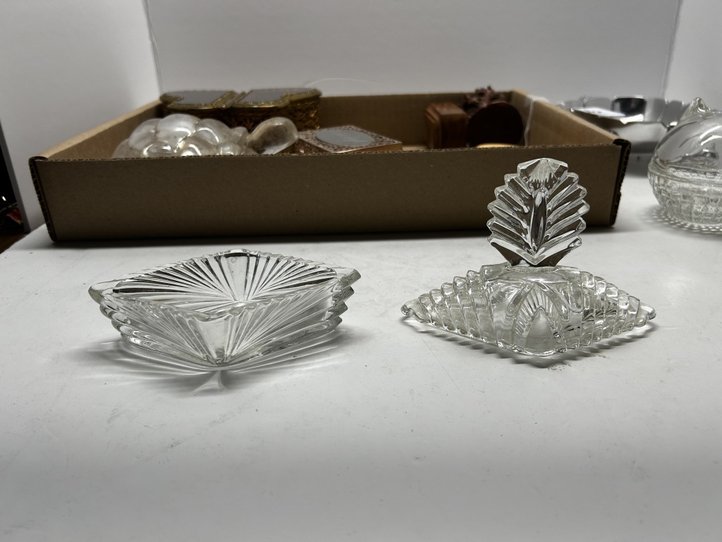 BOX OF MISCELLANEOUS DISHES/BOXES, SILVER TURTLE SHAPED DISH, GLASS CHICKEN SHAPED LIDDED DISH, STONE TURTLE SHAPED PAPERWEIGHT, WOODEN DISH, WHITE GLASS BUNNY LIDDED DISH, GLASS TURTLE SHAPED PAPERWEIGHT, GOLD LIDDED