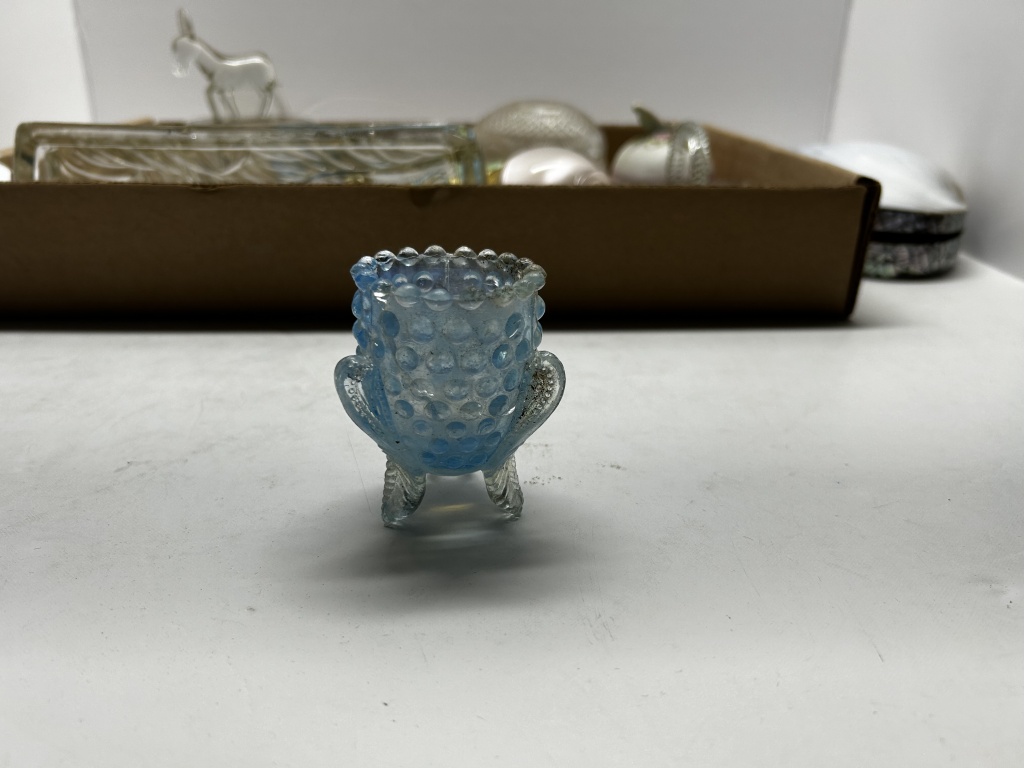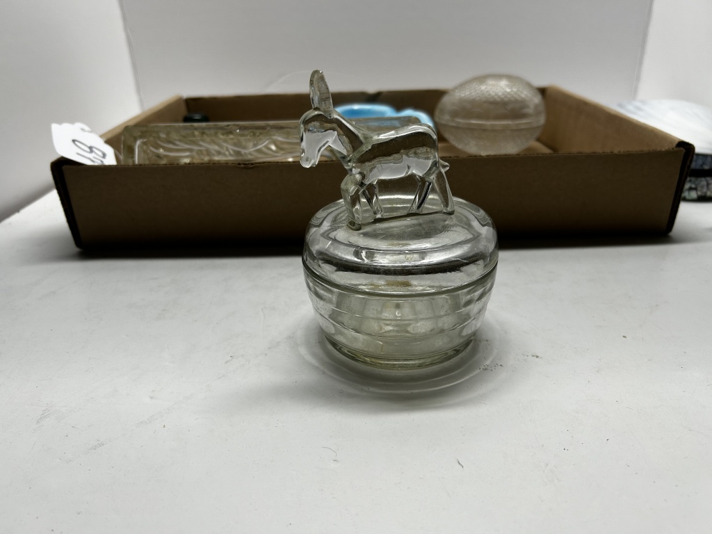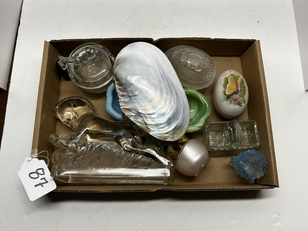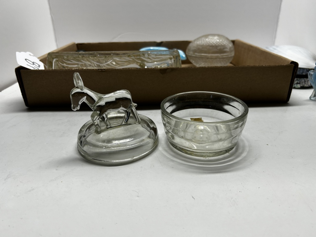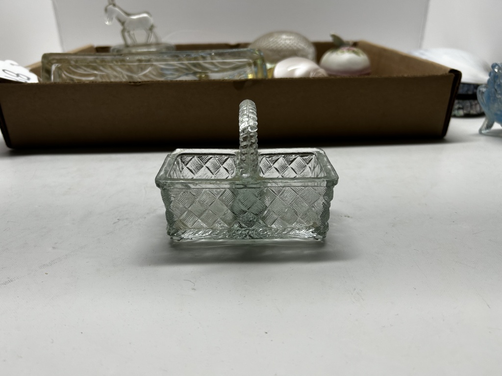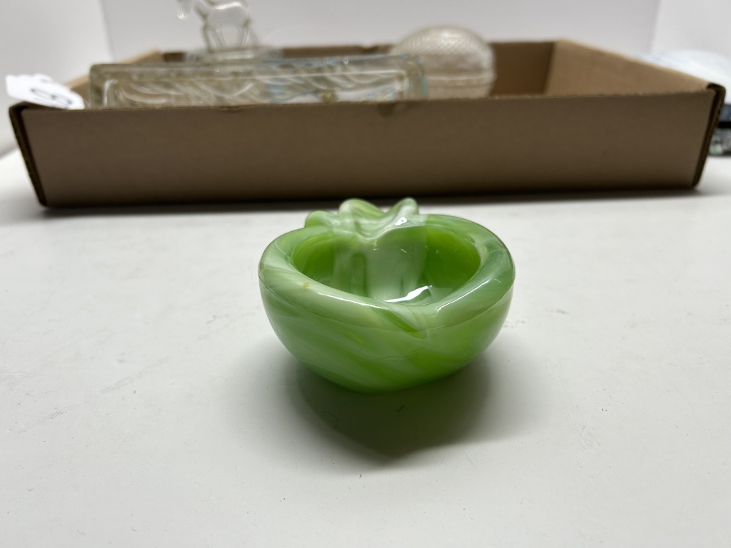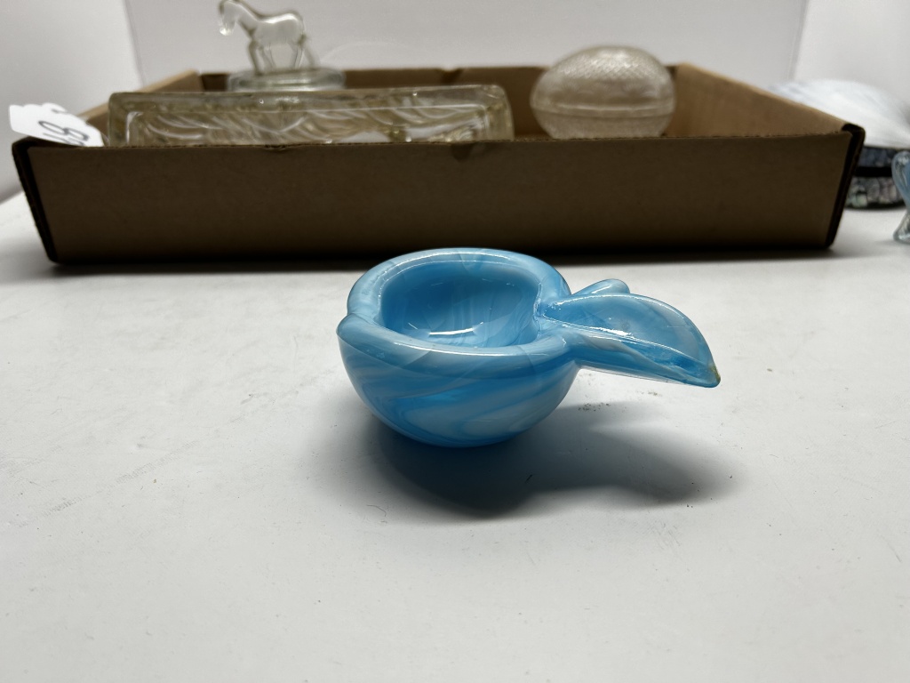 BOX OF MISCELLANEOUS ANTIQUE DISHES, CLAM SHAPED DISH, MINI BLUE GLASS DISH, MINI GLASS BASKET, MINI BUTTERFLY DISH, GLASS LOTION BOTTLE, GREEN AND BLUE MARBLE APPLE SHAPED DISHES, HORSE SHAPED DISH, DONKEY SHAPED