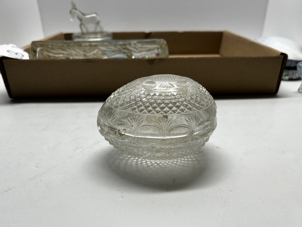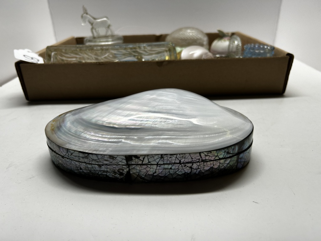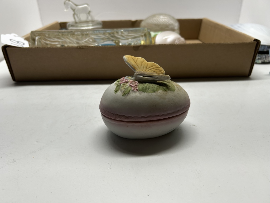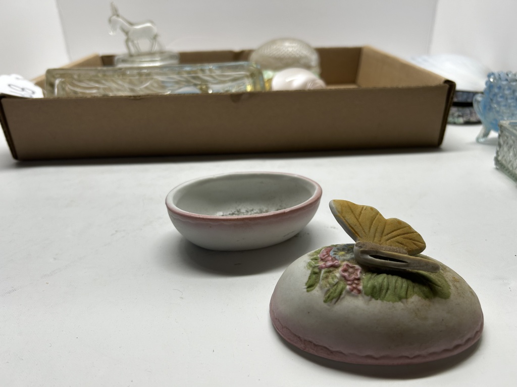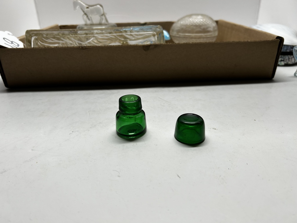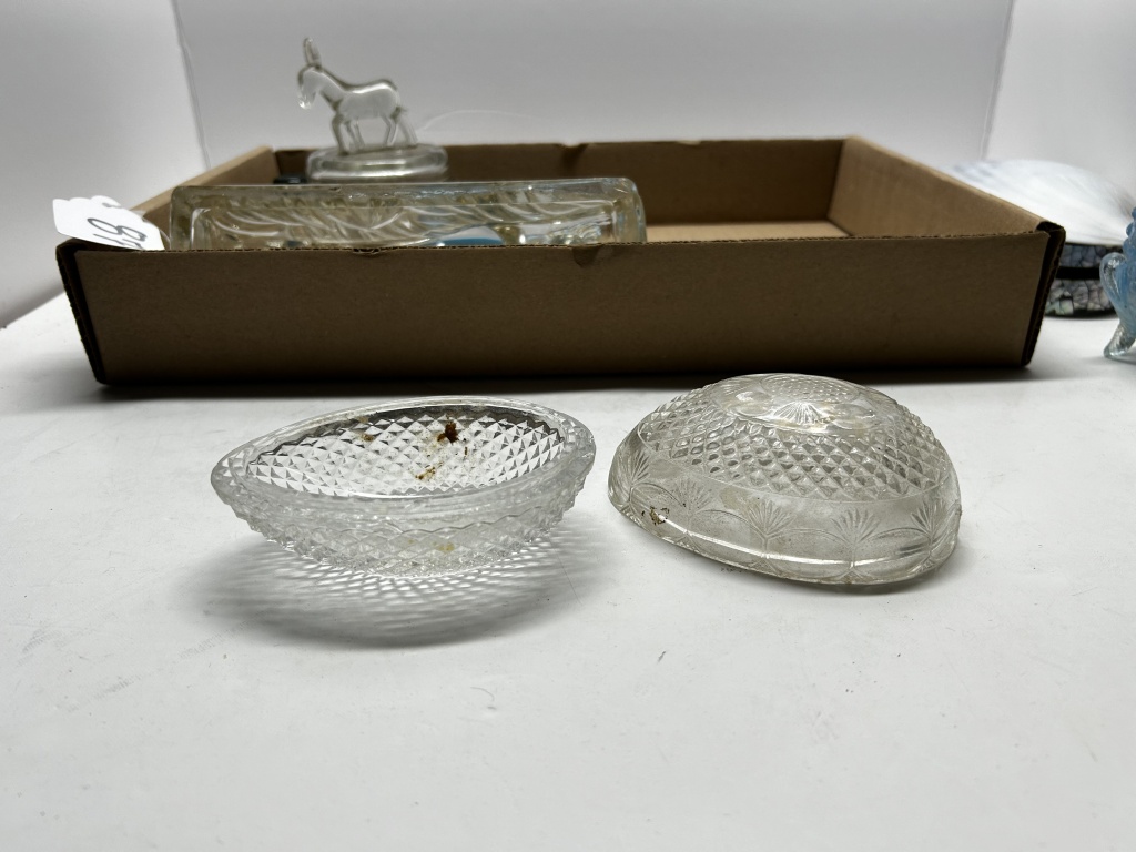 BOX OF MISCELLANEOUS ANTIQUE DISHES, CLAM SHAPED DISH, MINI BLUE GLASS DISH, MINI GLASS BASKET, MINI BUTTERFLY DISH, GLASS LOTION BOTTLE, GREEN AND BLUE MARBLE APPLE SHAPED DISHES, HORSE SHAPED DISH, DONKEY SHAPED