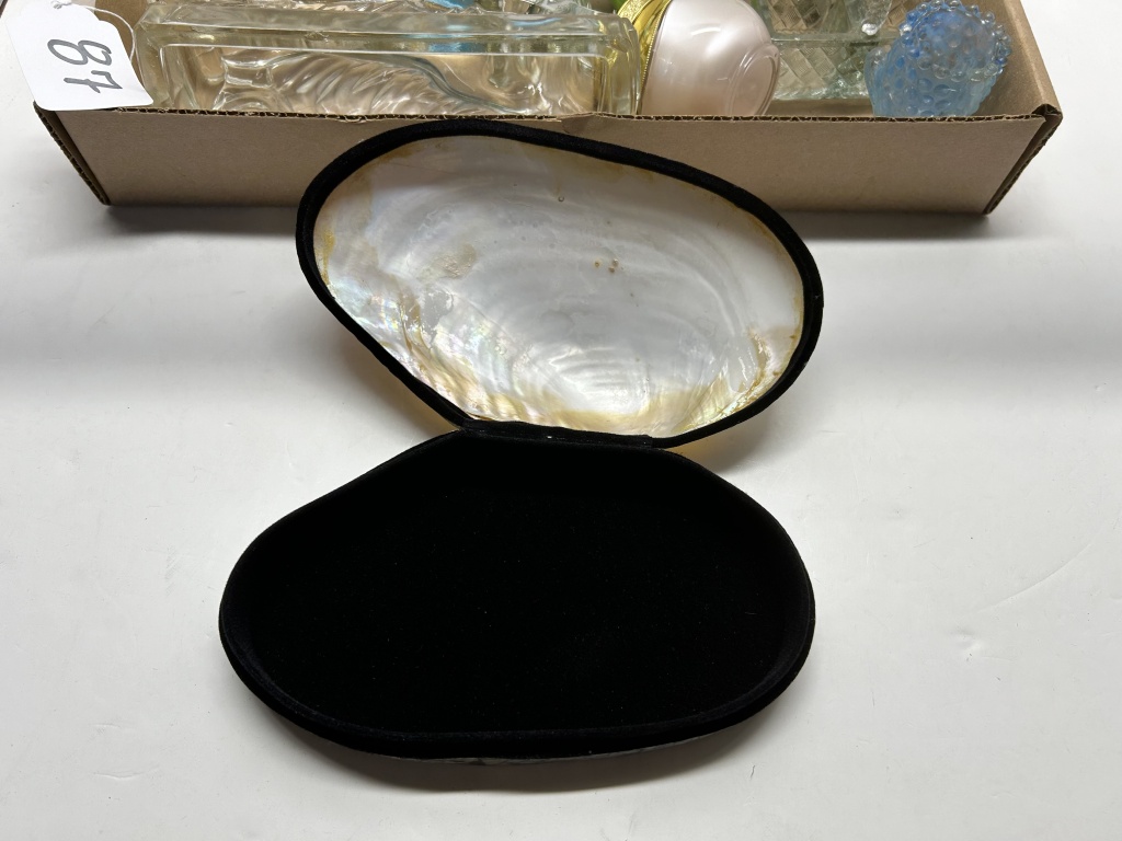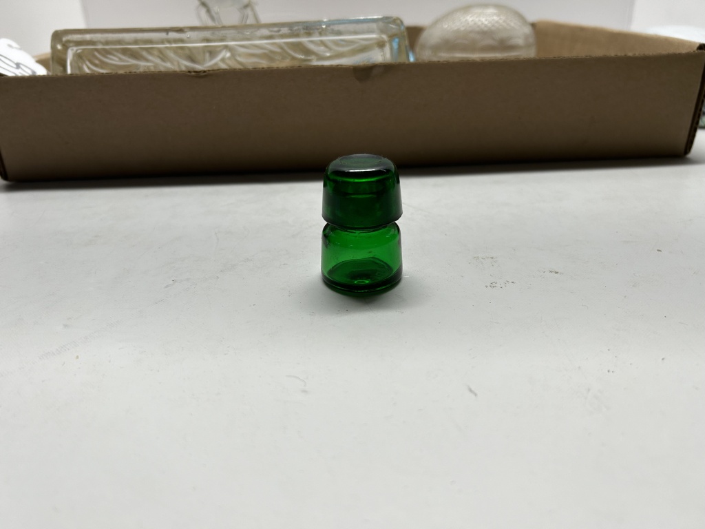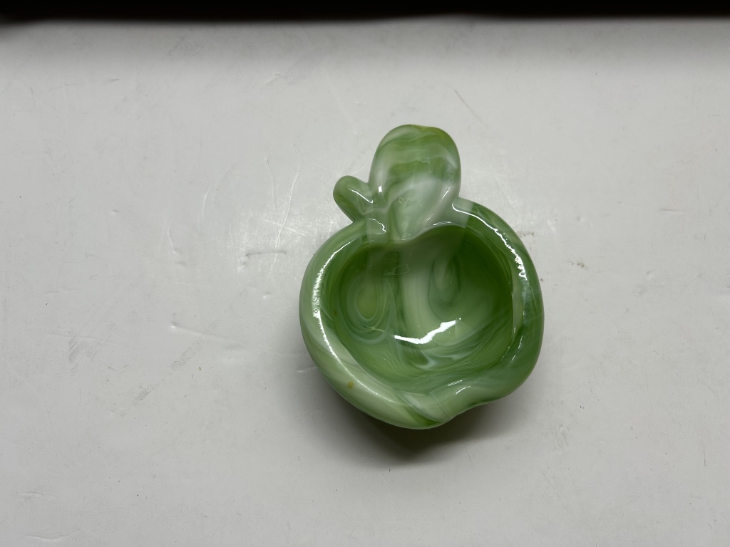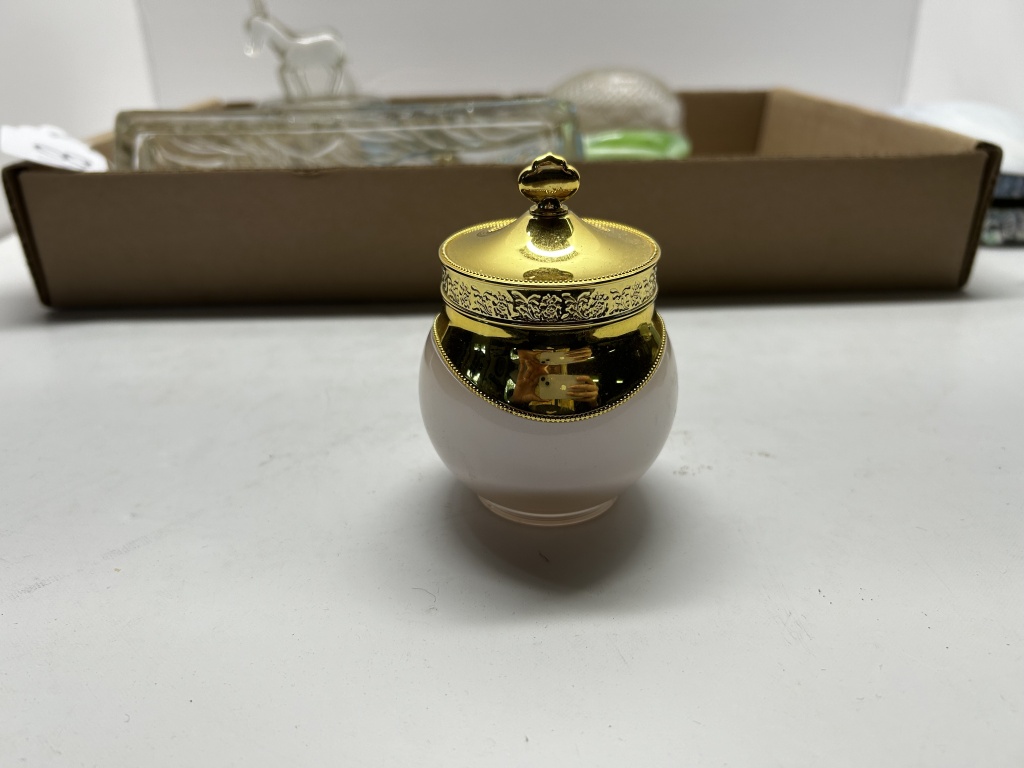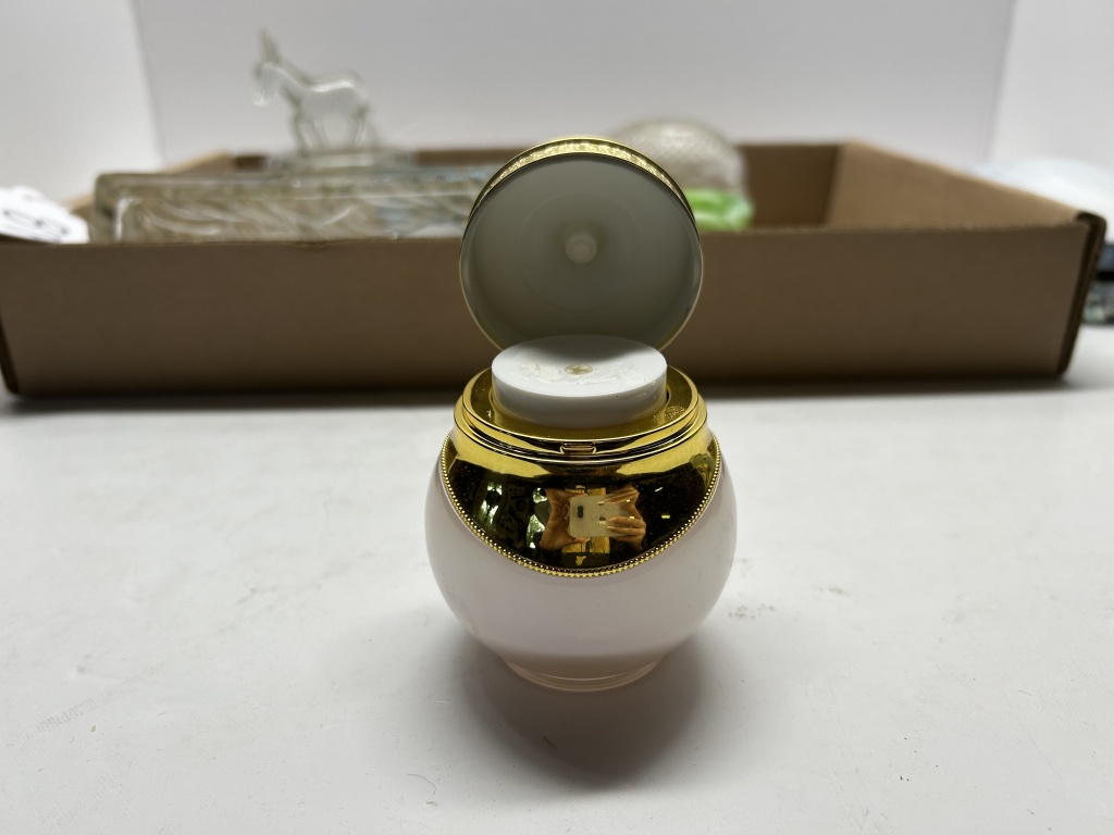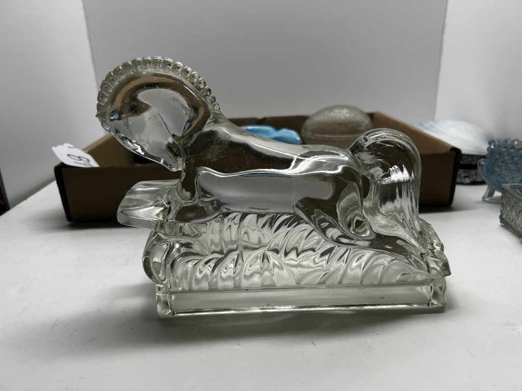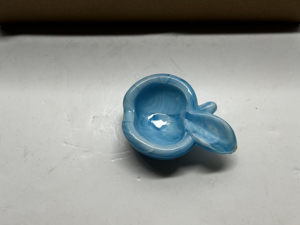 BOX OF MISCELLANEOUS ANTIQUE DISHES, CLAM SHAPED DISH, MINI BLUE GLASS DISH, MINI GLASS BASKET, MINI BUTTERFLY DISH, GLASS LOTION BOTTLE, GREEN AND BLUE MARBLE APPLE SHAPED DISHES, HORSE SHAPED DISH, DONKEY SHAPED