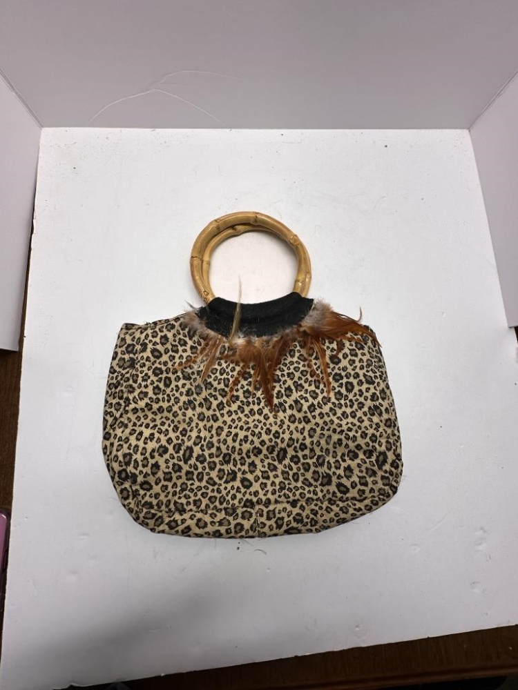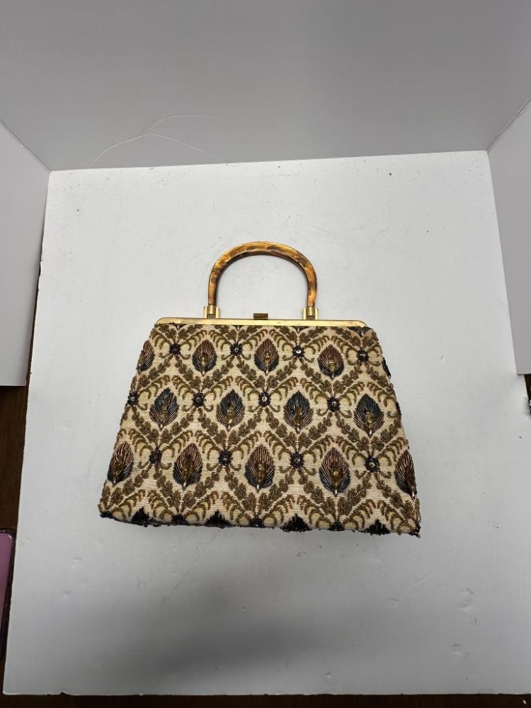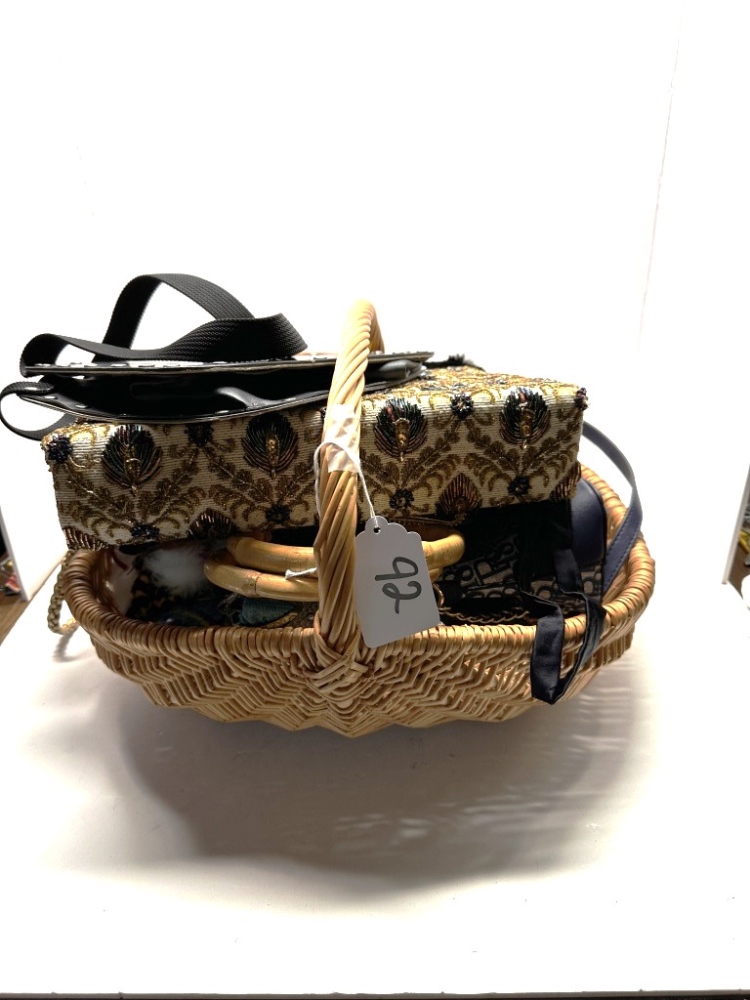 BASKET FULL OF VINTAGE PURSES, ONE PURSE WITH BAMBOO HANDLES, VARIOUS SEQUIN PURSES, VARIOUS FAUX FUR PURSES