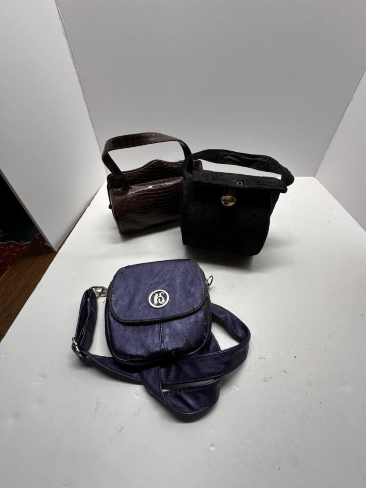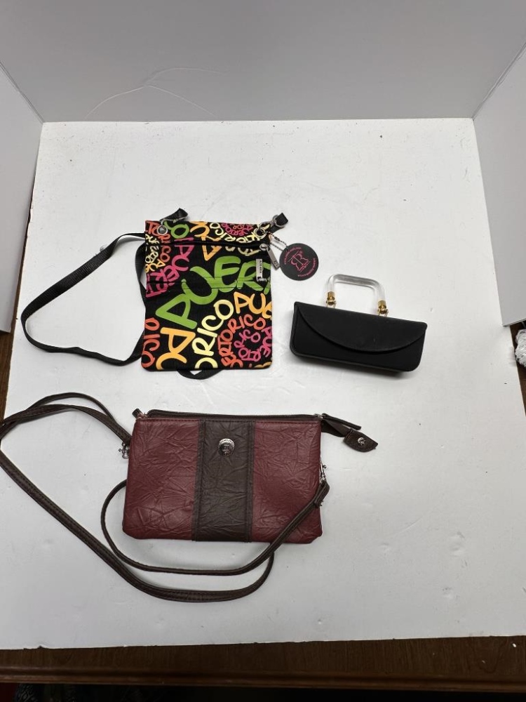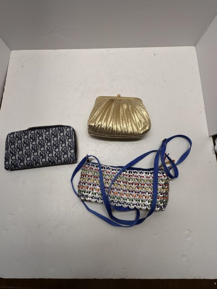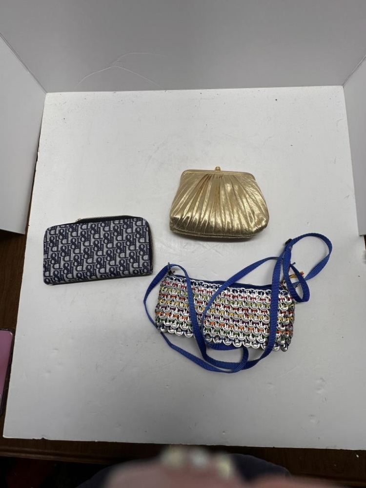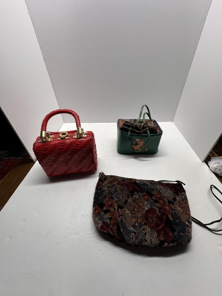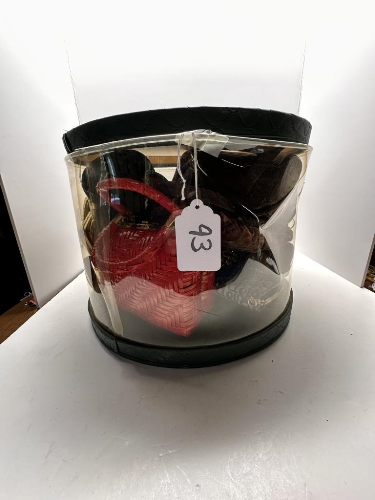 CIRCULAR CASES FULL OF VINTAGE PURSES, VARIOUS WALLET-SIZED PURSES, FLORAL PURSE POUCH, RED WICKER PURSE