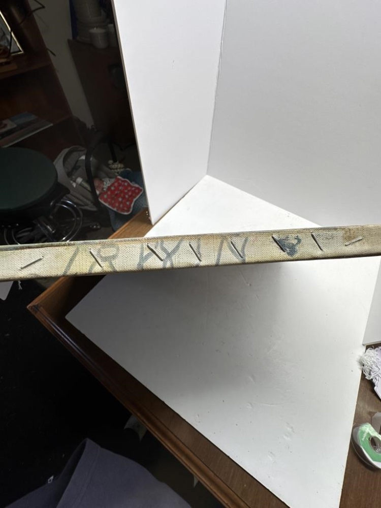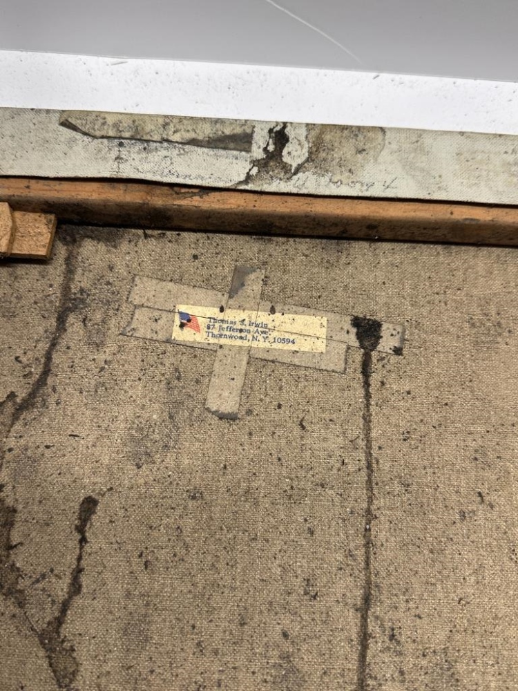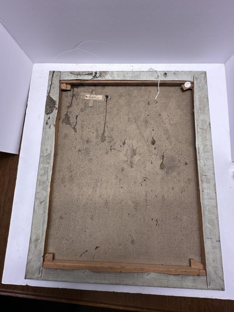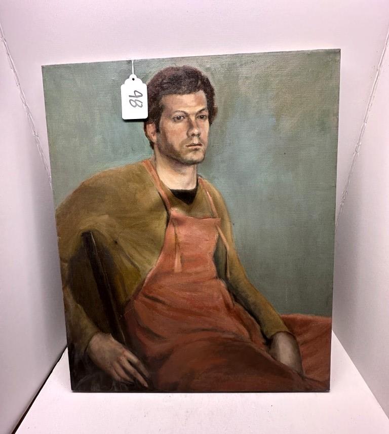 PAINTING ON CANVAS OF MAN IN A RED APRON, “IRWIN” WRITTEN ON EDGE (ARTIST)