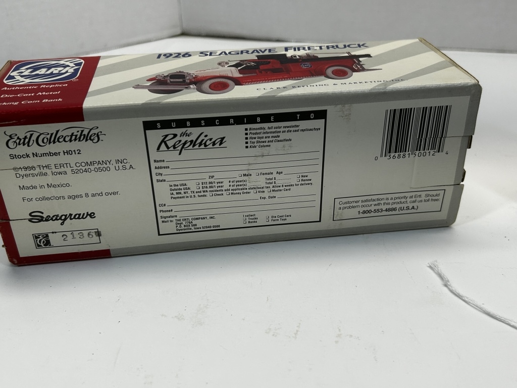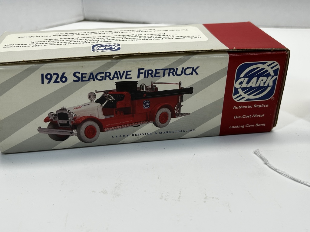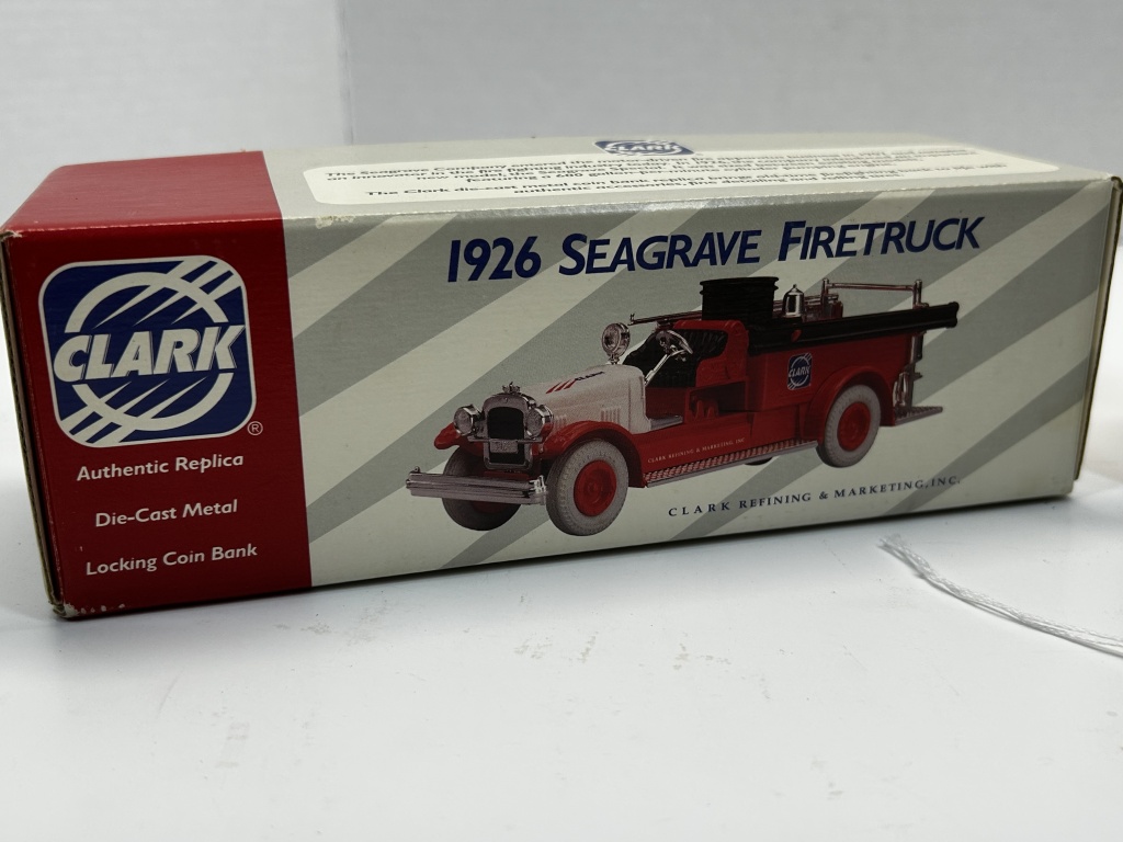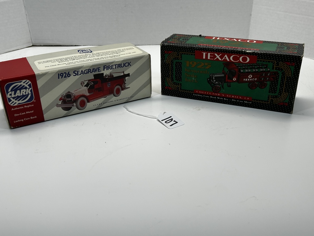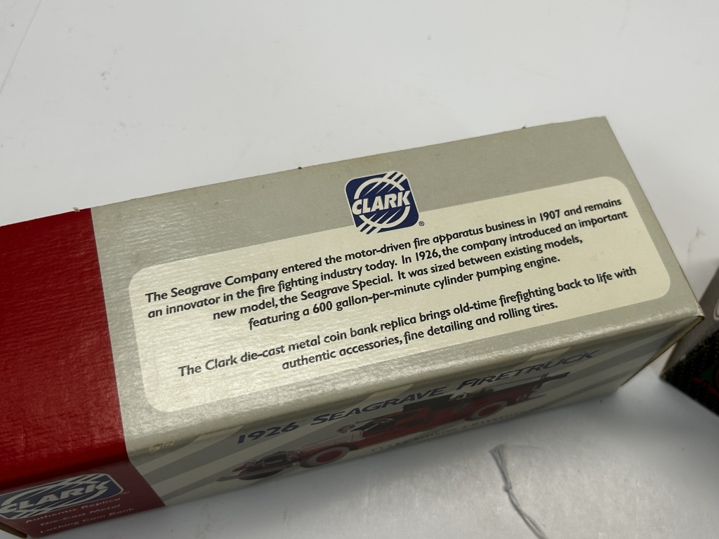 DIE CAST NIB 1/34 SCALE 1926 SEAGRAVE FIRTRUCK CLARK COMPANY #2136 &TEXCO 1925 KENWORTH STAKE TRUCK COLLECTOR SERIES #1822