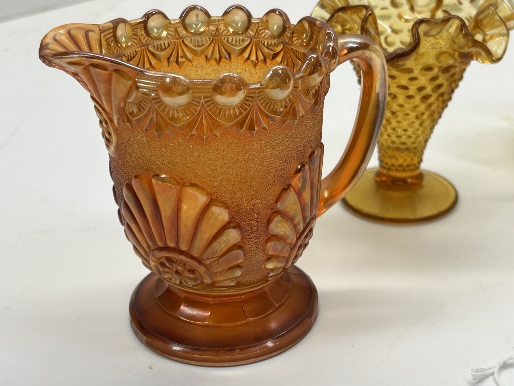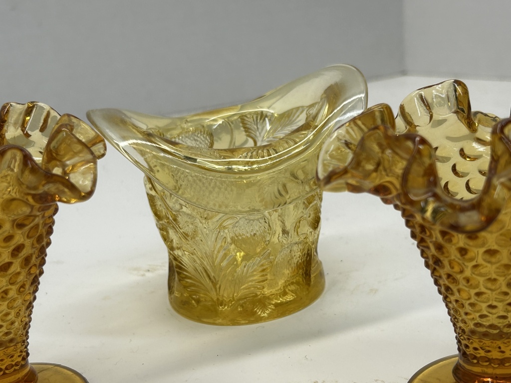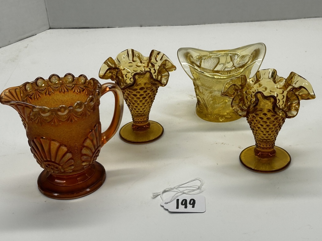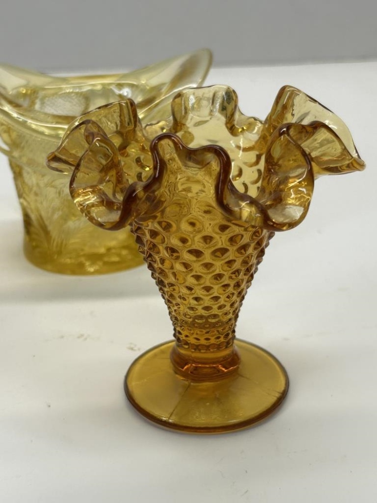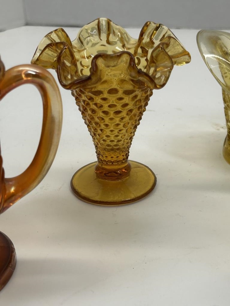 3 VASES, 1 HAT UNMARKED BURNT ORANGE GLASS