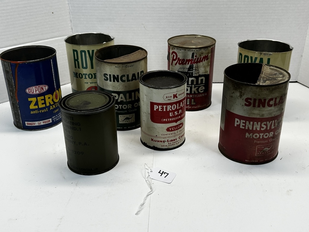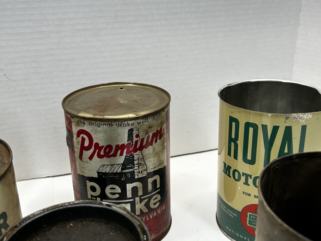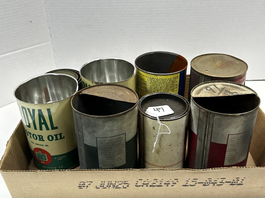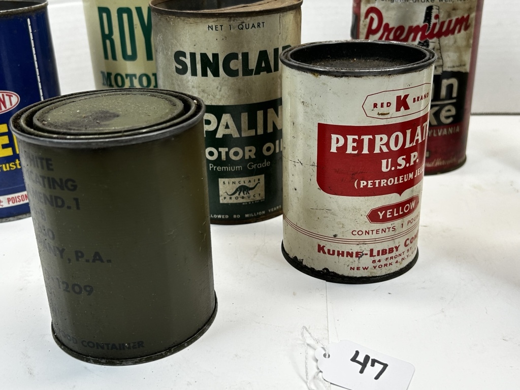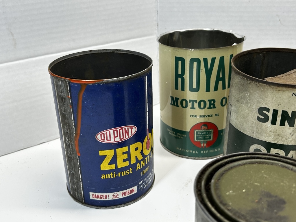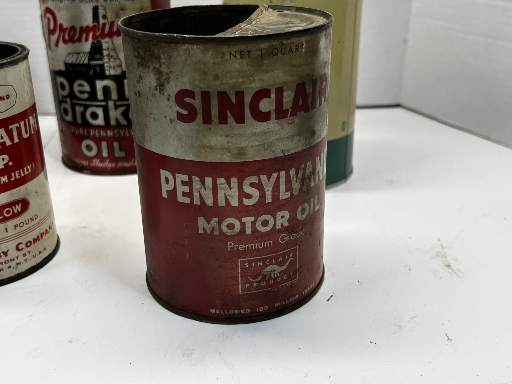 SINCLAIR OIL TINS, PENNS DRAKE, ROYAL, OUT POINT RED K BRAND AND MORE!