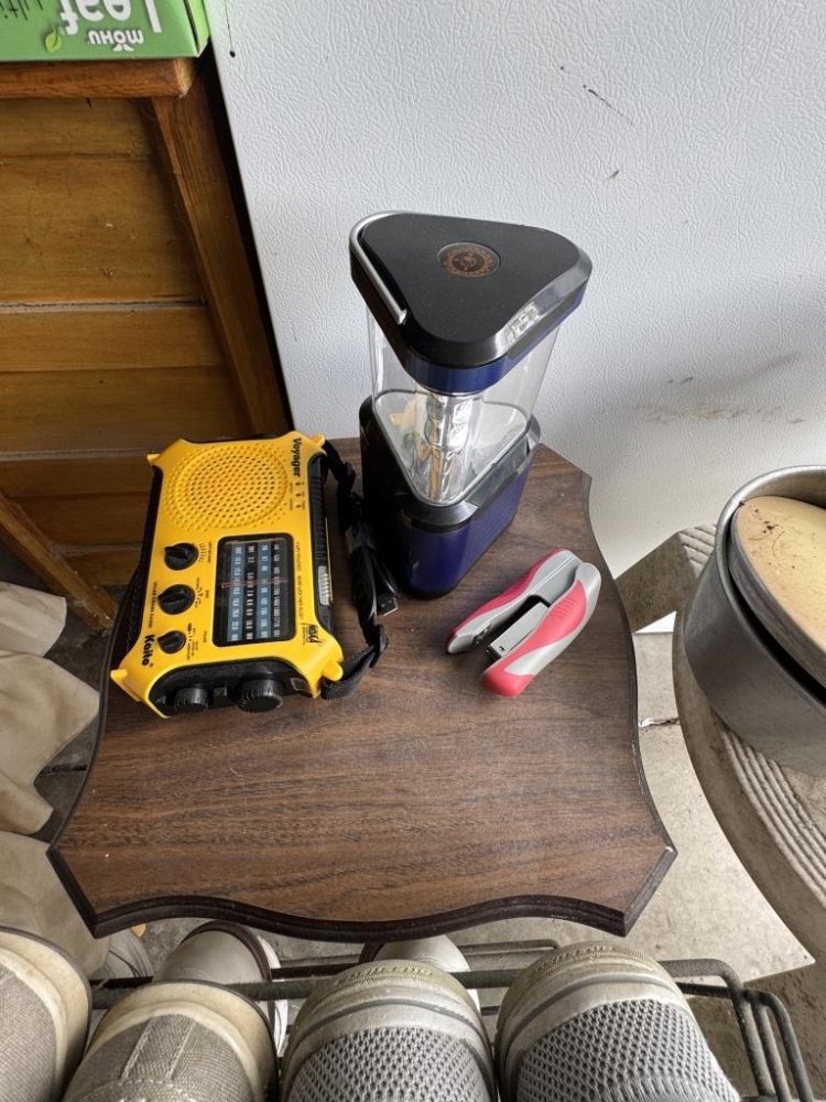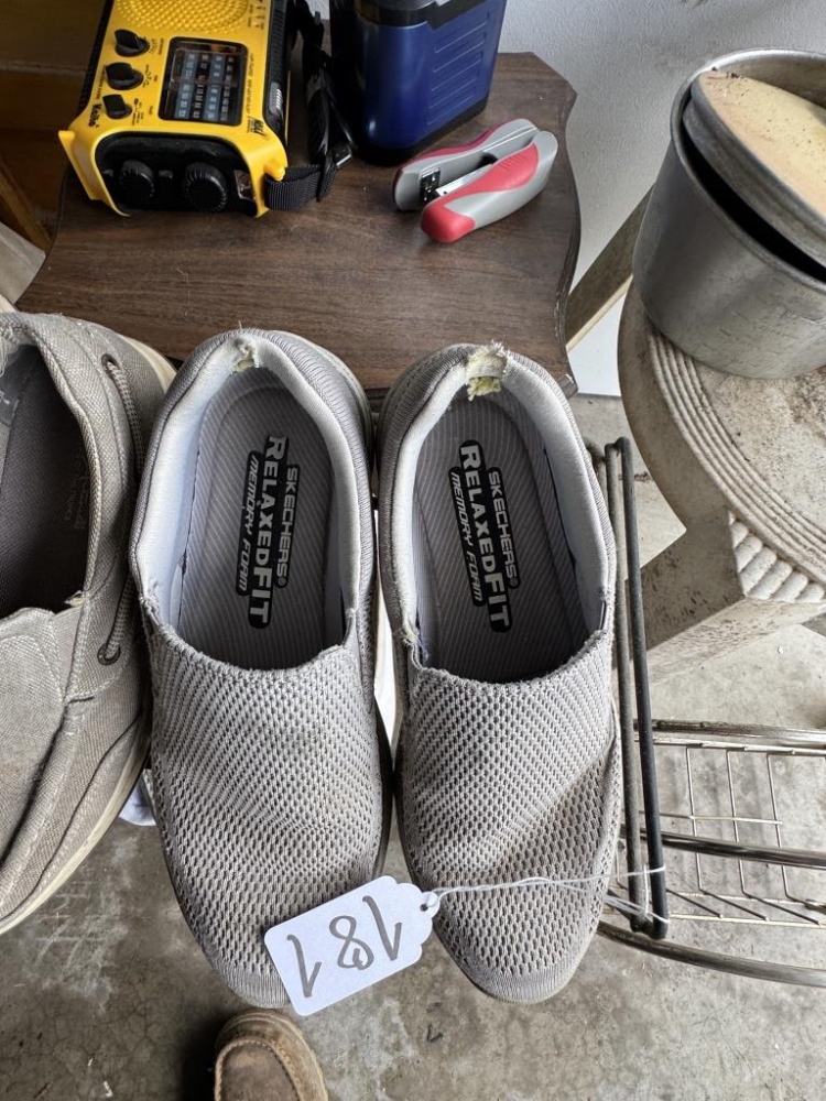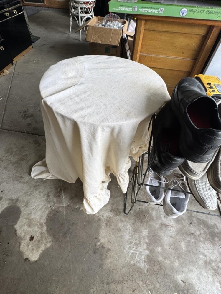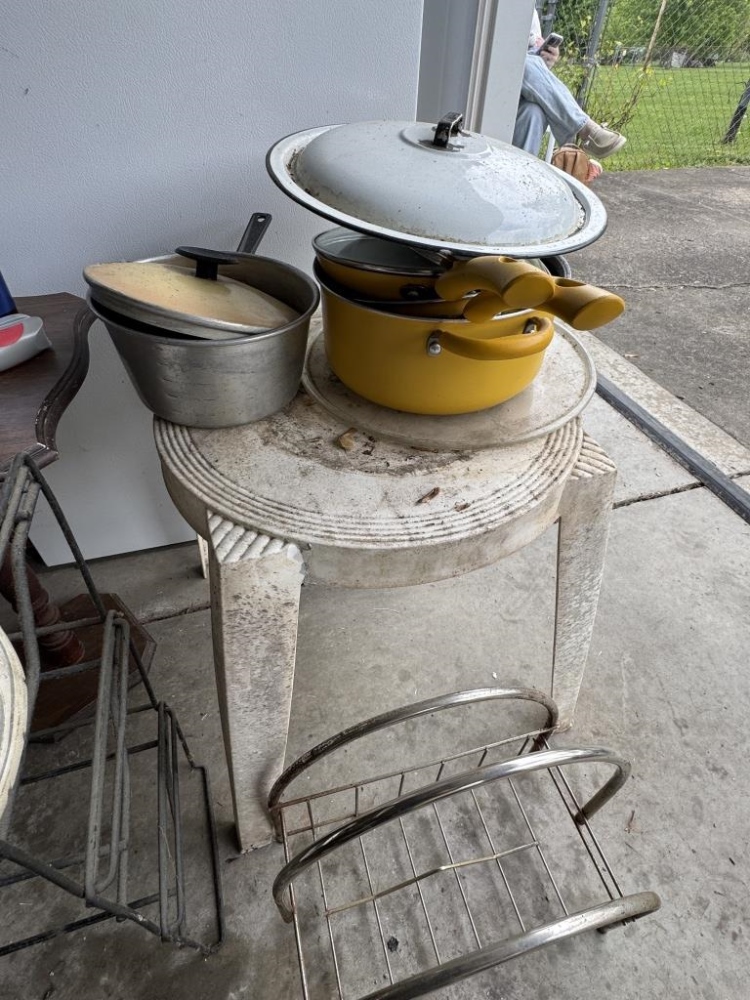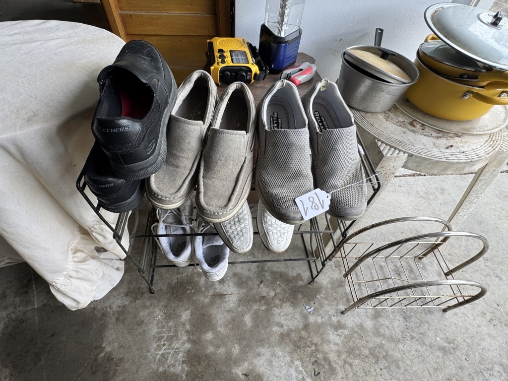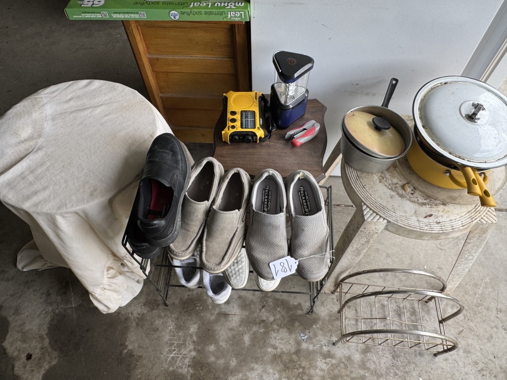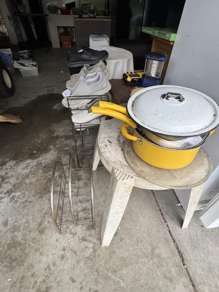 SHOE RACKS, POTS & PANS, TABLES, STAPLER, ETC