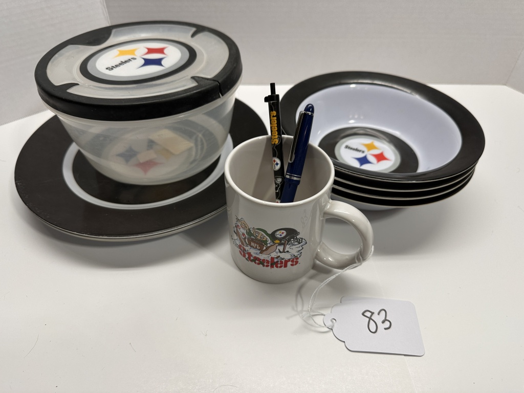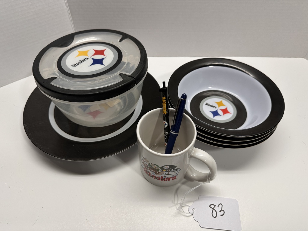 PLATE, BOWLS, COFFEE CUP, AND PENS