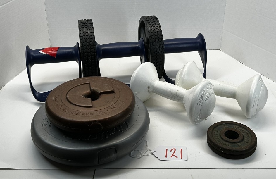 2 ARM WEIGHTS, 3 WEIGHTS FOR DUMBELLS, ARM ROLLER ON WHEELS