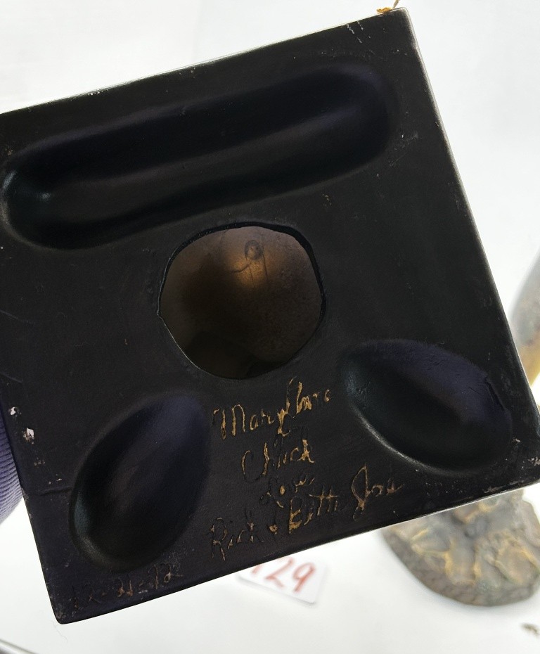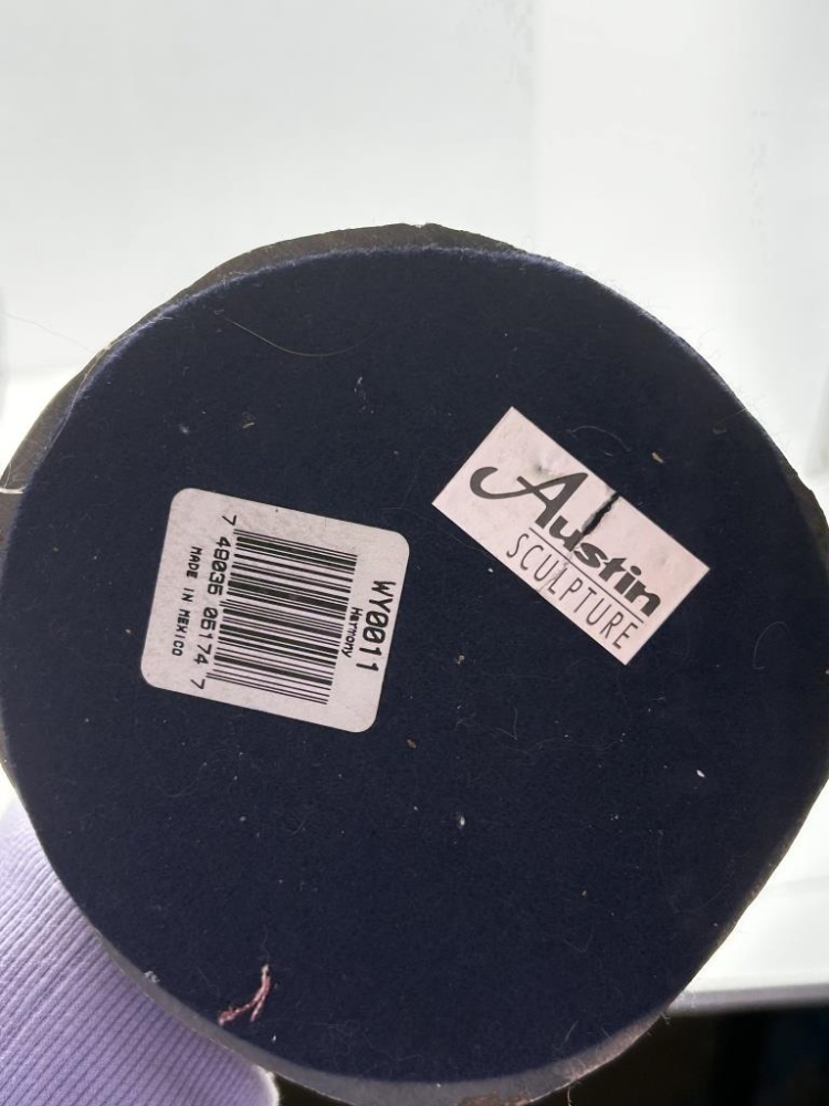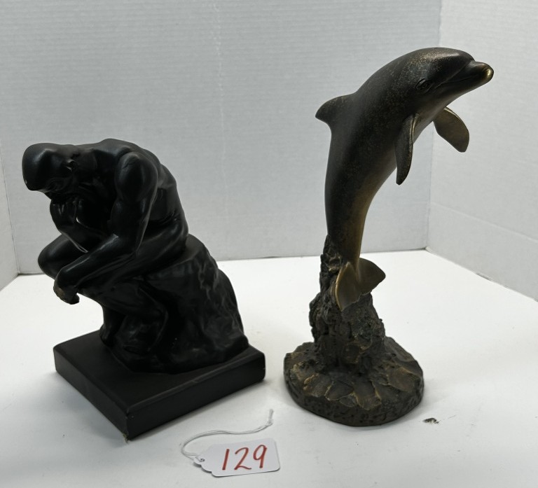 2 STATUES, DOLPHIN, A MAN THINKING WITH WRITING ON BOTTOM