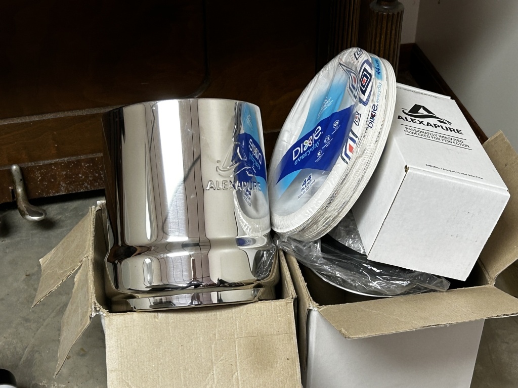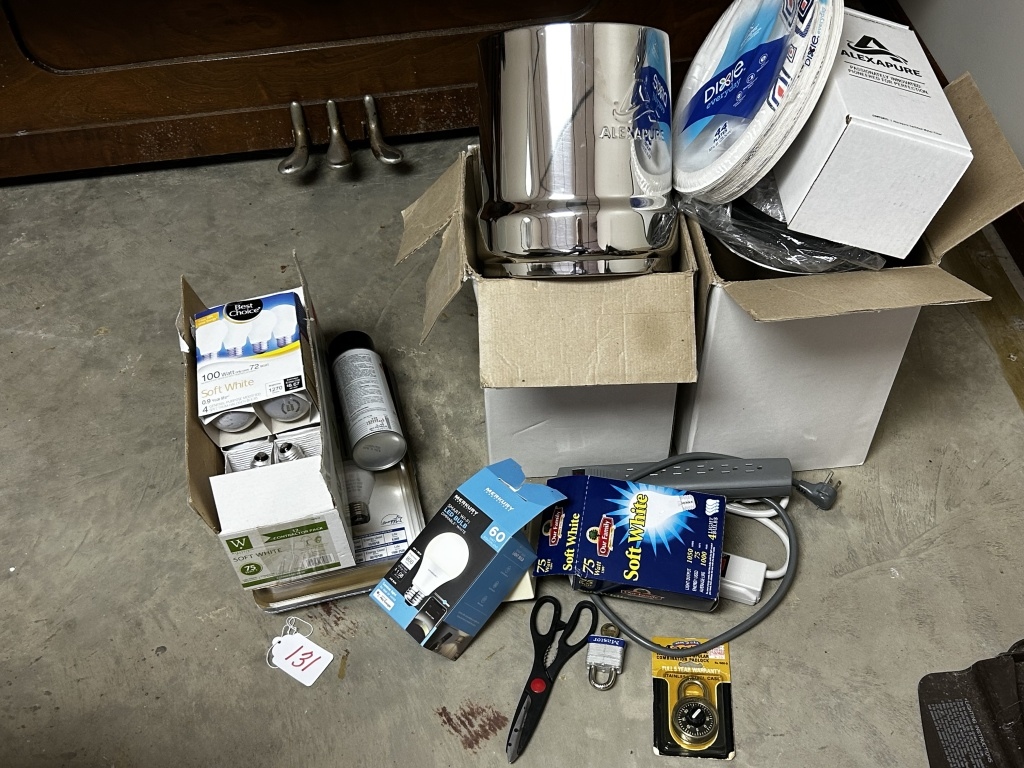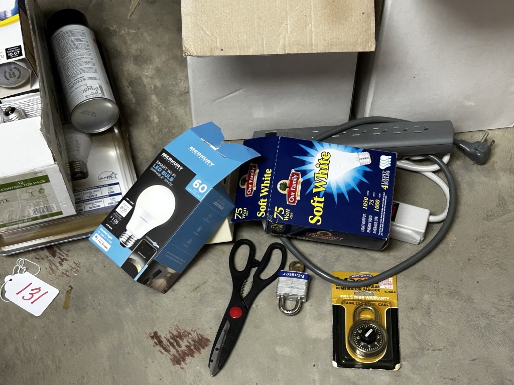 LIGHT BULBS, SOFT WHITE LIGHT BULBS, SCISSORS, PAPER PLATES, POWER STRIPS, LOCK, COMBINATION LOCK, ALEXAPURE