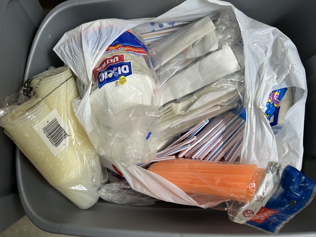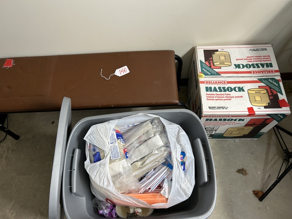 PLASTIC CUTLERY, CUPS, STRAWS, BENCH, HASSOCK PORTABLE CHEMICAL TOILET