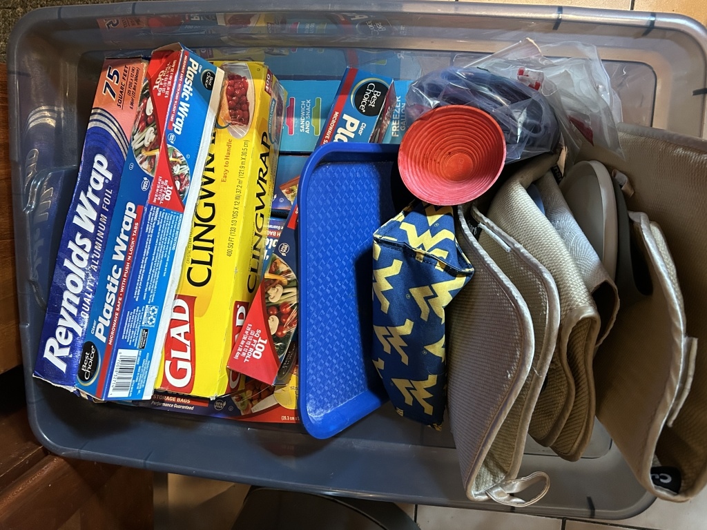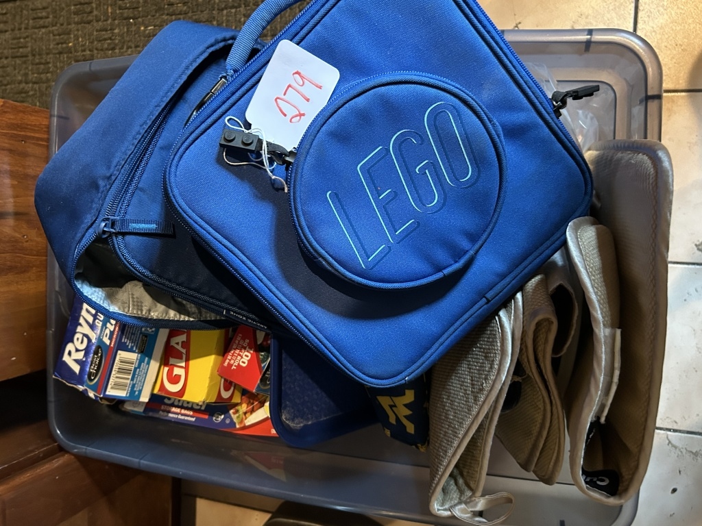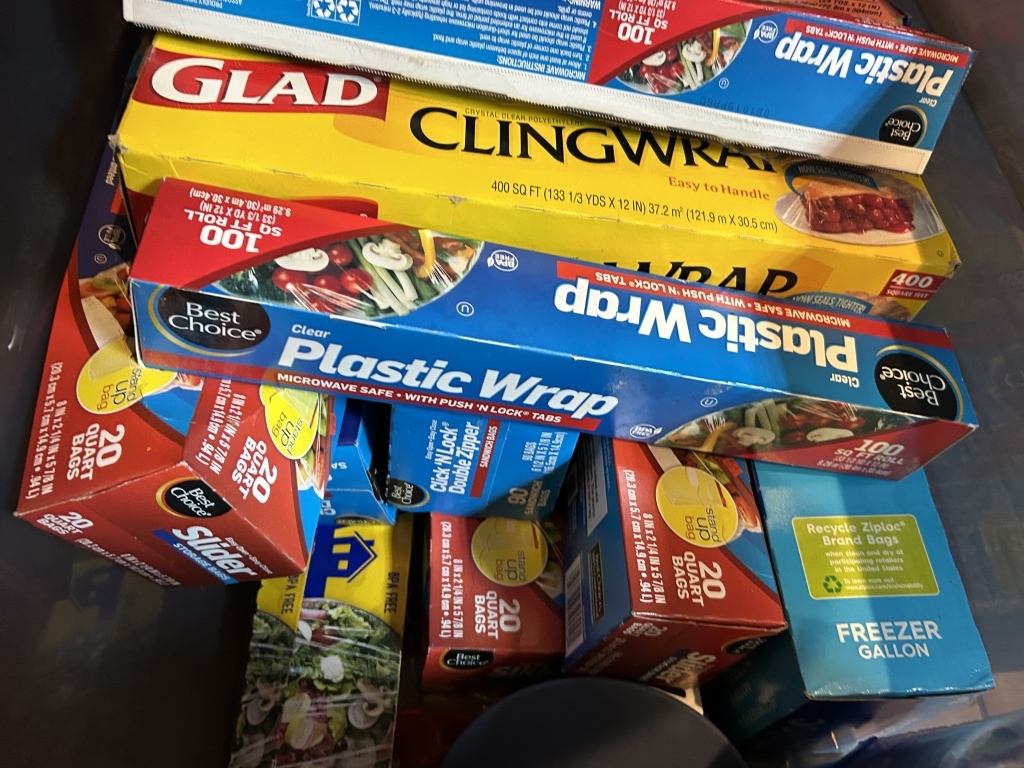 LEGO DUFFLE BAG, REYNOLDS WRAP, PLATIC WRAP, CLINGWRAP, ZIPLOC BAGS, FREEZER GALLON BAGS, TRAY
