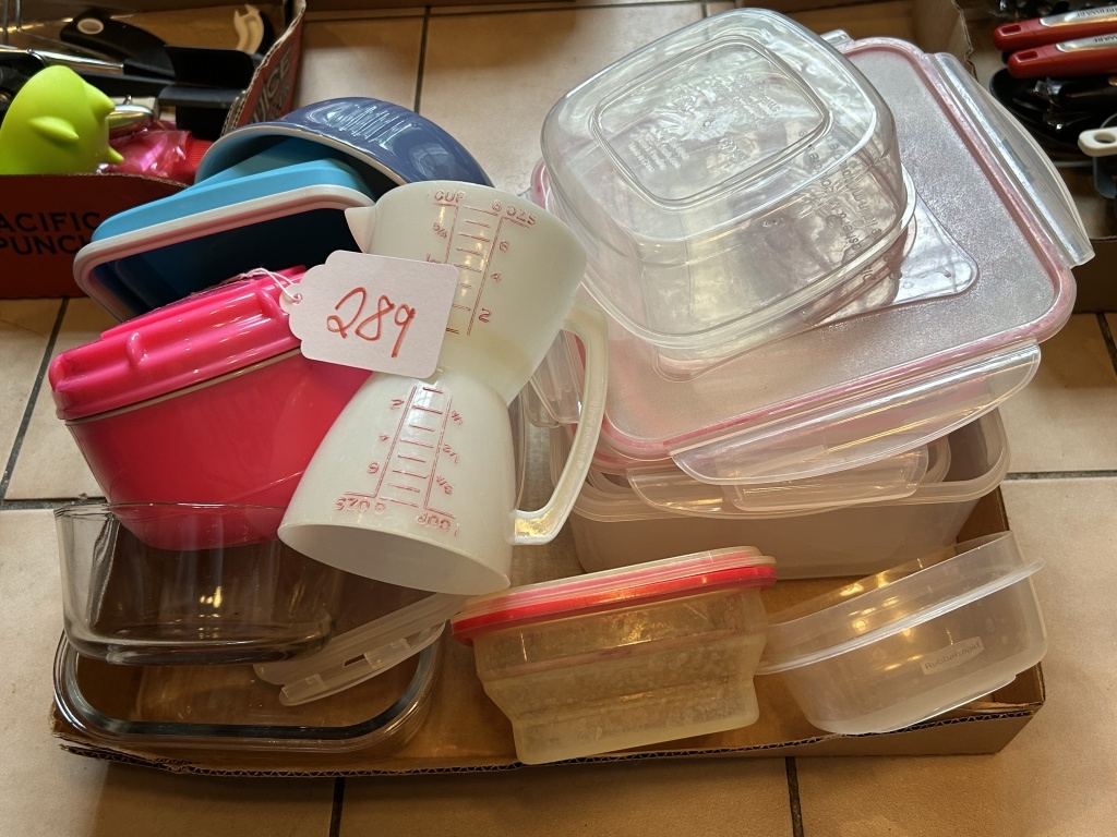 MEASURING CUP, PAULA DEEN GLASS BOWL, RUBBERMAID REUSIBLE CONTAINERS, ETC