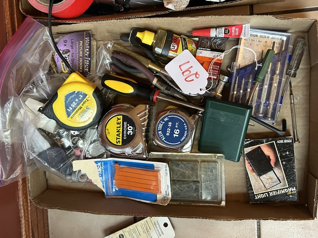 TAPE MEASURES, PUTTY, SCREWDRIVERS, SUPER GLUE, NAILS, HOOKS