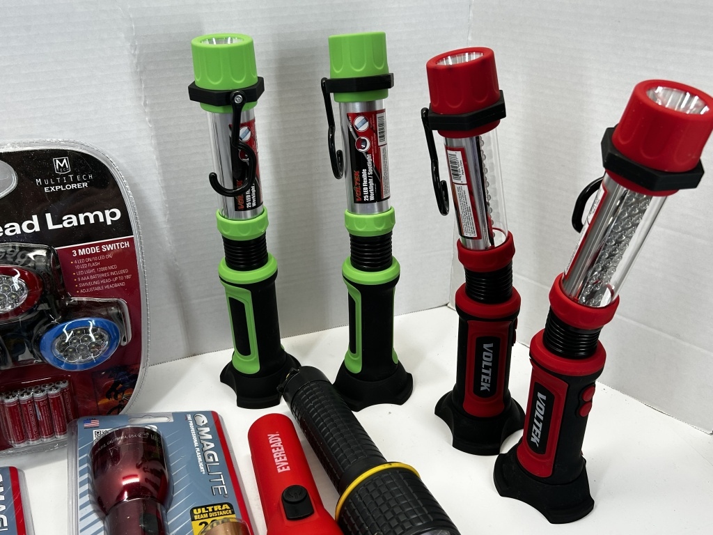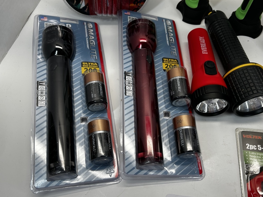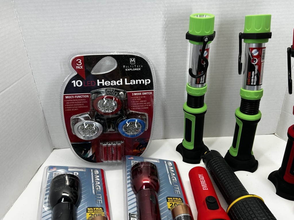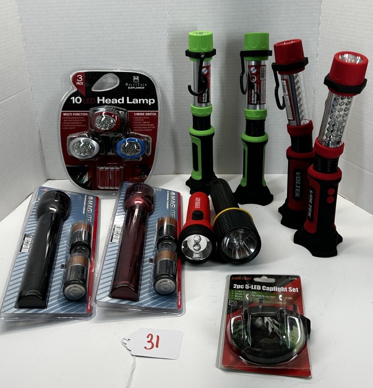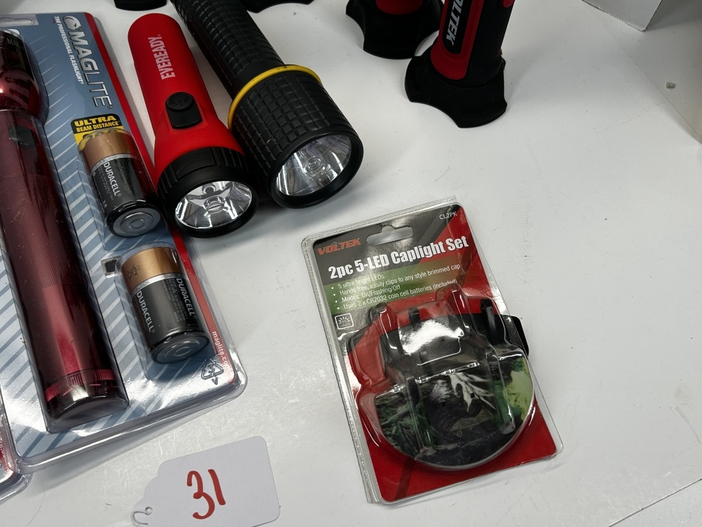 2 BIG FLASHLIGHTS WITH BATTERIES, 3 PACK HEAD LAMP, 4 VOLTEX LIGHTS, 1 2PC 5-LED CAPLIGHT SET