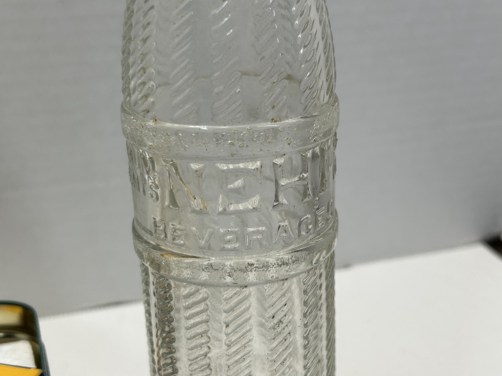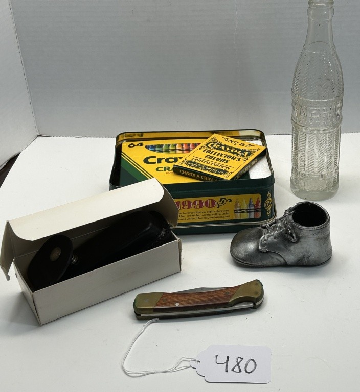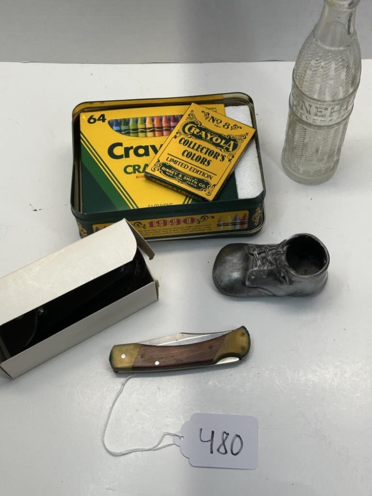 OLD GLASS BOTTLE, CRAYONS, PEN KNIVES