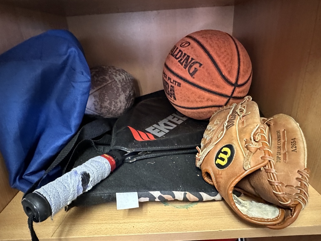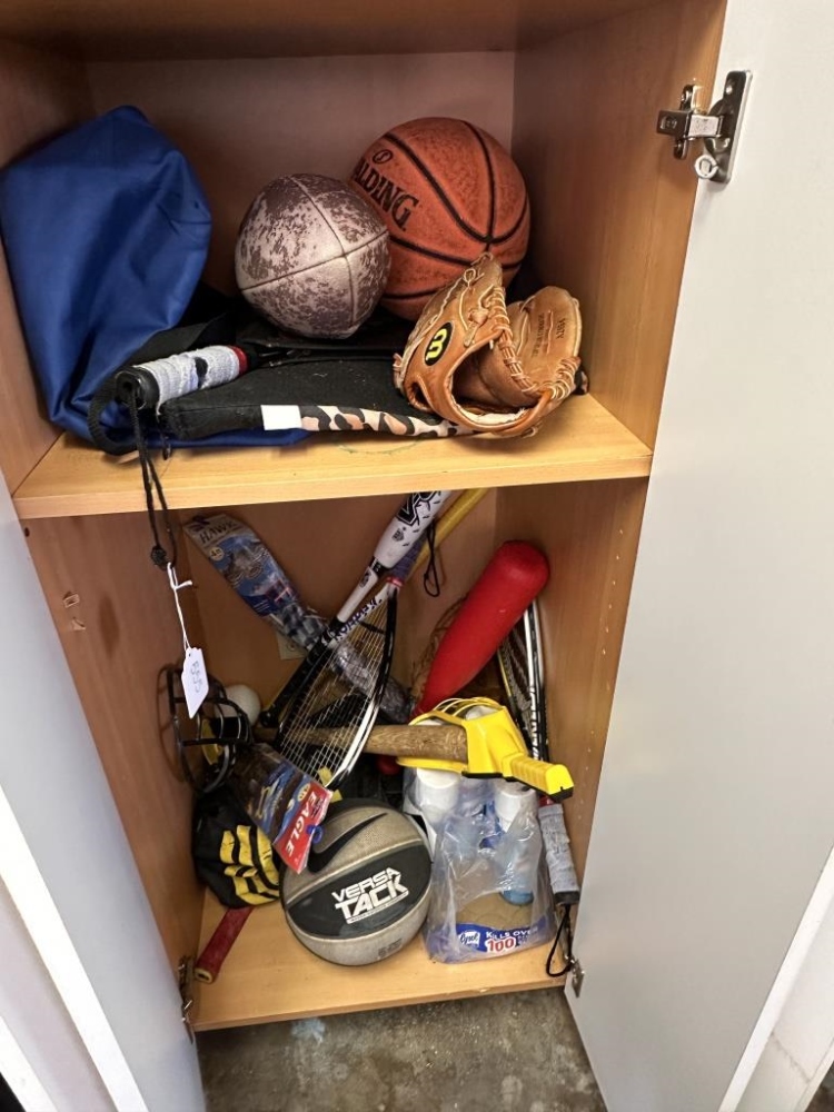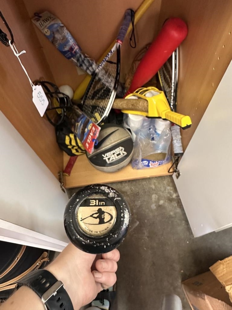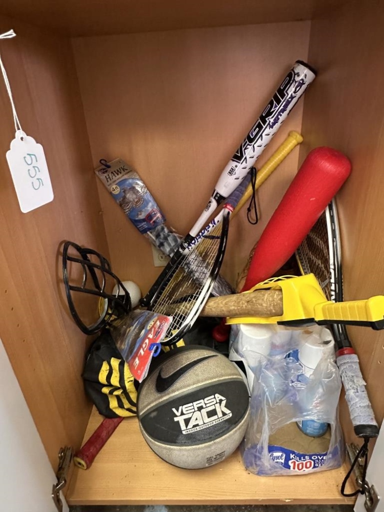 BASKETBALLS, RACKETS, FOOTBALL, BASEBALL BATS, LYSOL, ETC