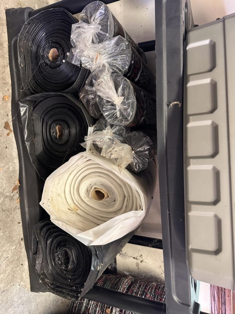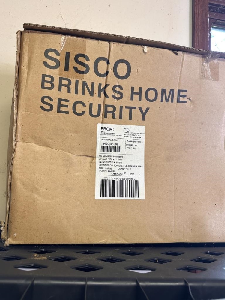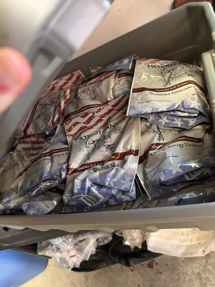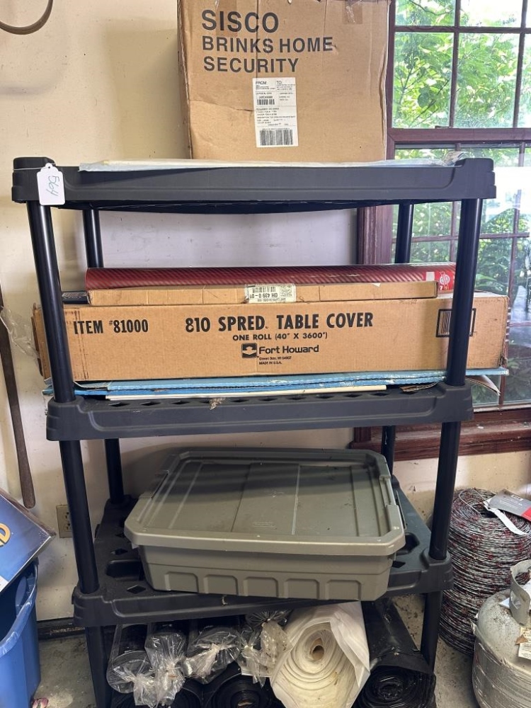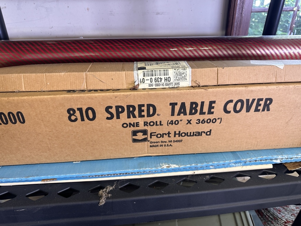 SISCO BRINKS HOME SECURITY, TABLE COVER, BIN OF PATRIOT PANTRY FOOD PACKETS, ROLLS OF UNDERLAYMENT FOR FLOORING